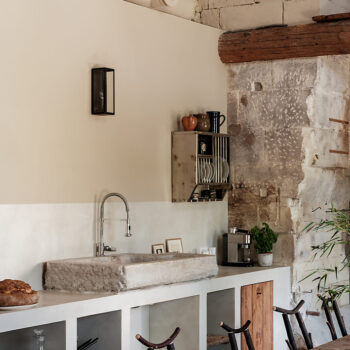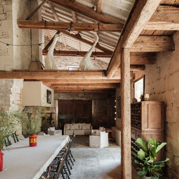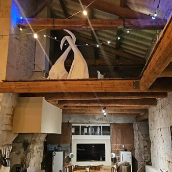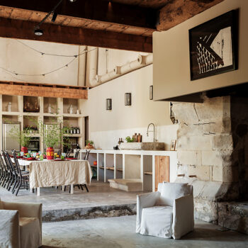 carrelage/tomettes, hauteur sous plafond, cheminée, cuisine ouverte, sol béton