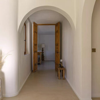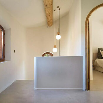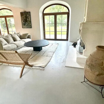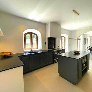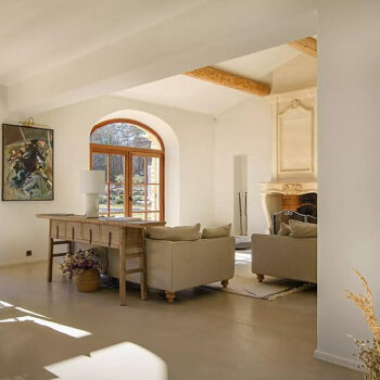 murs peints / tapisseries, parquet, carrelage/tomettes, hauteur sous plafond, cuisine ouverte, baie vitrée, sol béton, pierre