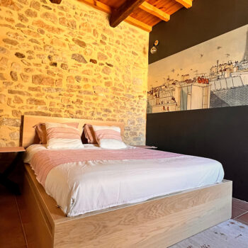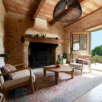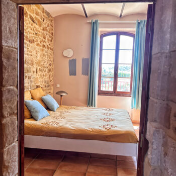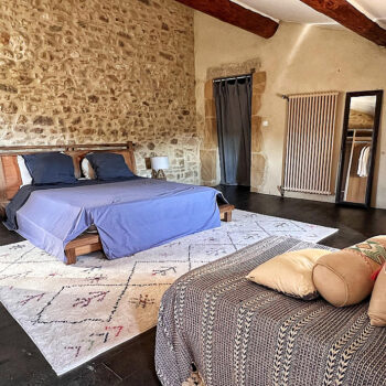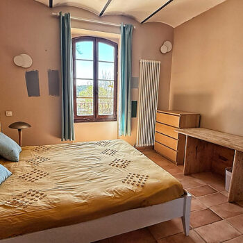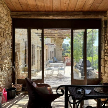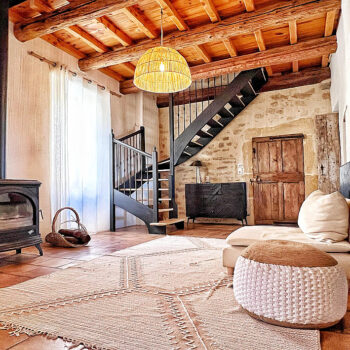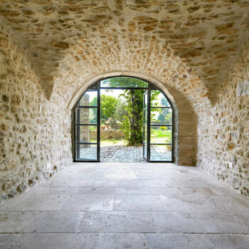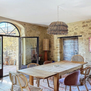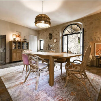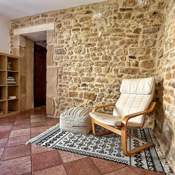 pierre, baie vitrée, cheminée, hauteur sous plafond, carrelage/tomettes, parquet, murs peints / tapisseries