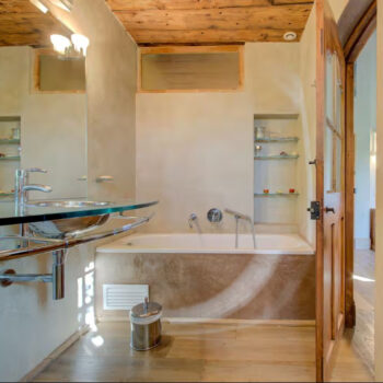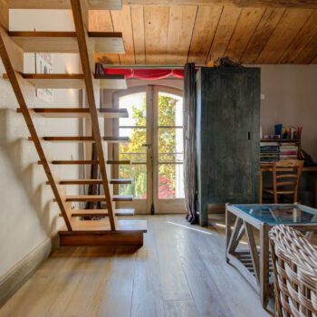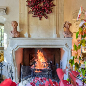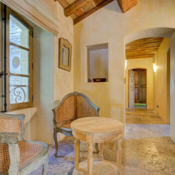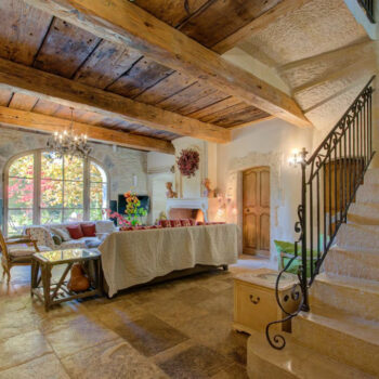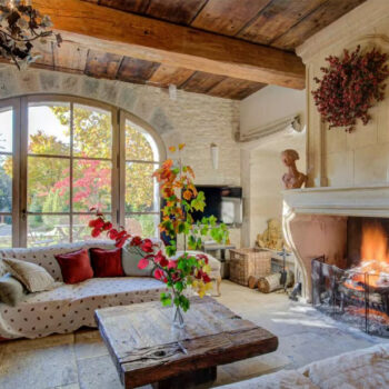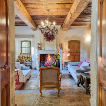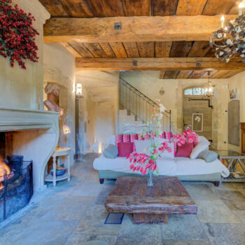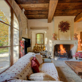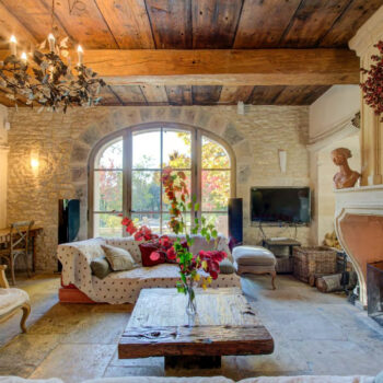 pierre, baie vitrée, cheminée, hauteur sous plafond, parquet, murs peints / tapisseries