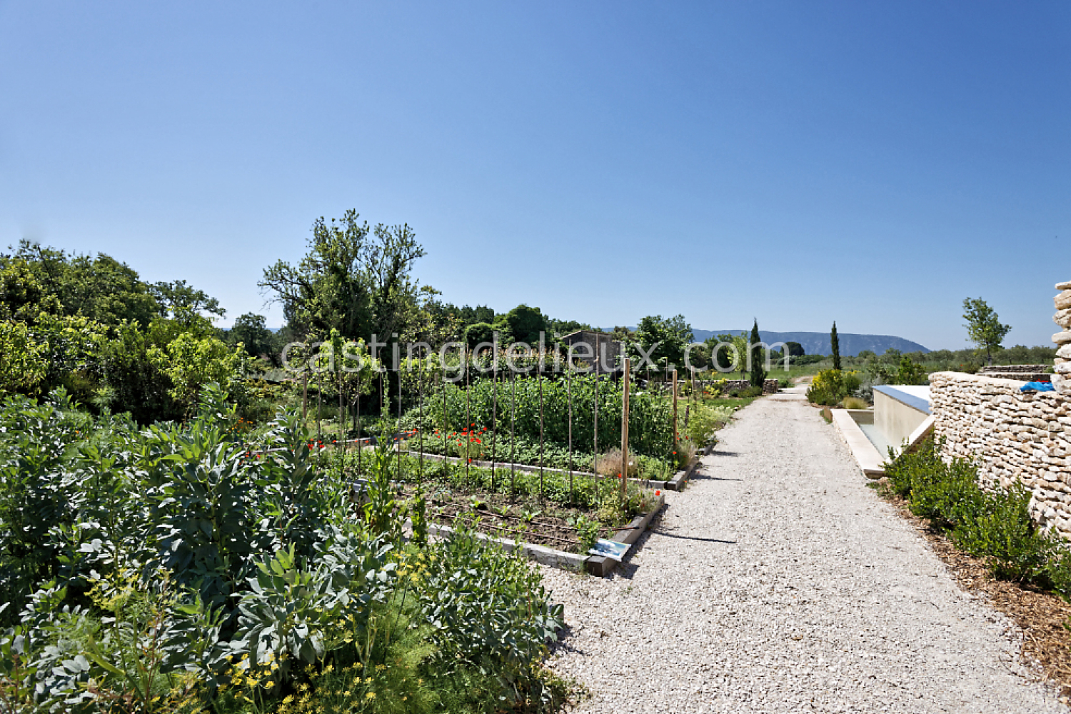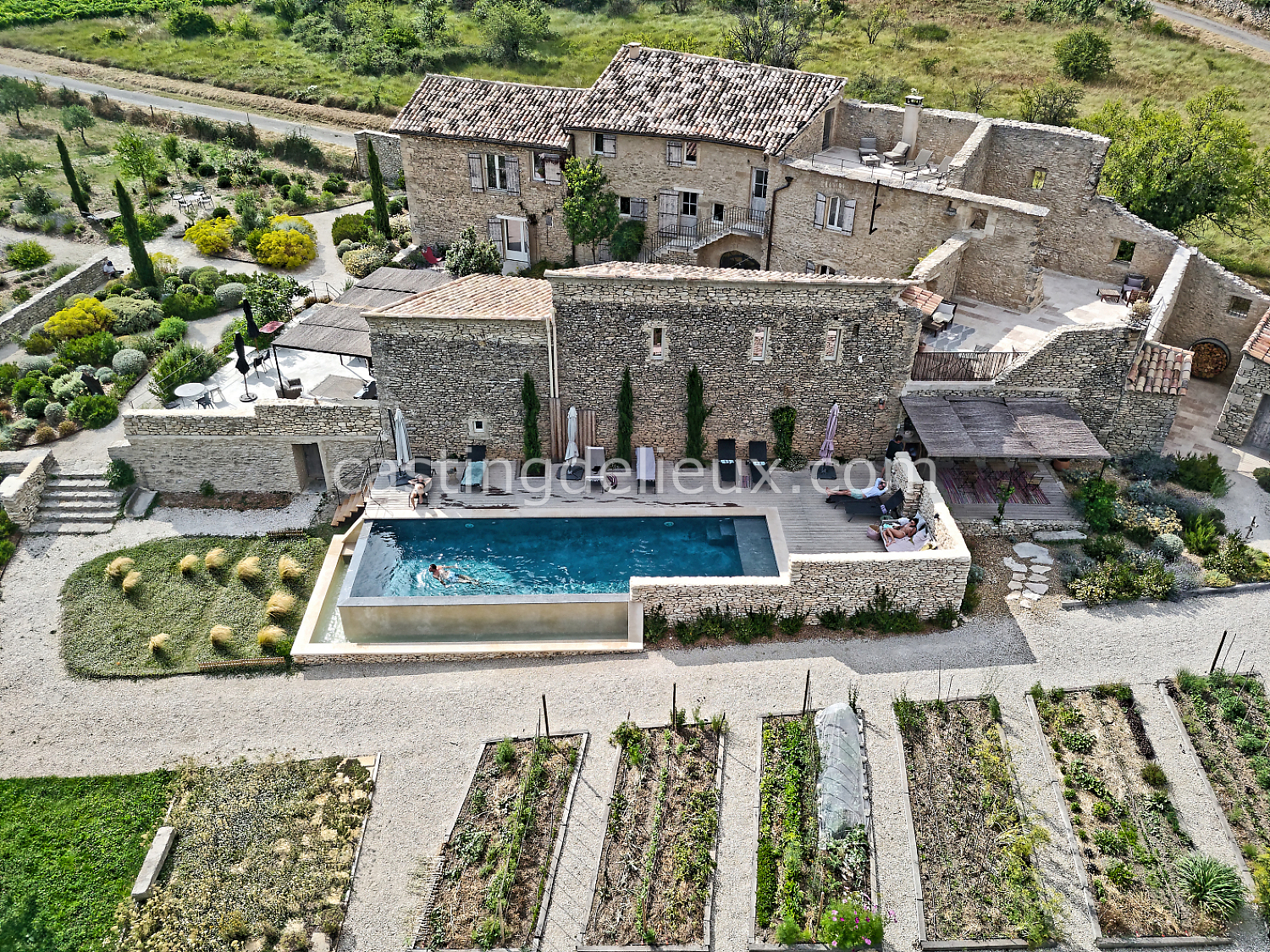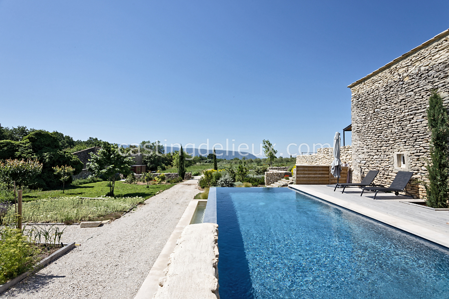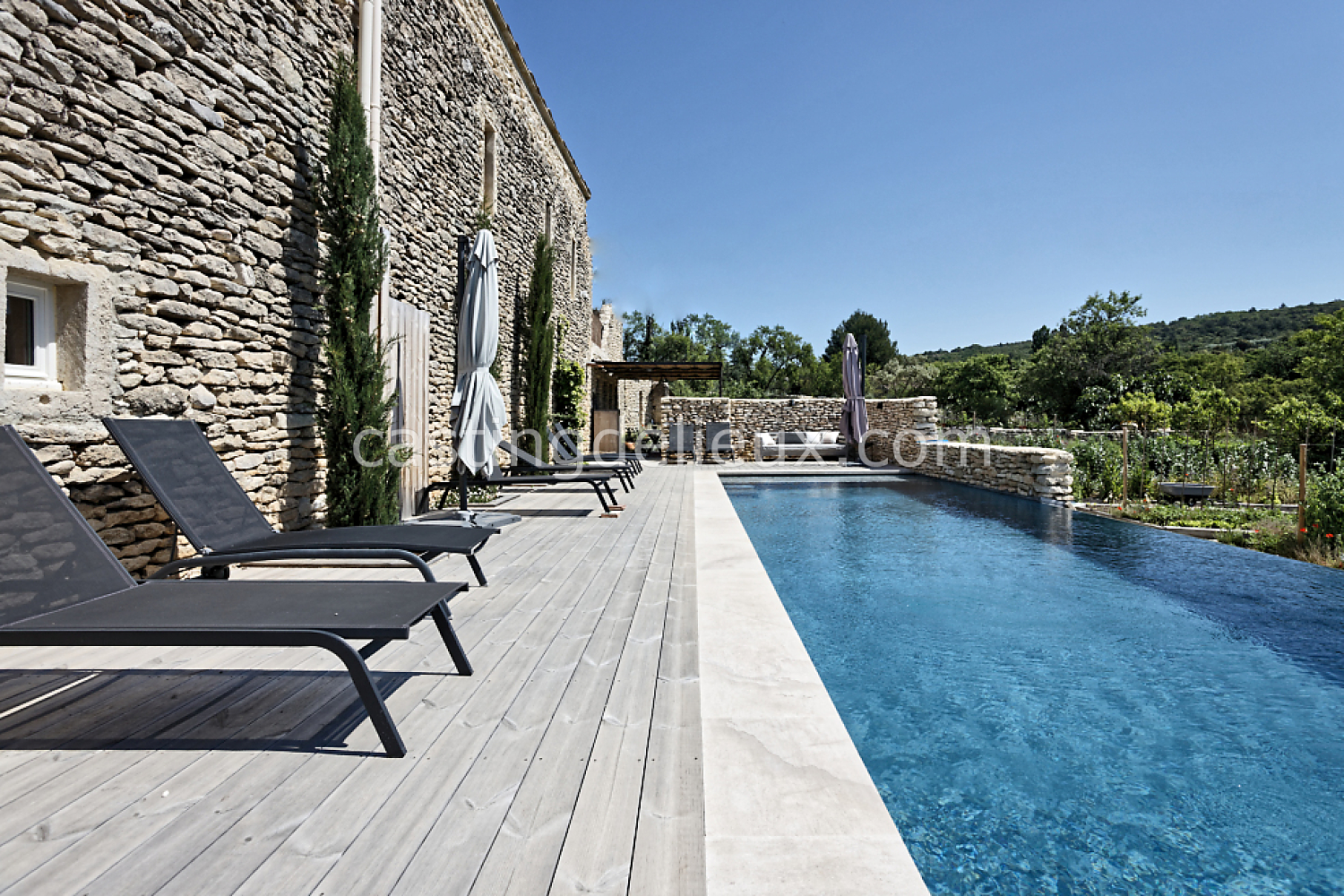 Mur de pierre, Piscine à débordement, Cour intérieure / Patio, Prairie / champ, Jardins potagers / vergers, Terrasse bois, Rooftop / toit-terrasse