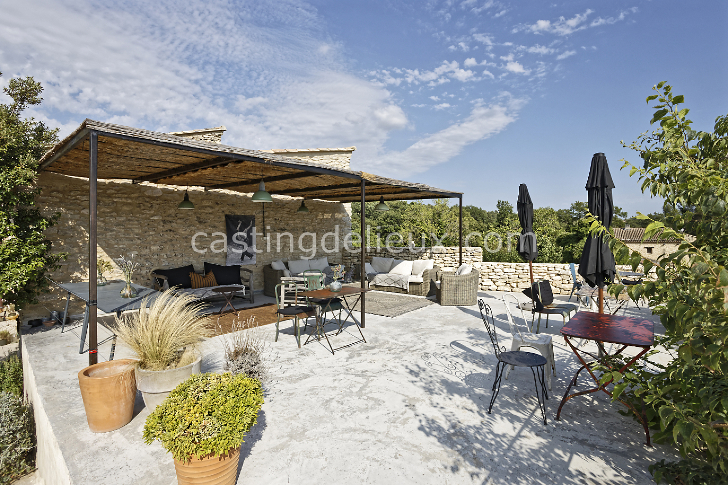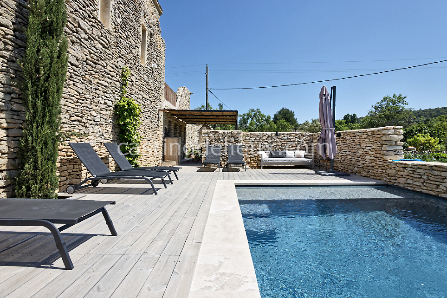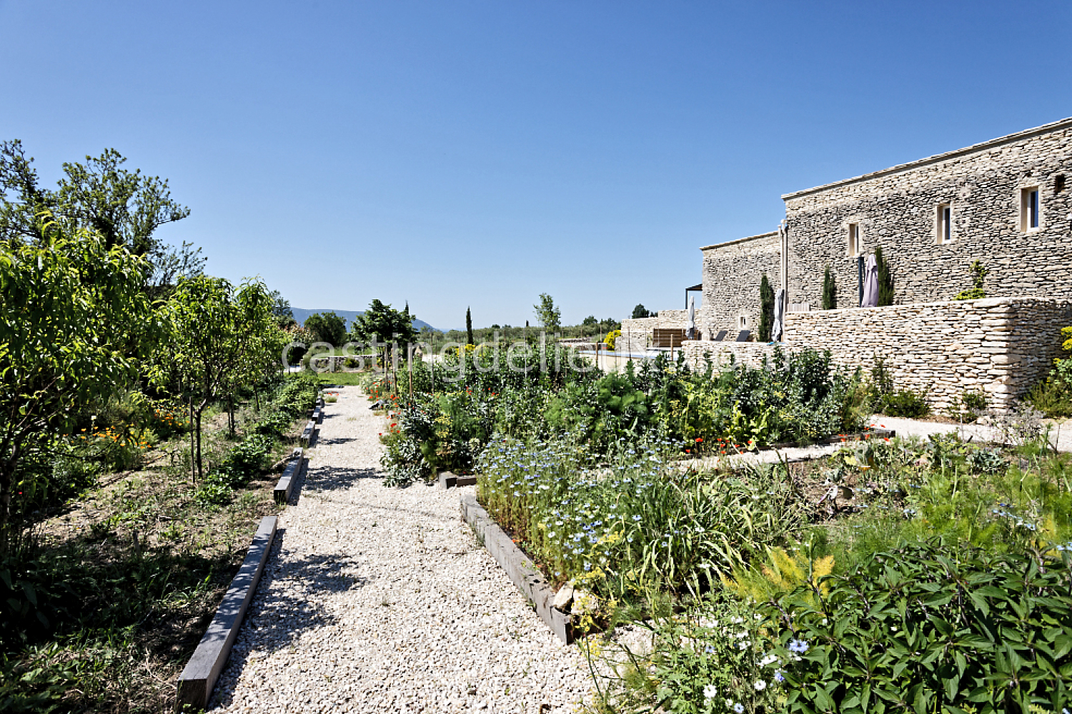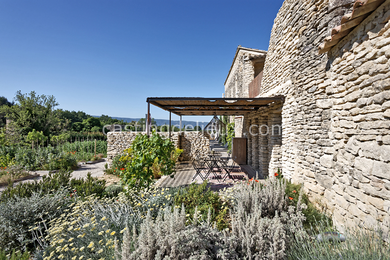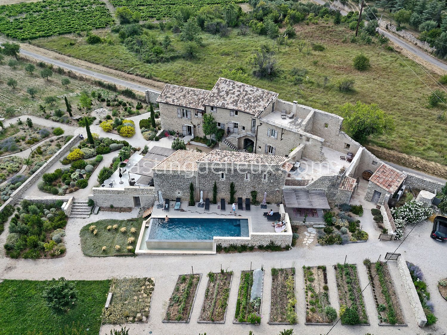 Mur de pierre, Piscine à débordement, Cour intérieure / Patio, Prairie / champ, Jardins potagers / vergers, Terrasse bois, Rooftop / toit-terrasse