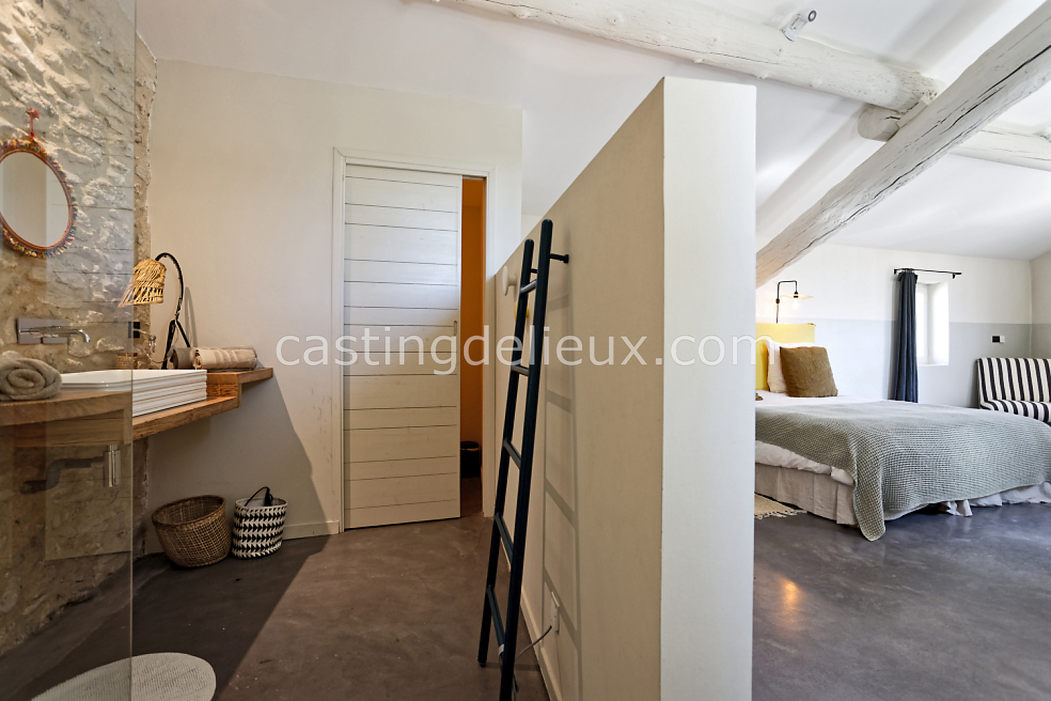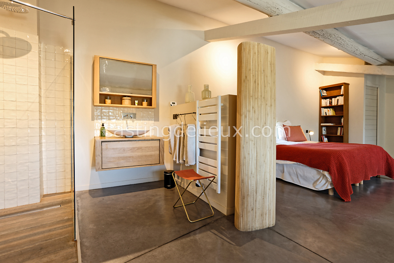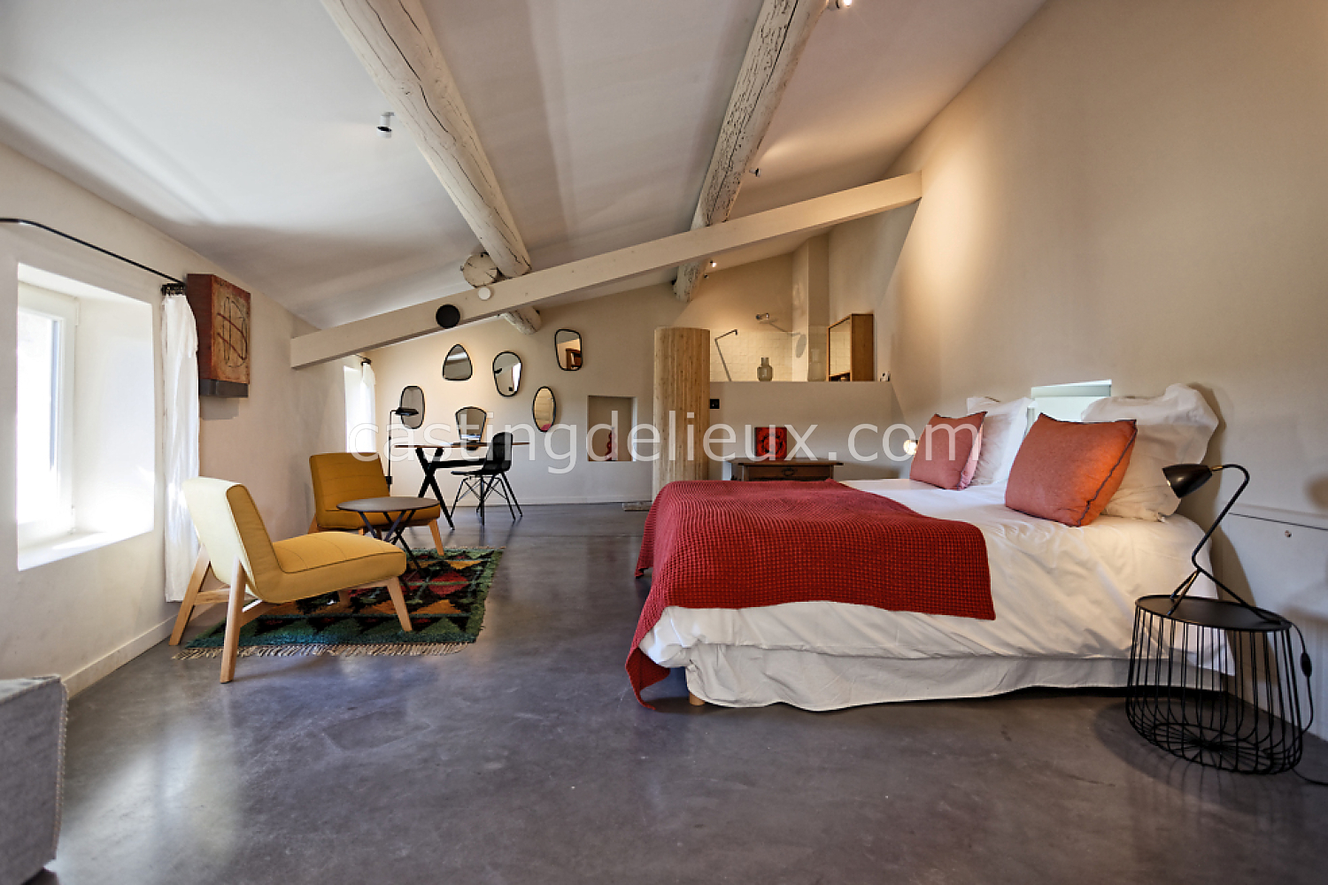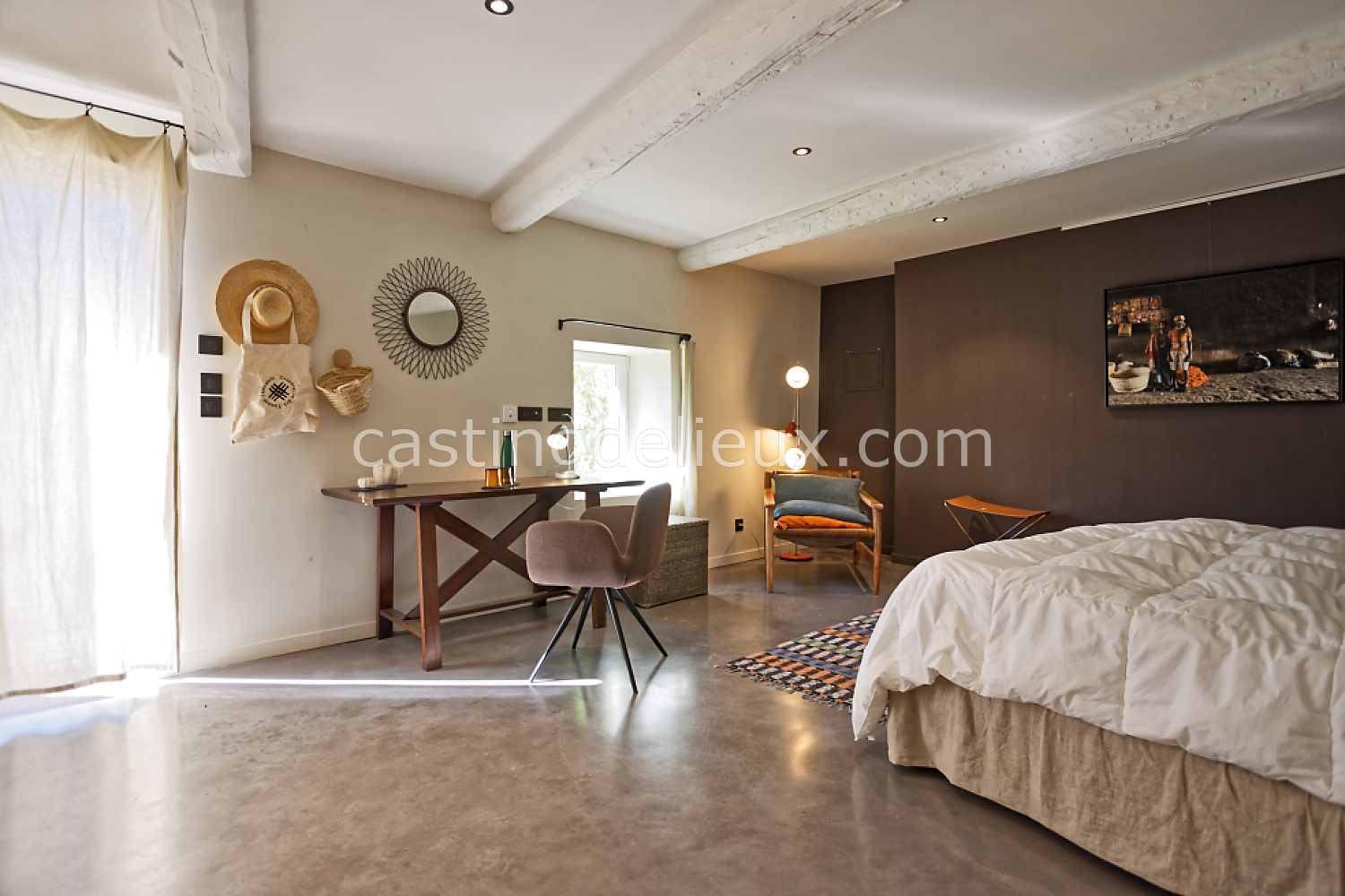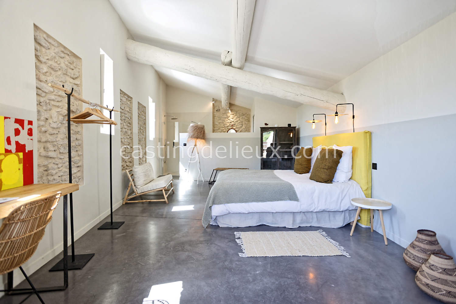 Béton cirée, Sol bois / parquet, Murs blancs / Enduits naturels, Tomettes / carrelage ancien, Cheminée, Charpente / poutres apparente, Déco vintage