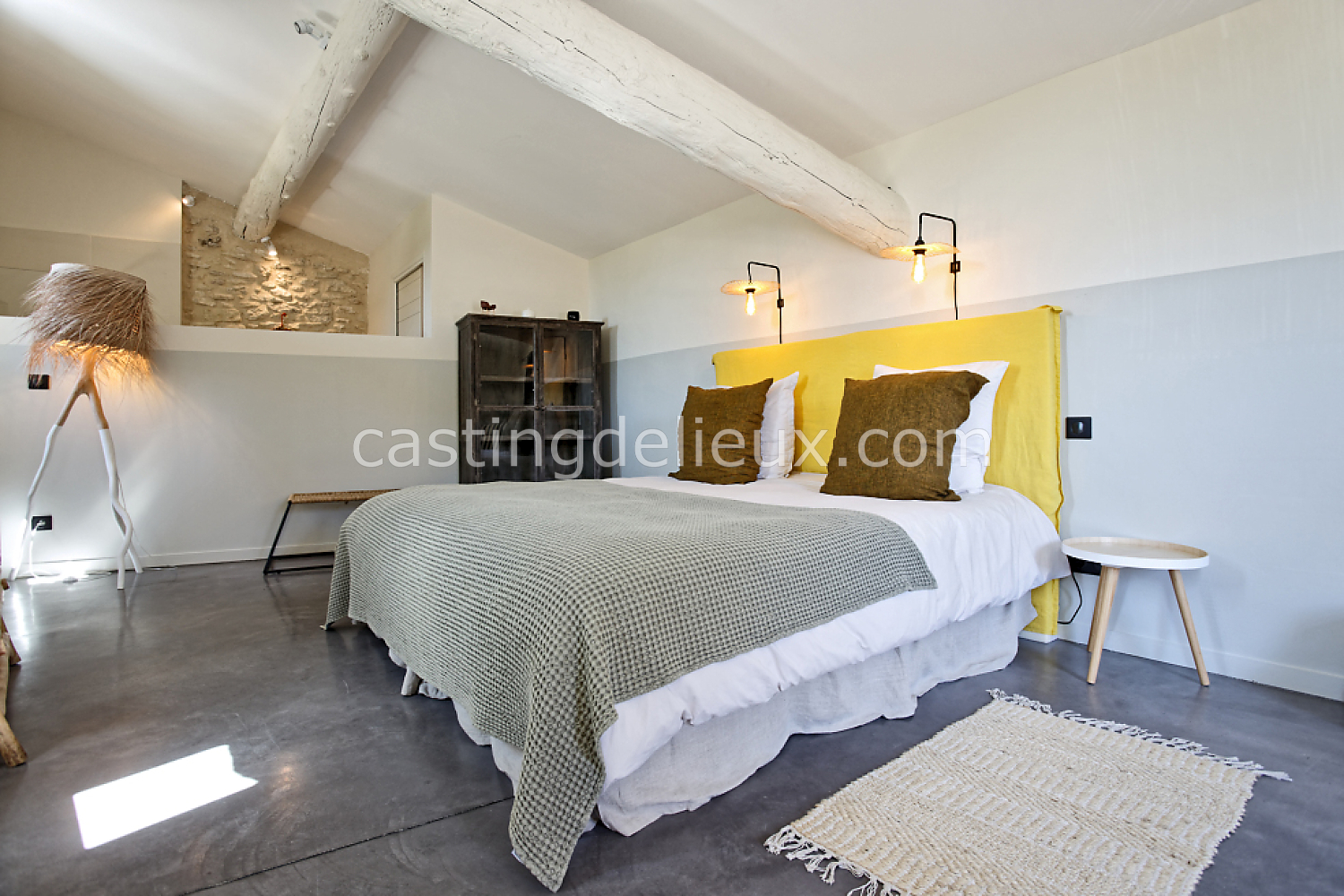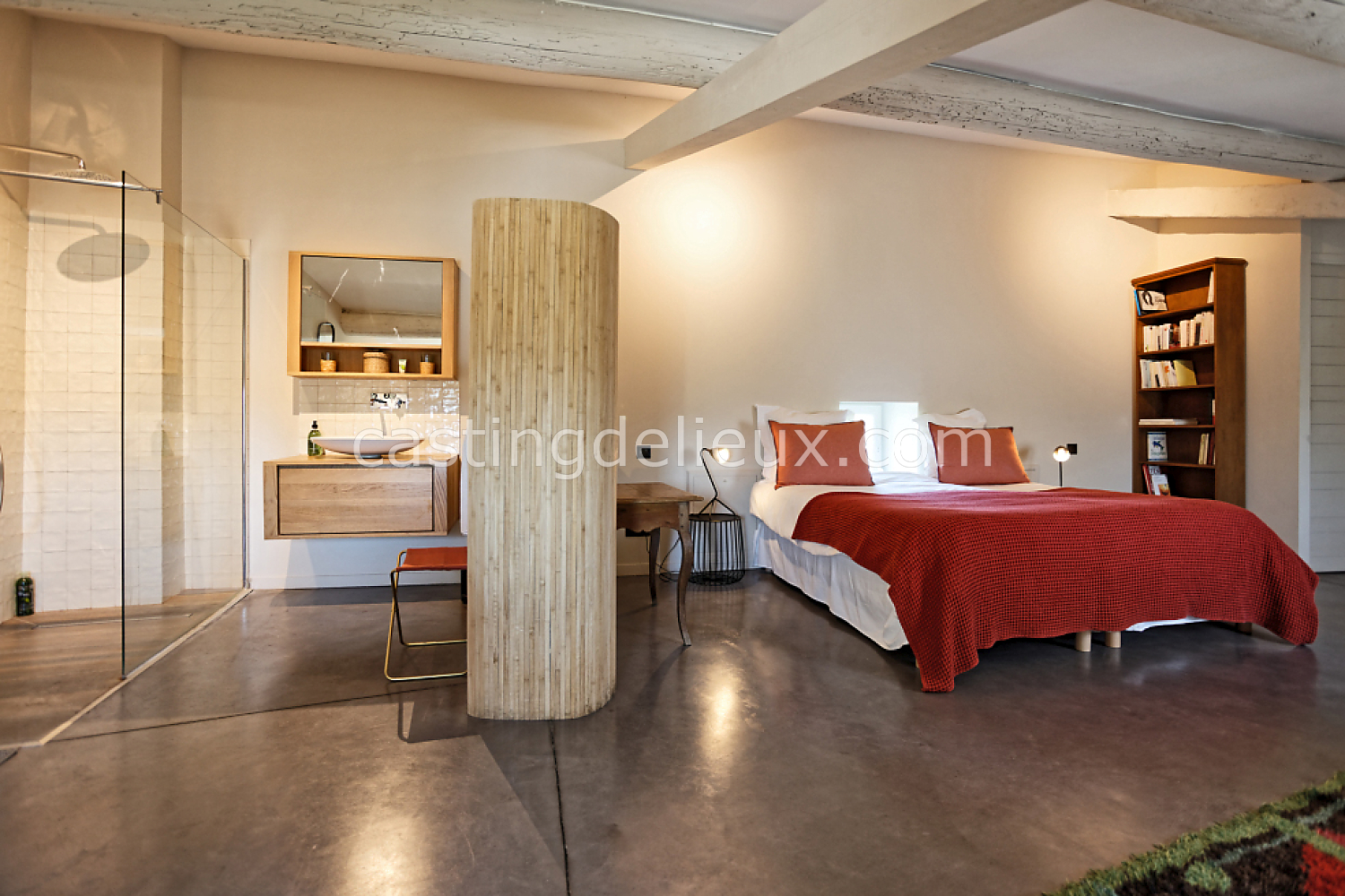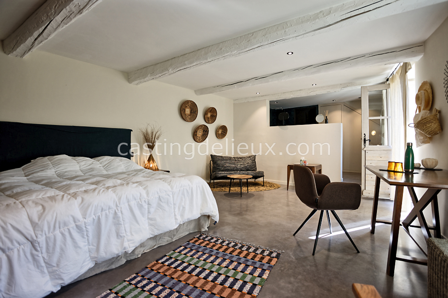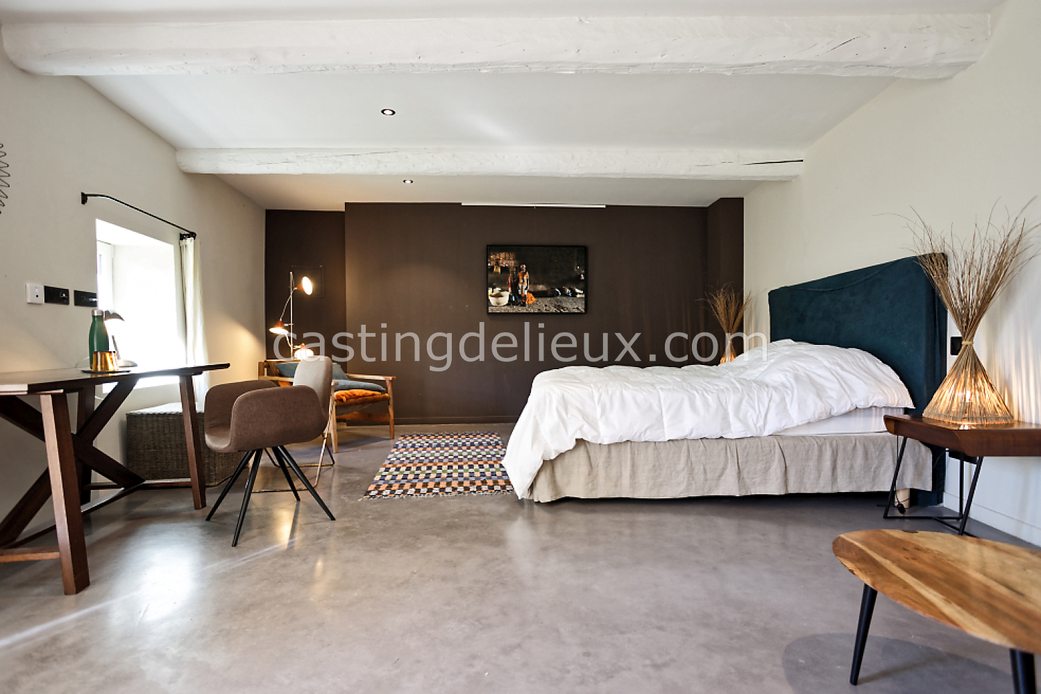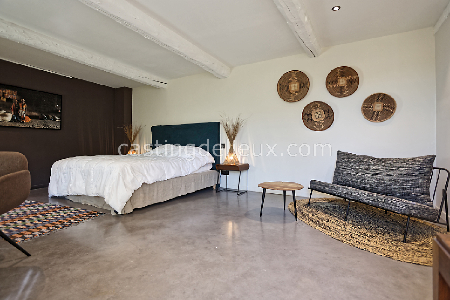 Béton cirée, Sol bois / parquet, Murs blancs / Enduits naturels, Tomettes / carrelage ancien, Cheminée, Charpente / poutres apparente, Déco vintage