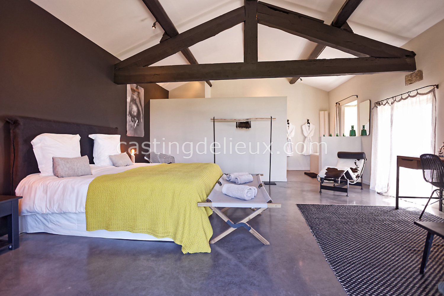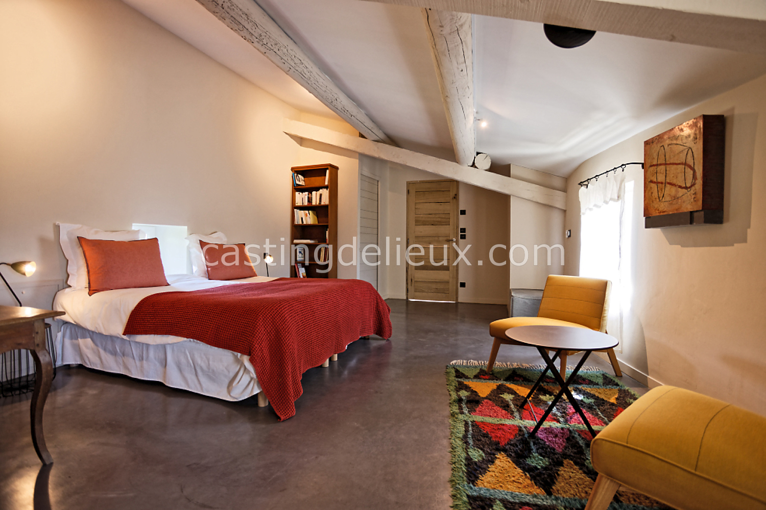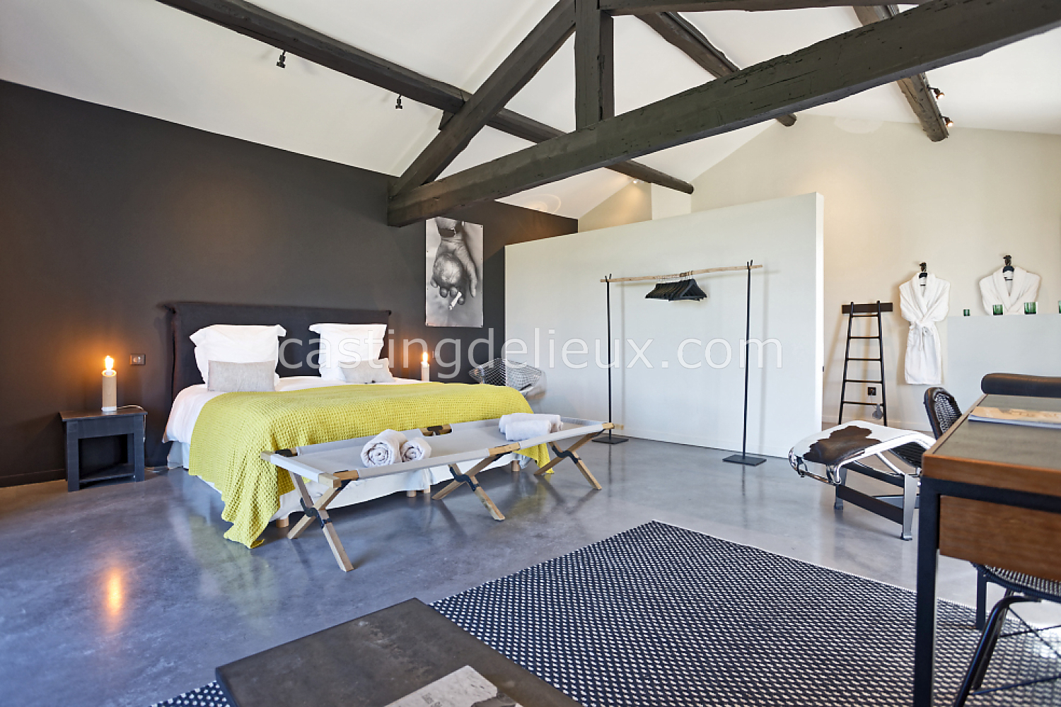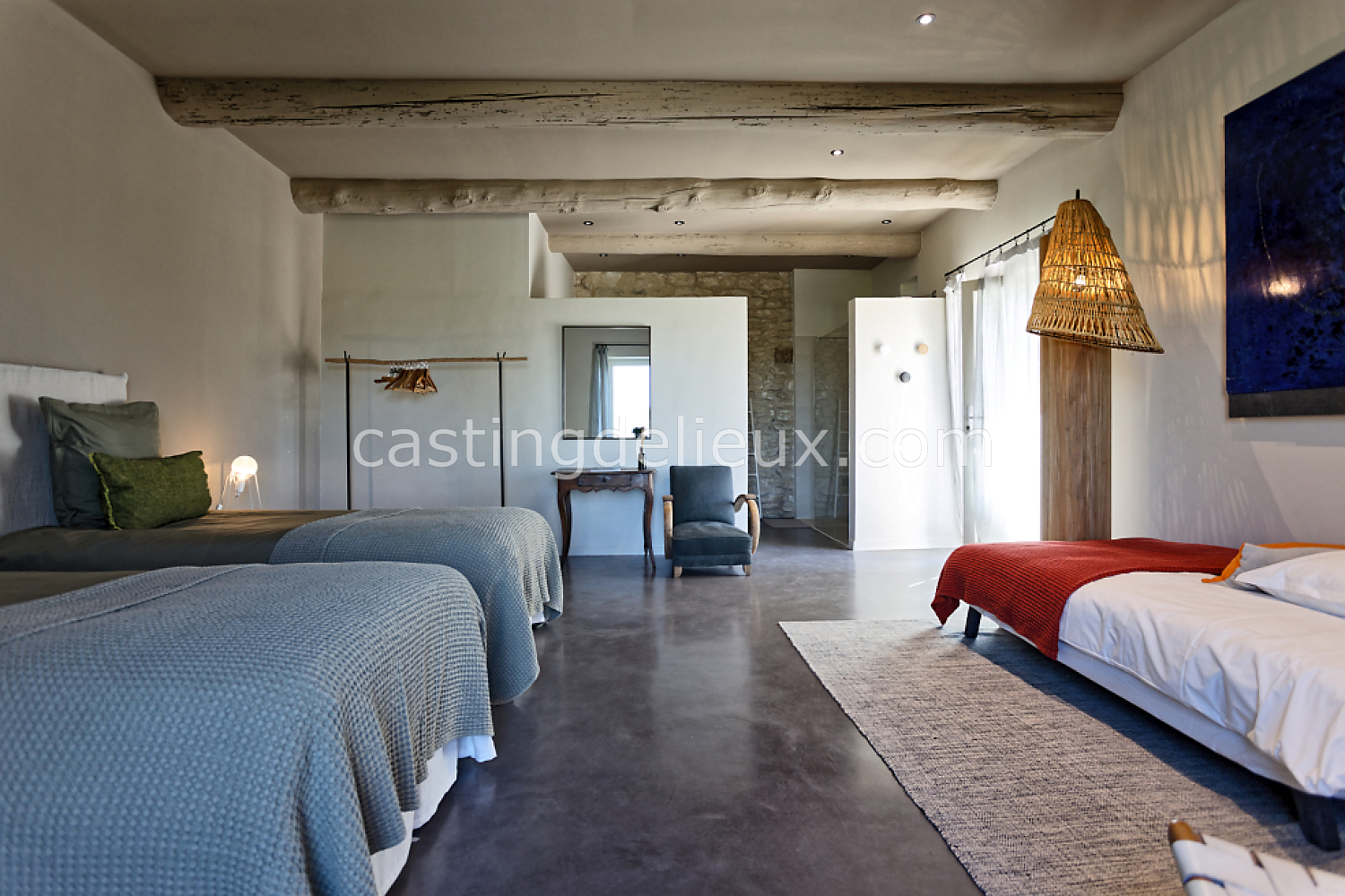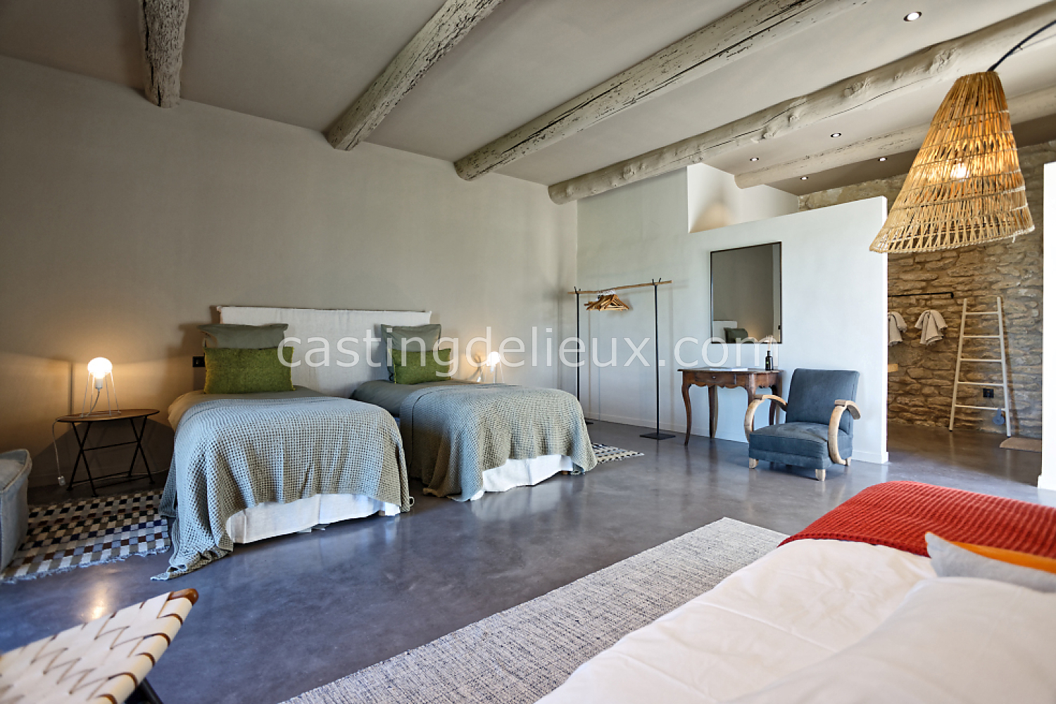 Béton cirée, Sol bois / parquet, Murs blancs / Enduits naturels, Tomettes / carrelage ancien, Cheminée, Charpente / poutres apparente, Déco vintage
