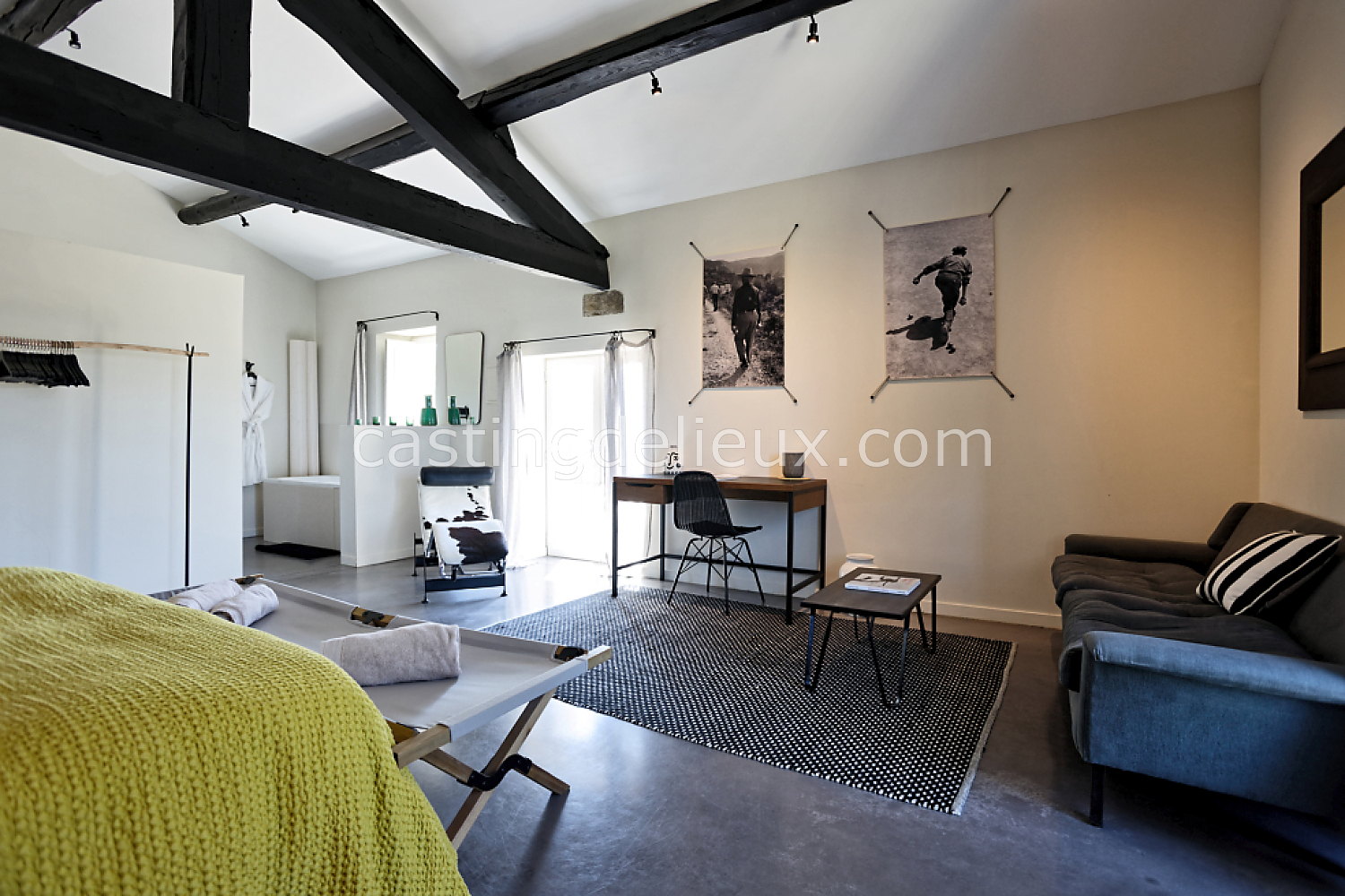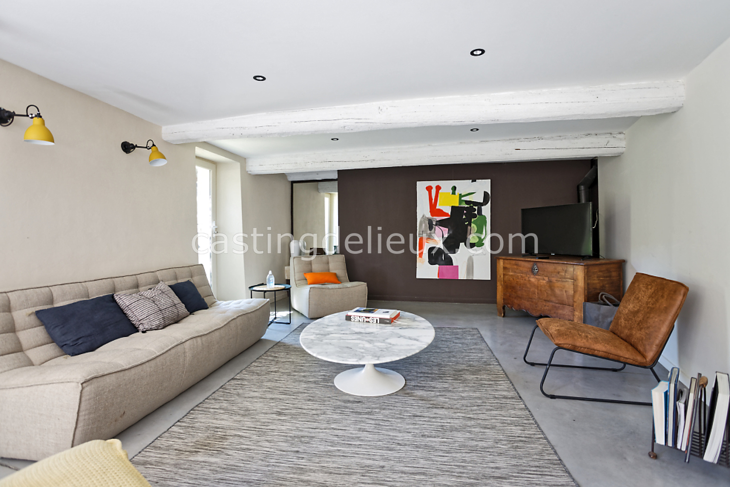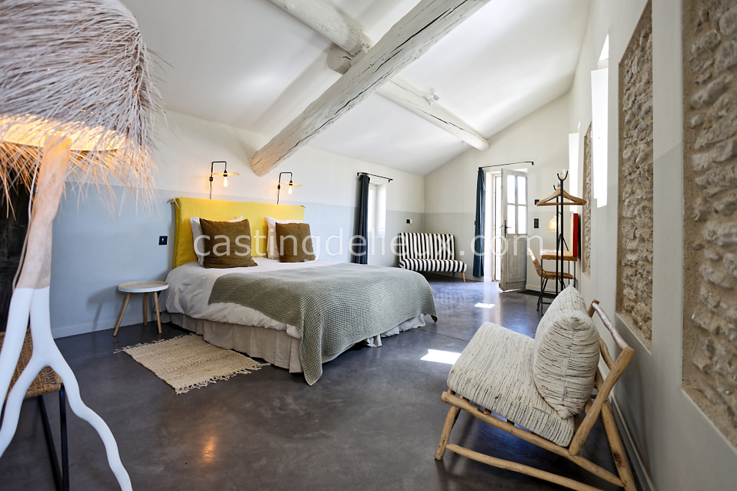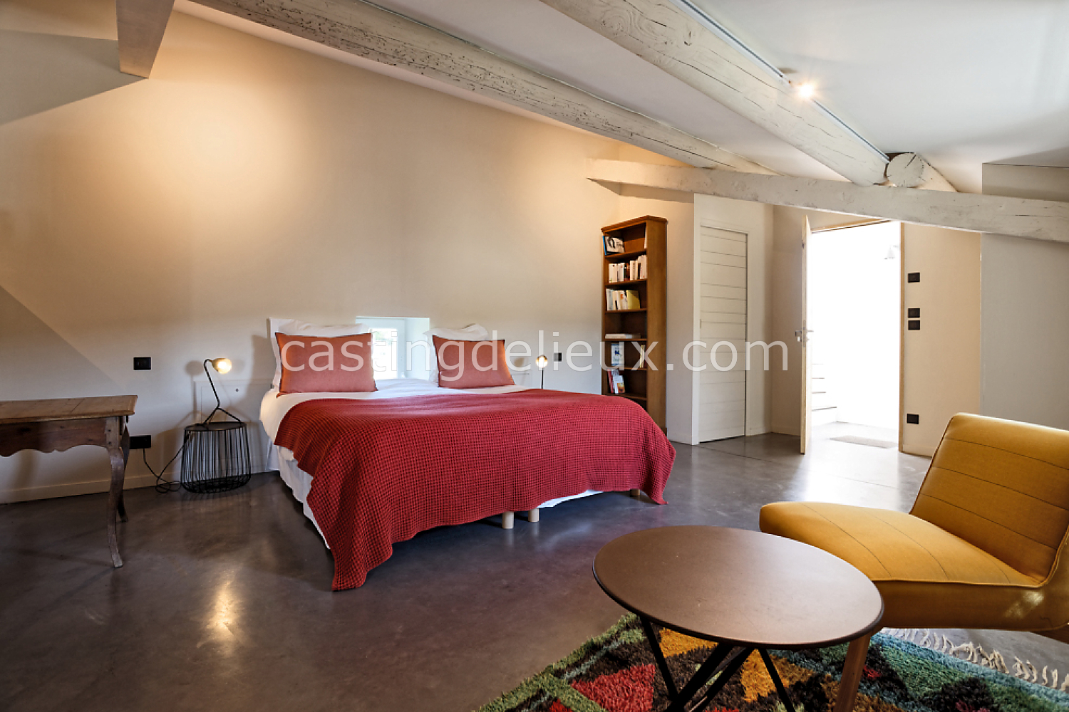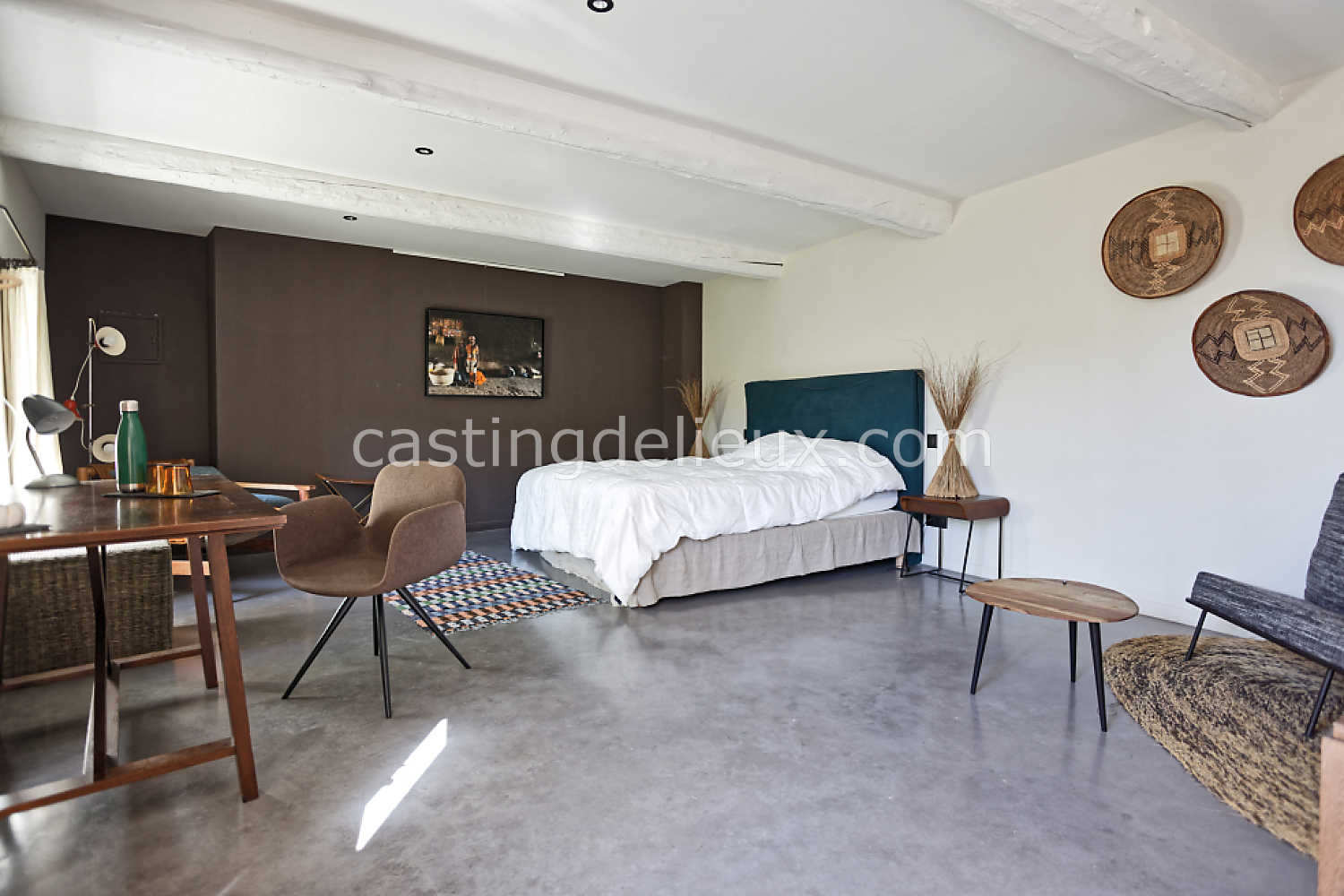 Béton cirée, Sol bois / parquet, Murs blancs / Enduits naturels, Tomettes / carrelage ancien, Cheminée, Charpente / poutres apparente, Déco vintage
