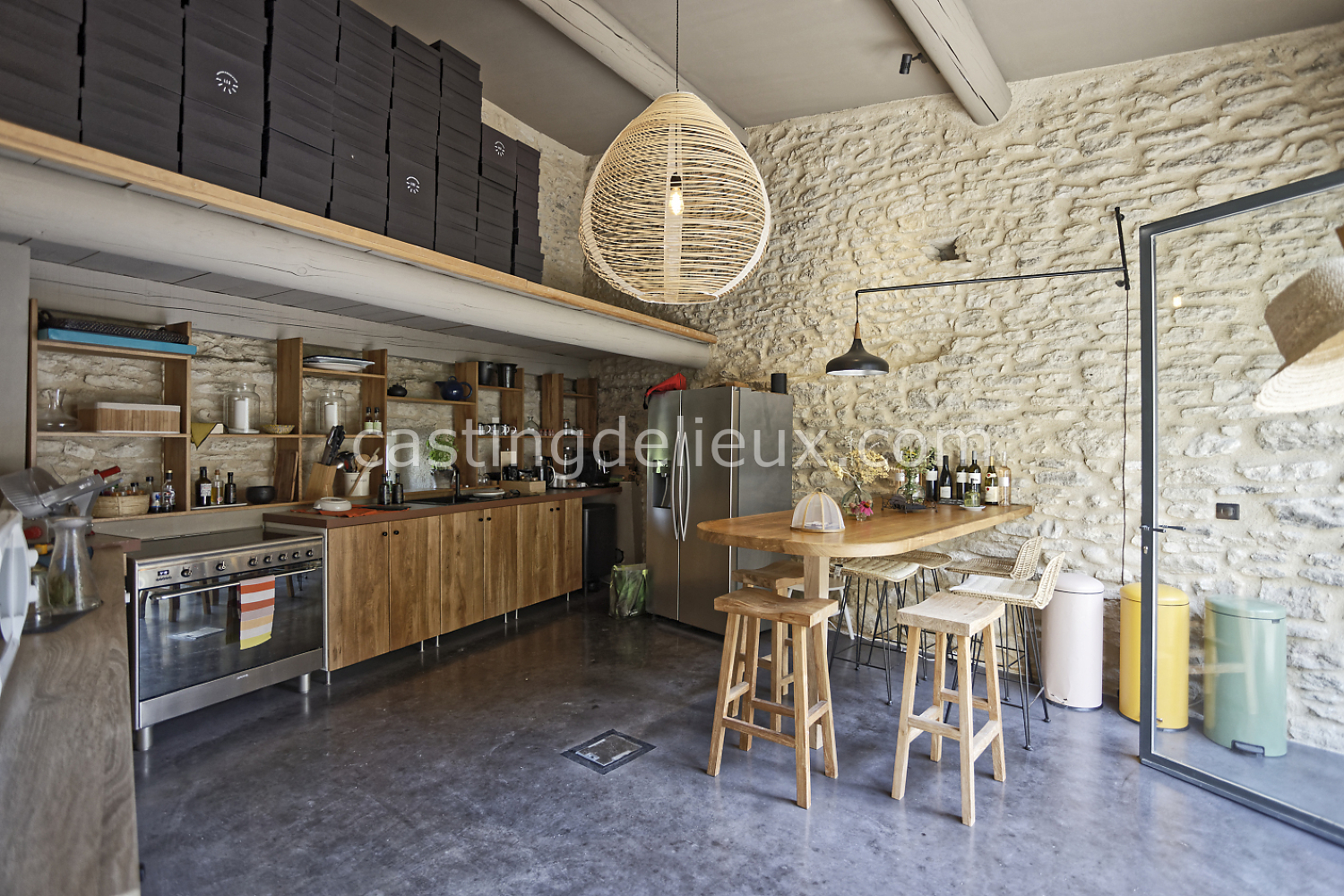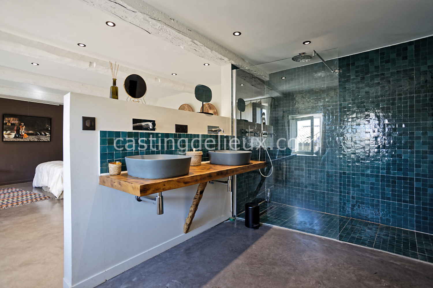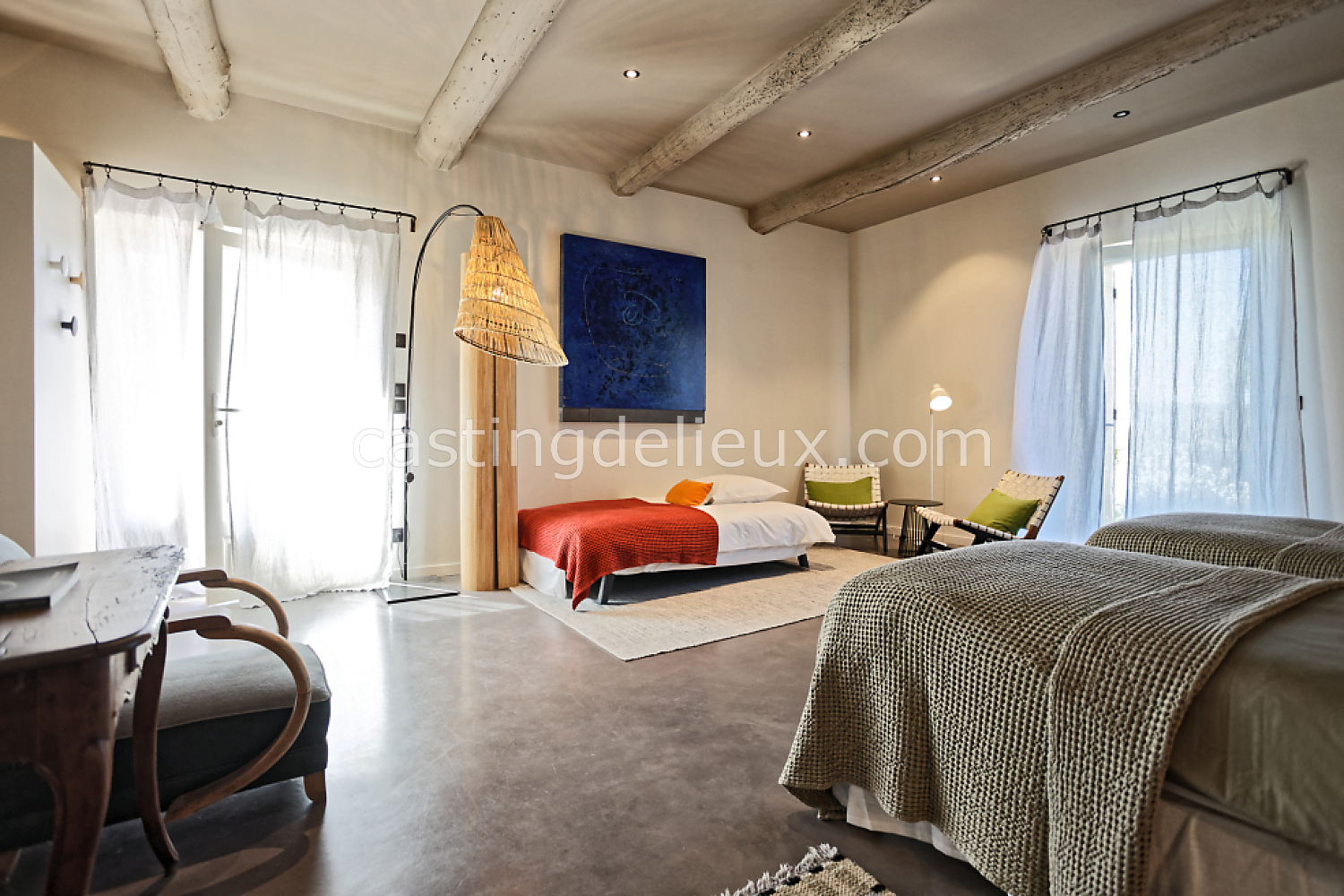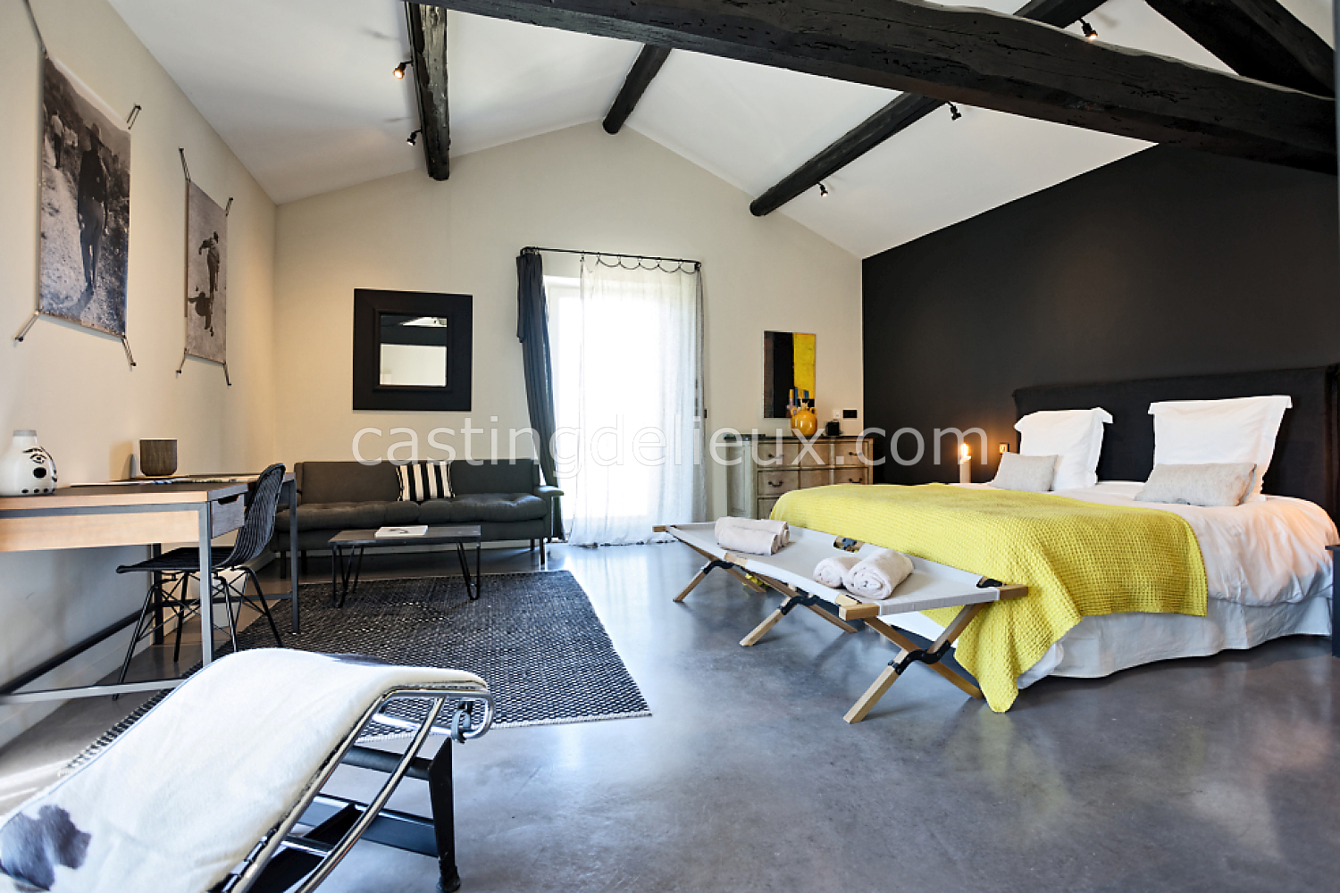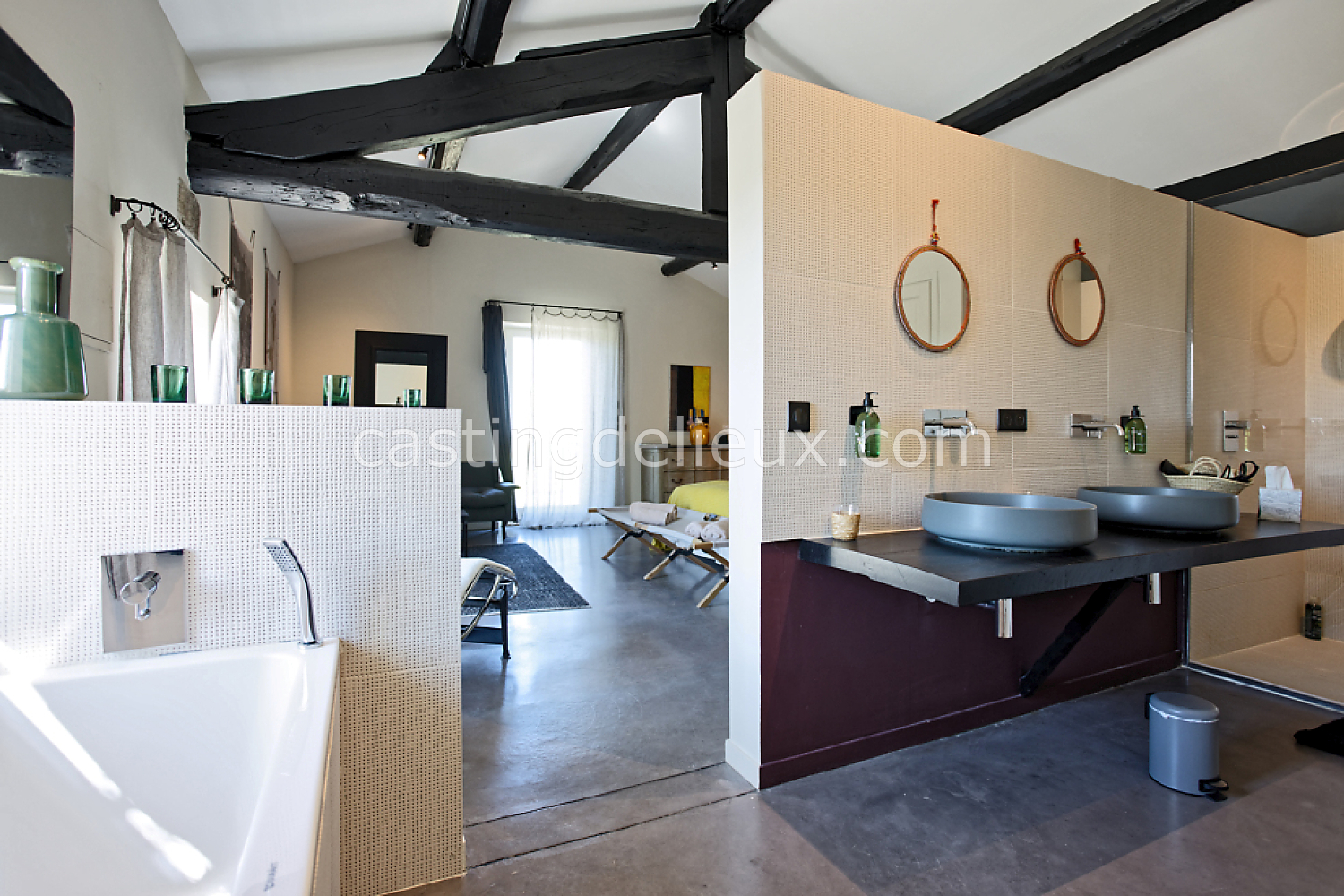 Béton cirée, Sol bois / parquet, Murs blancs / Enduits naturels, Tomettes / carrelage ancien, Cheminée, Charpente / poutres apparente, Déco vintage