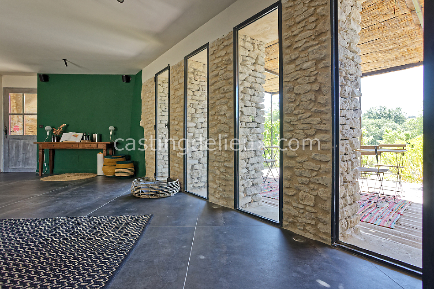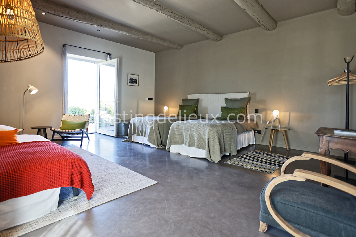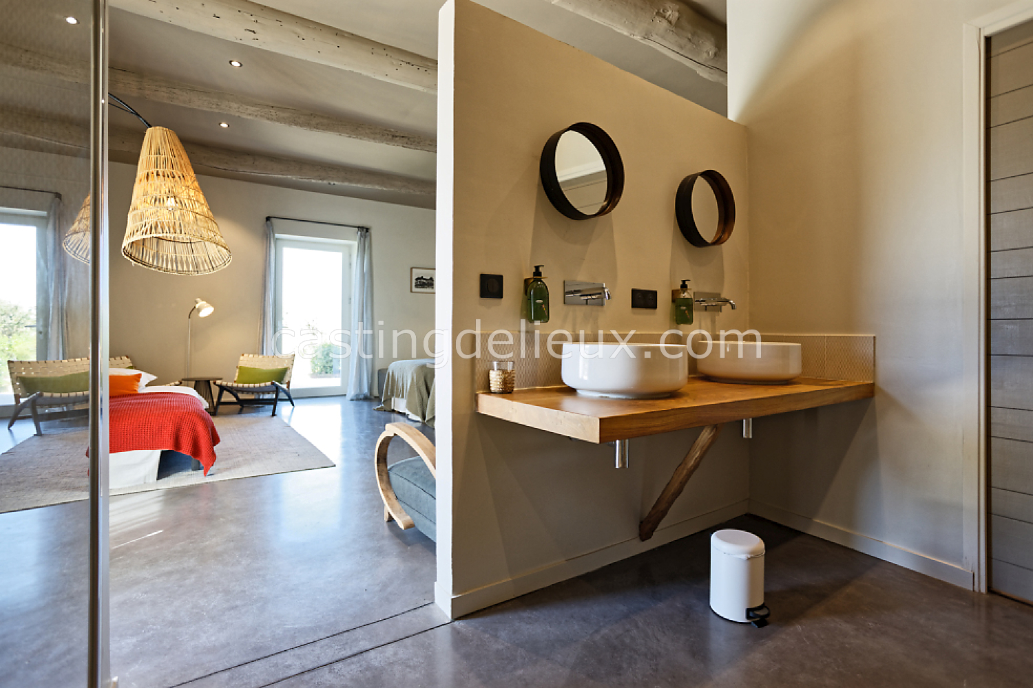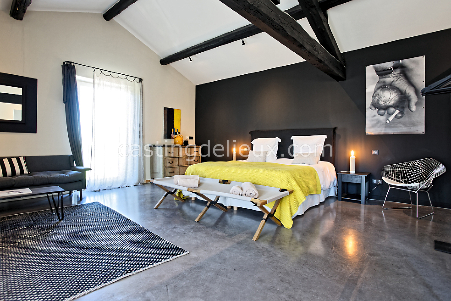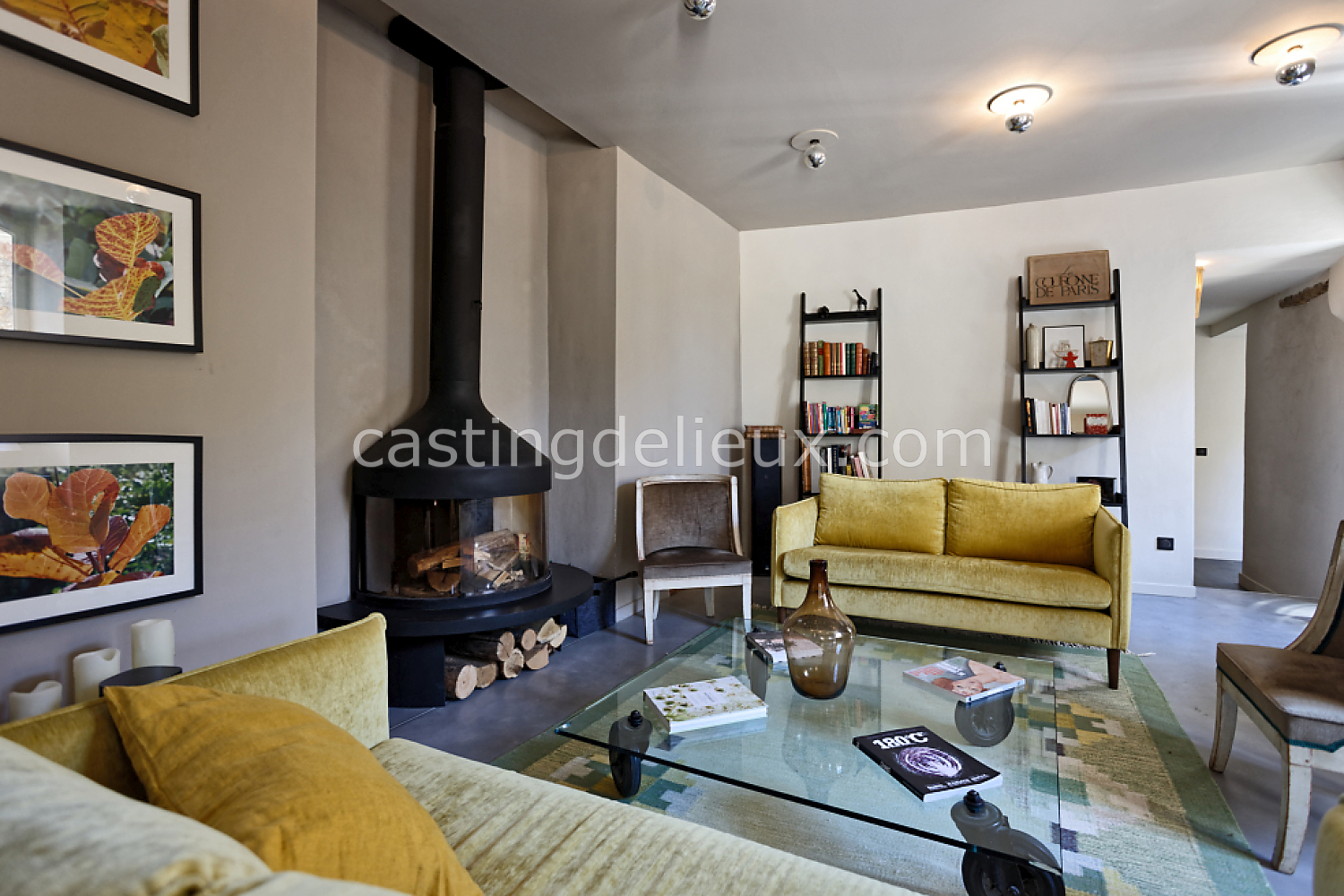 Béton cirée, Sol bois / parquet, Murs blancs / Enduits naturels, Tomettes / carrelage ancien, Cheminée, Charpente / poutres apparente, Déco vintage