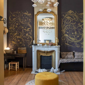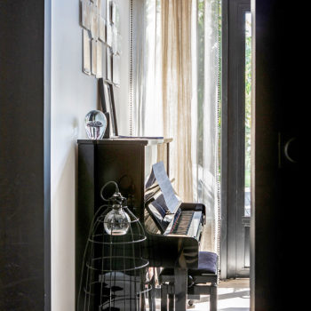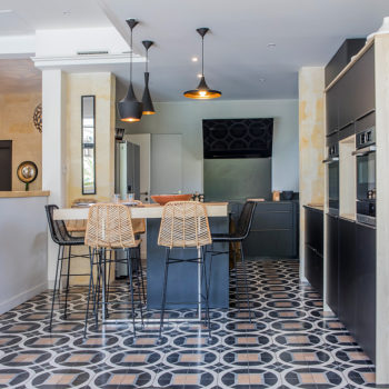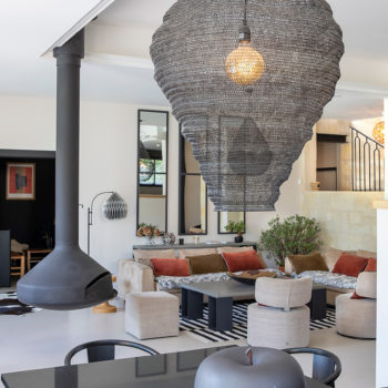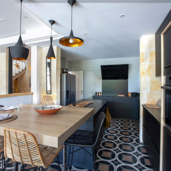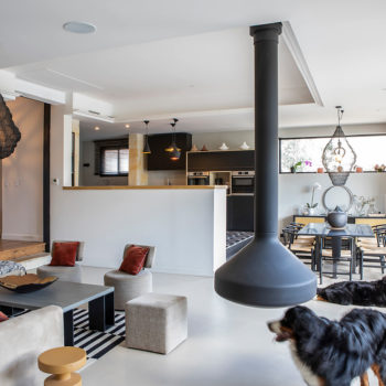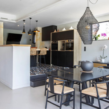 murs peints / tapisseries, parquet, carrelage/tomettes, cheminée, verrière / patio, cuisine ouverte, baie vitrée