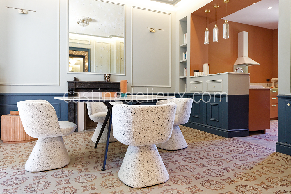 | Ambiance intérieure | Sol bois / parquet, Mur coloré / accent wall, Tomettes / carrelage ancien, Moulures, Cheminée, Déco contemporaine |