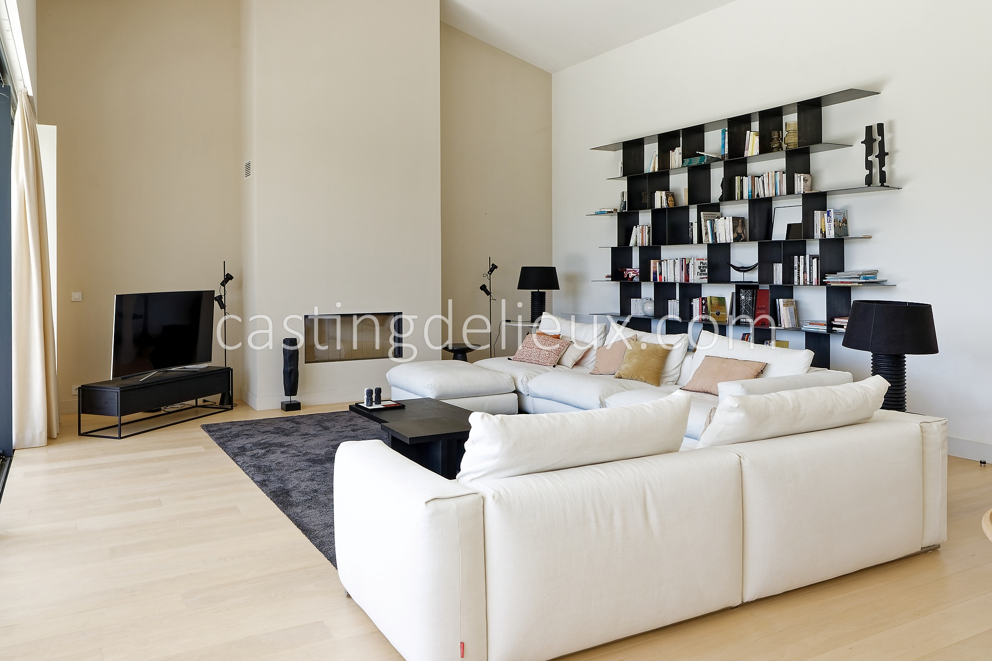 | Ambiance intérieure | Grande hauteur sous plafond, Sol bois / parquet, Cheminée, Déco contemporaine, Ambiance design, Cuisine ouverte |