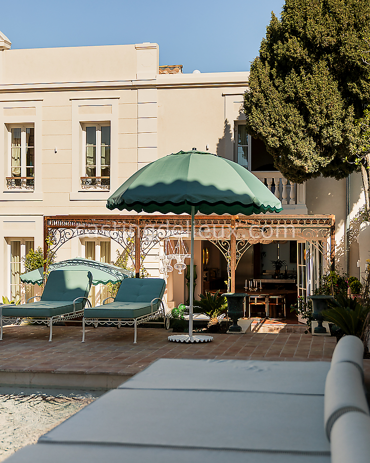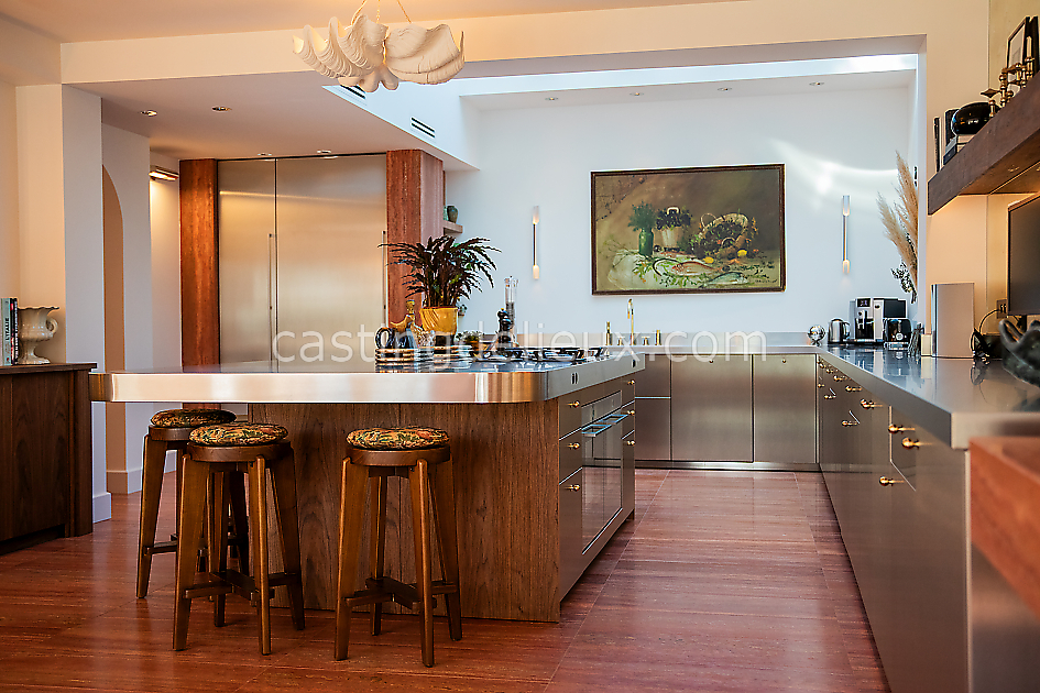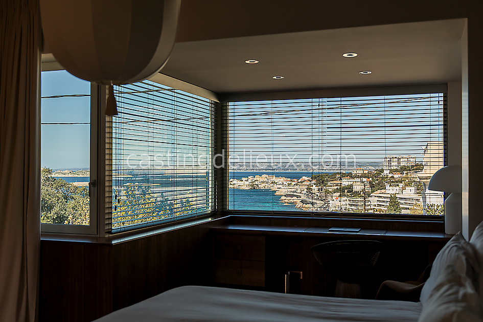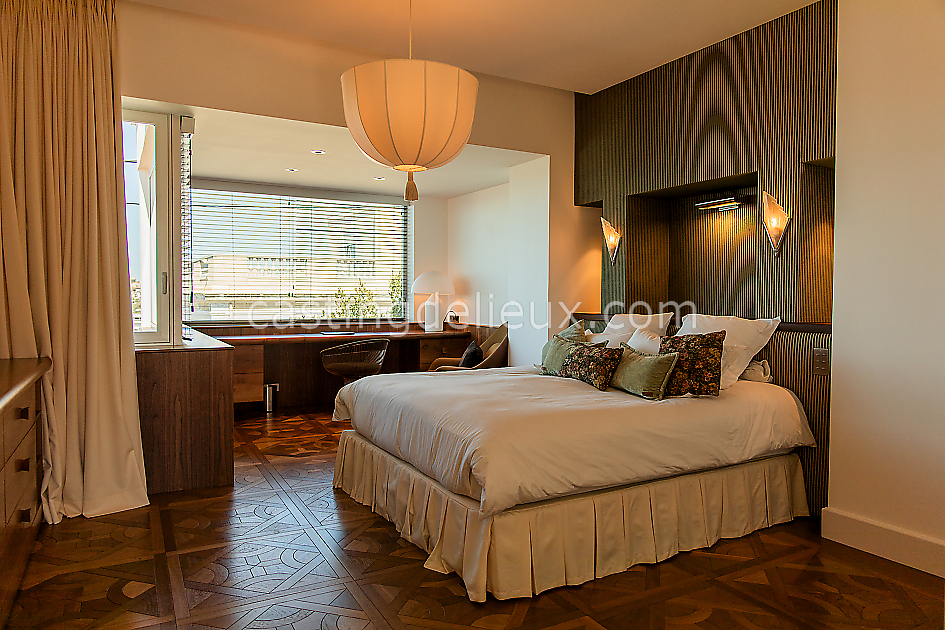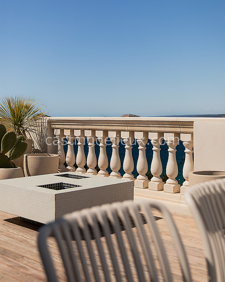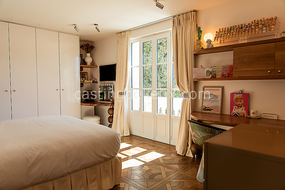 Quatre chambres en suite, deux salons, grande cuisine avec cheminée, piscine, spa avec sauna, hammam et salle de sport, toit-terrasse vue mer, cuisine d’été et accès direct à la Méditerranée.