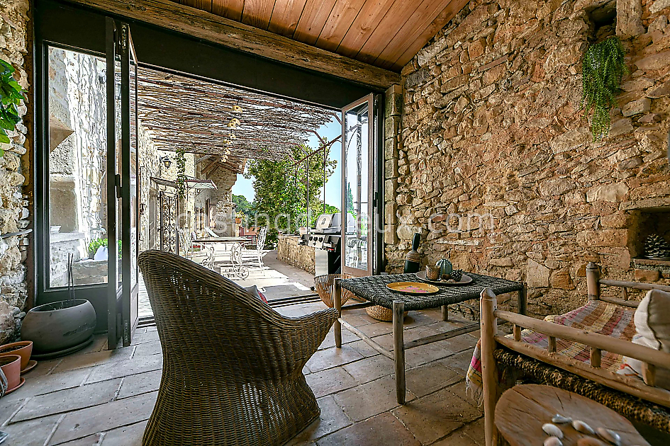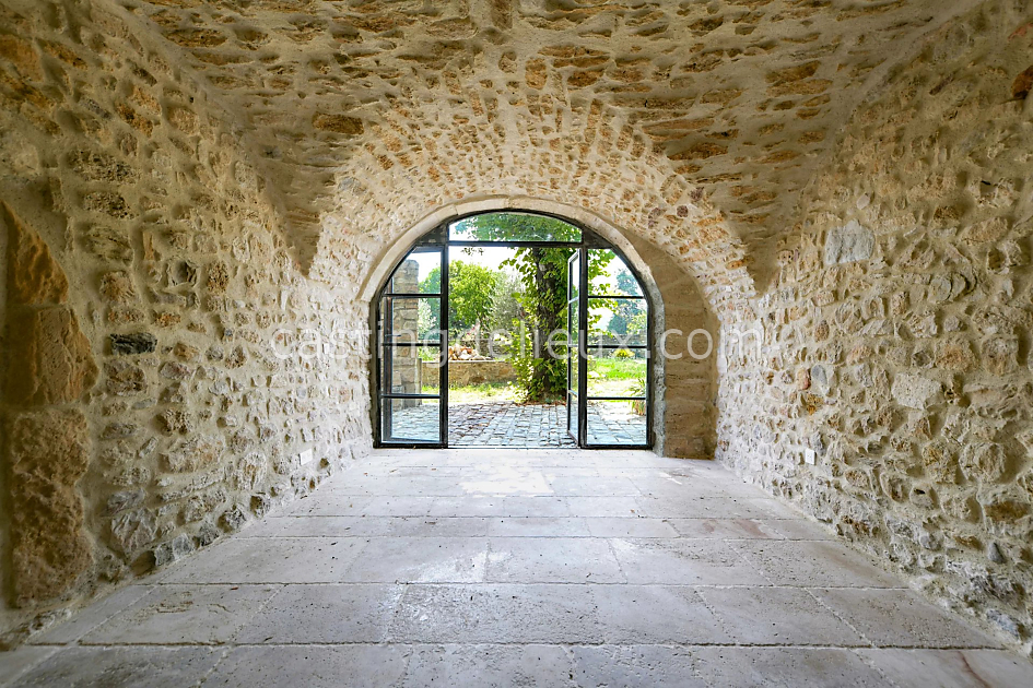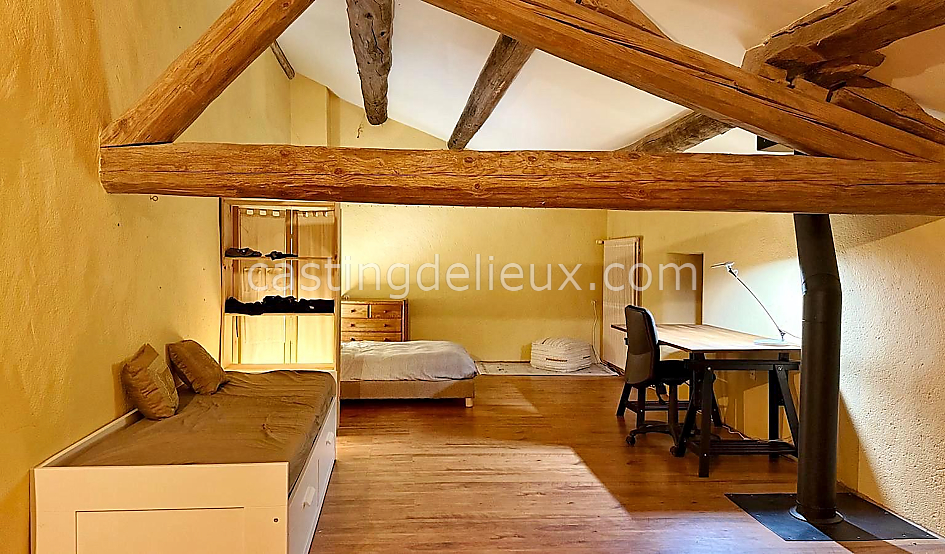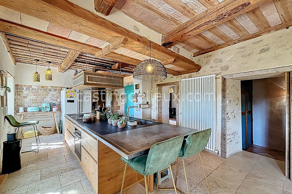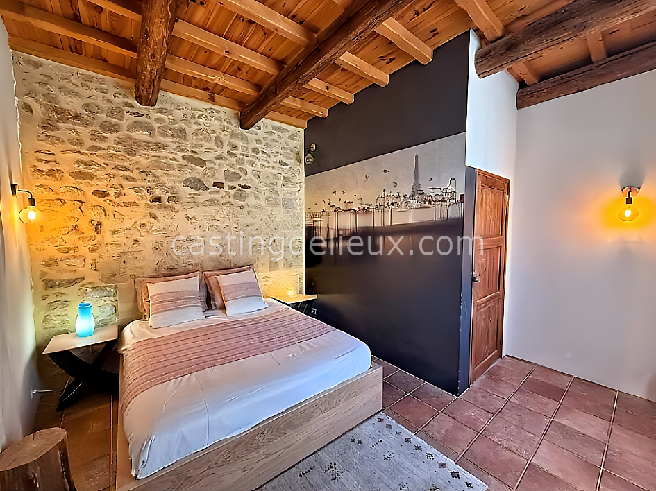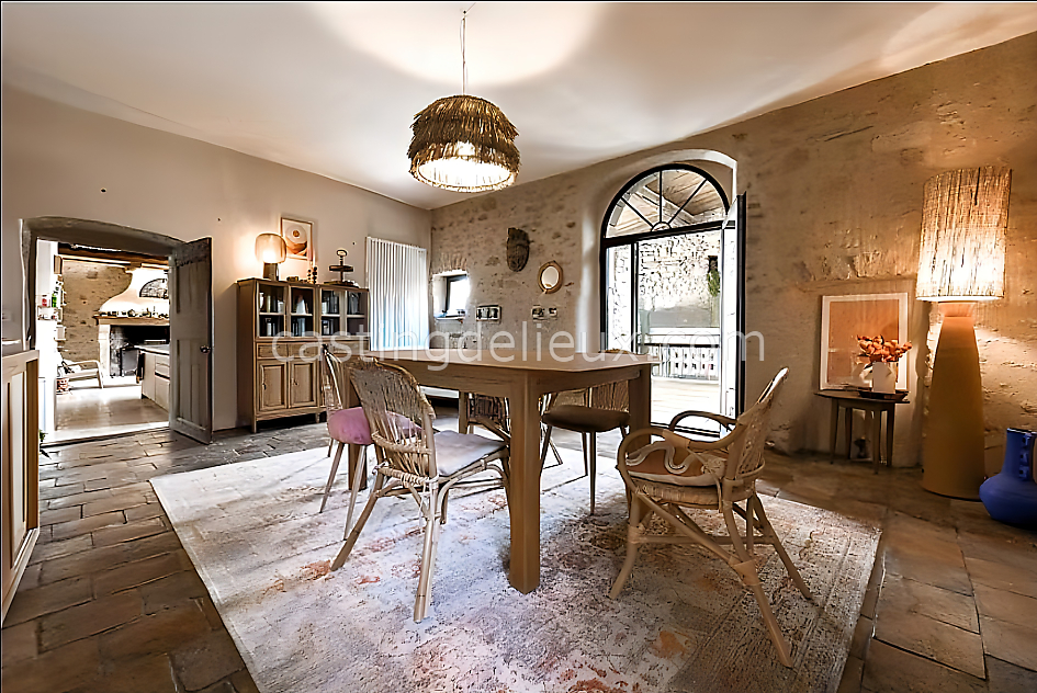 | Ambiance intérieure | Grande hauteur sous plafond, Verrière / baie vitrée, Pierre apparente, Sol bois / parquet, Murs blancs / Enduits naturels, Tomettes / carrelage ancien, Cheminée, Charpente / poutres apparente |