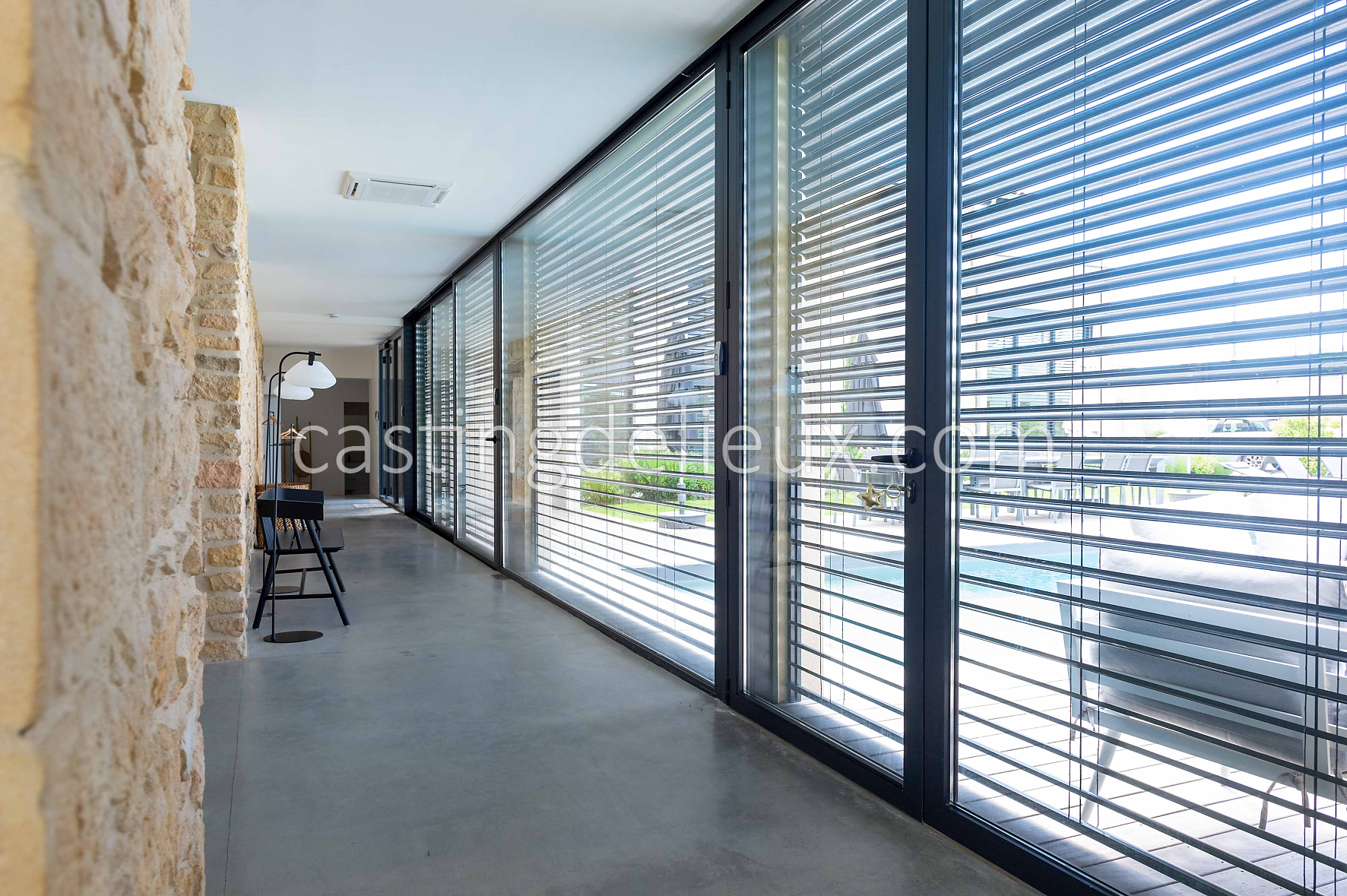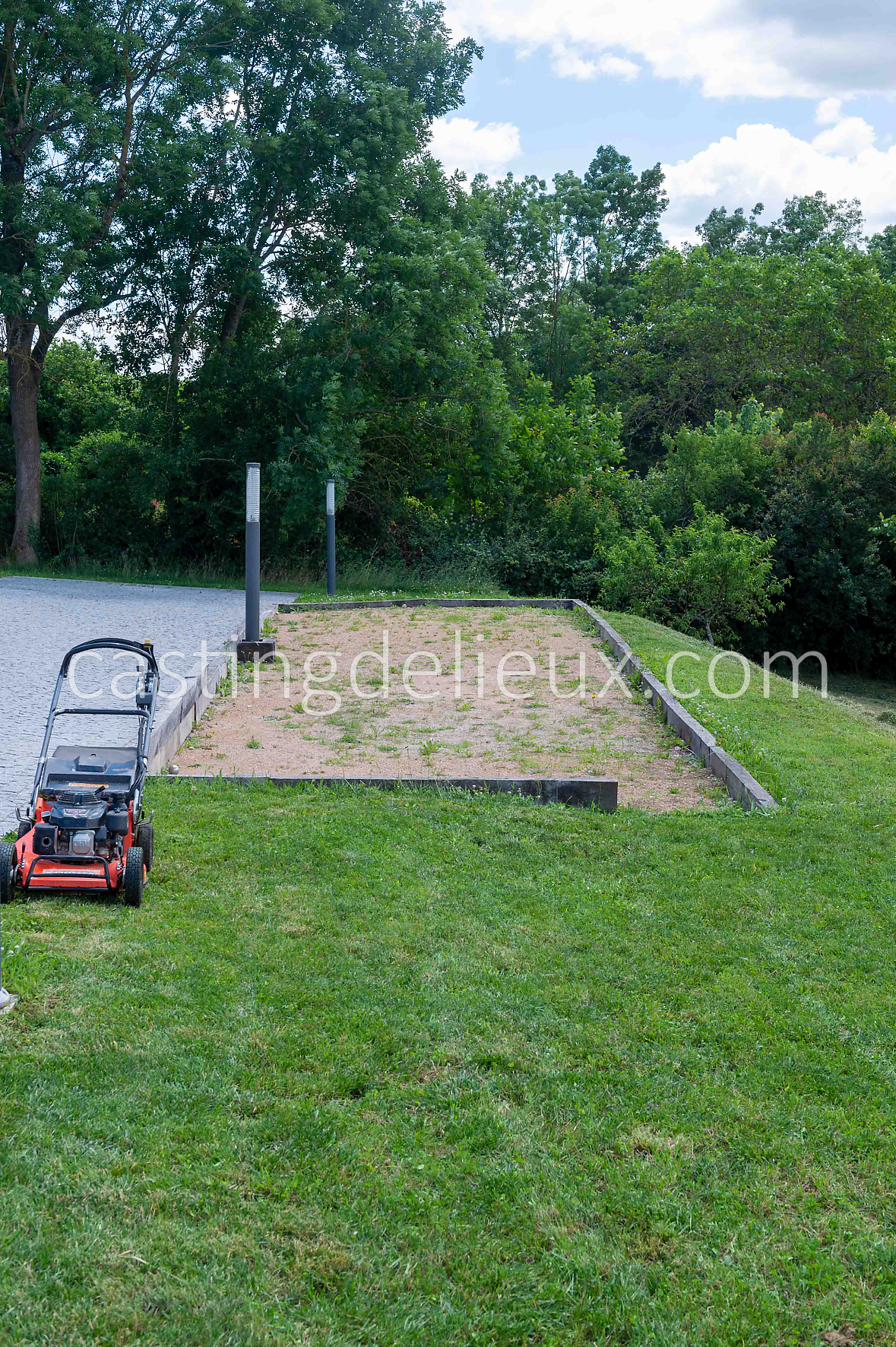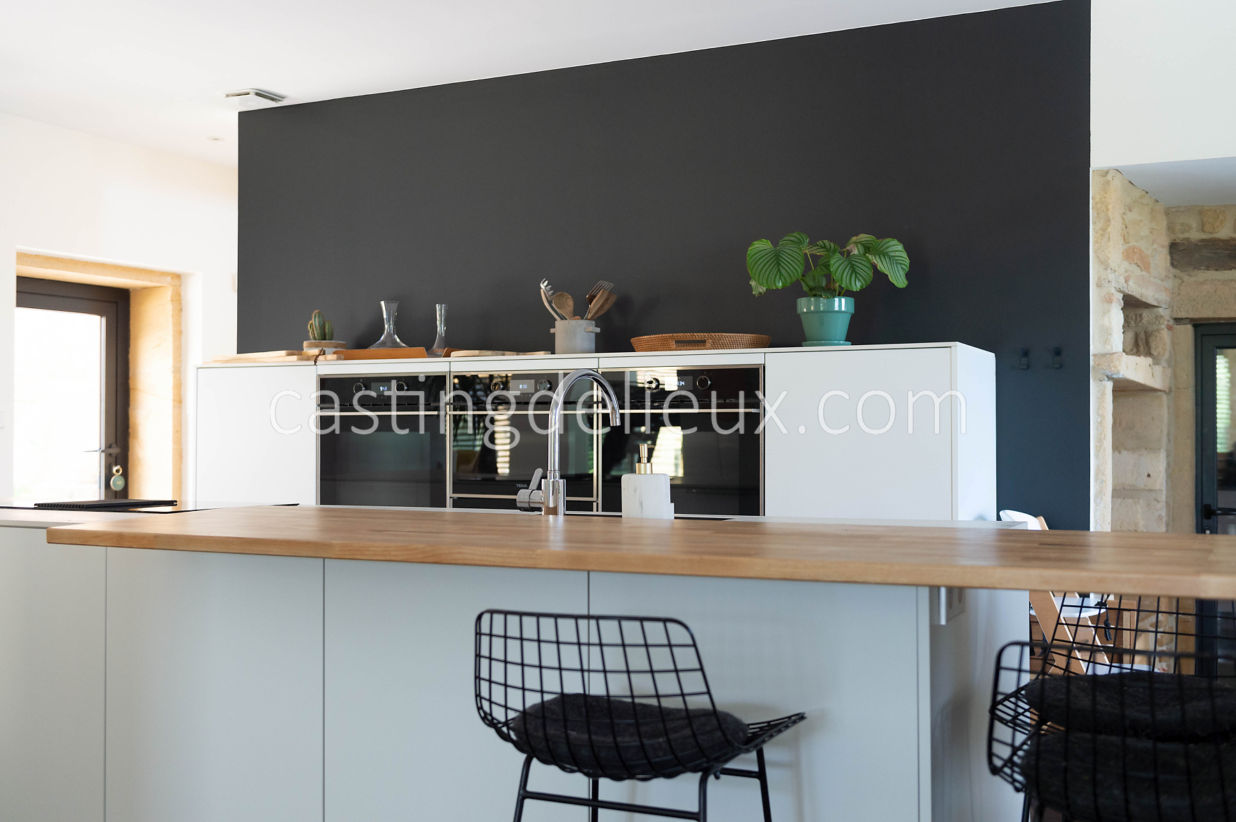 Garage voitures, Mur de pierre, En campagne, Piscine traditionnelle, Terrasse bois