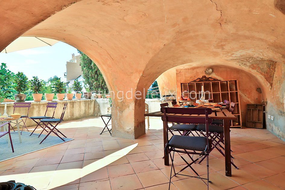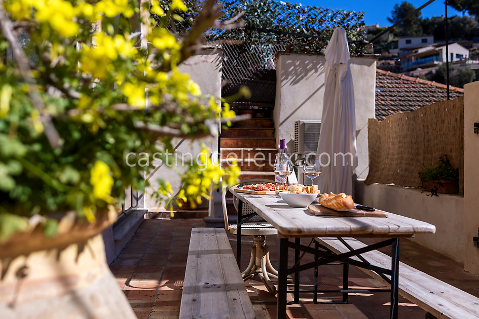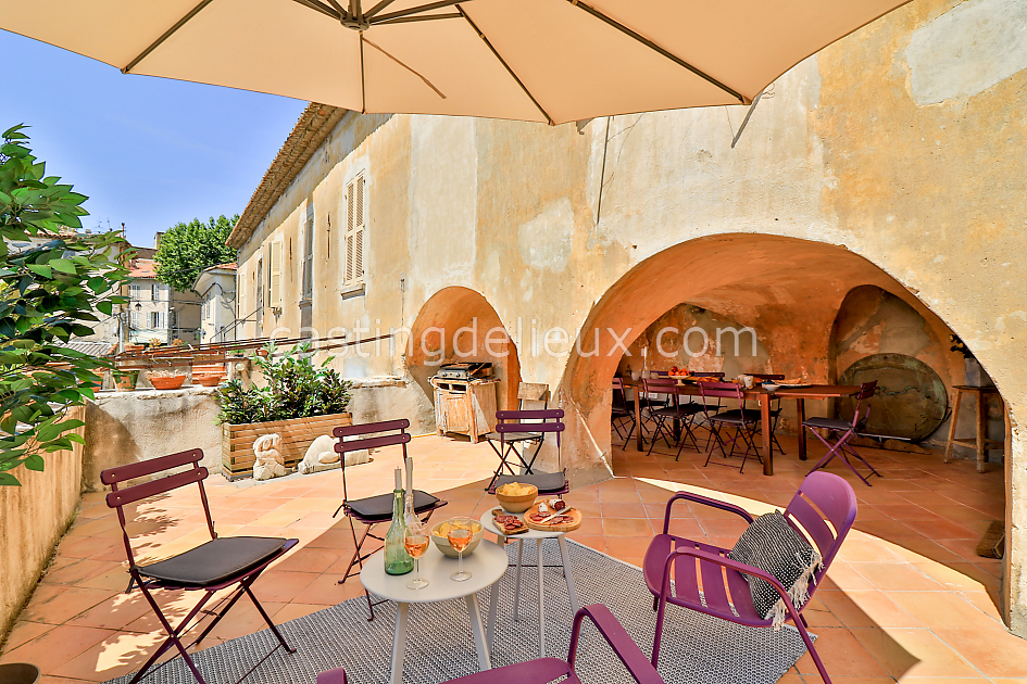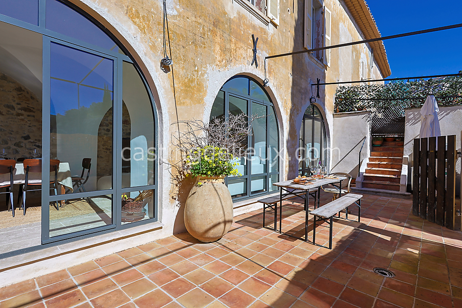 | Environnement extérieur | Mur de pierre, En village, Cour intérieure / Patio, Terrasse carrelée / pierre, Terrasse couverte / pergola |