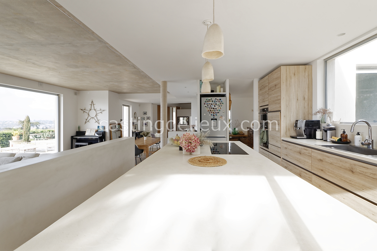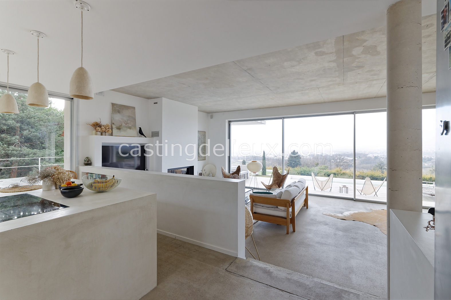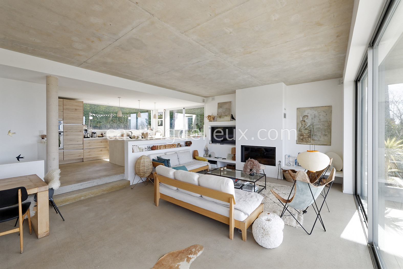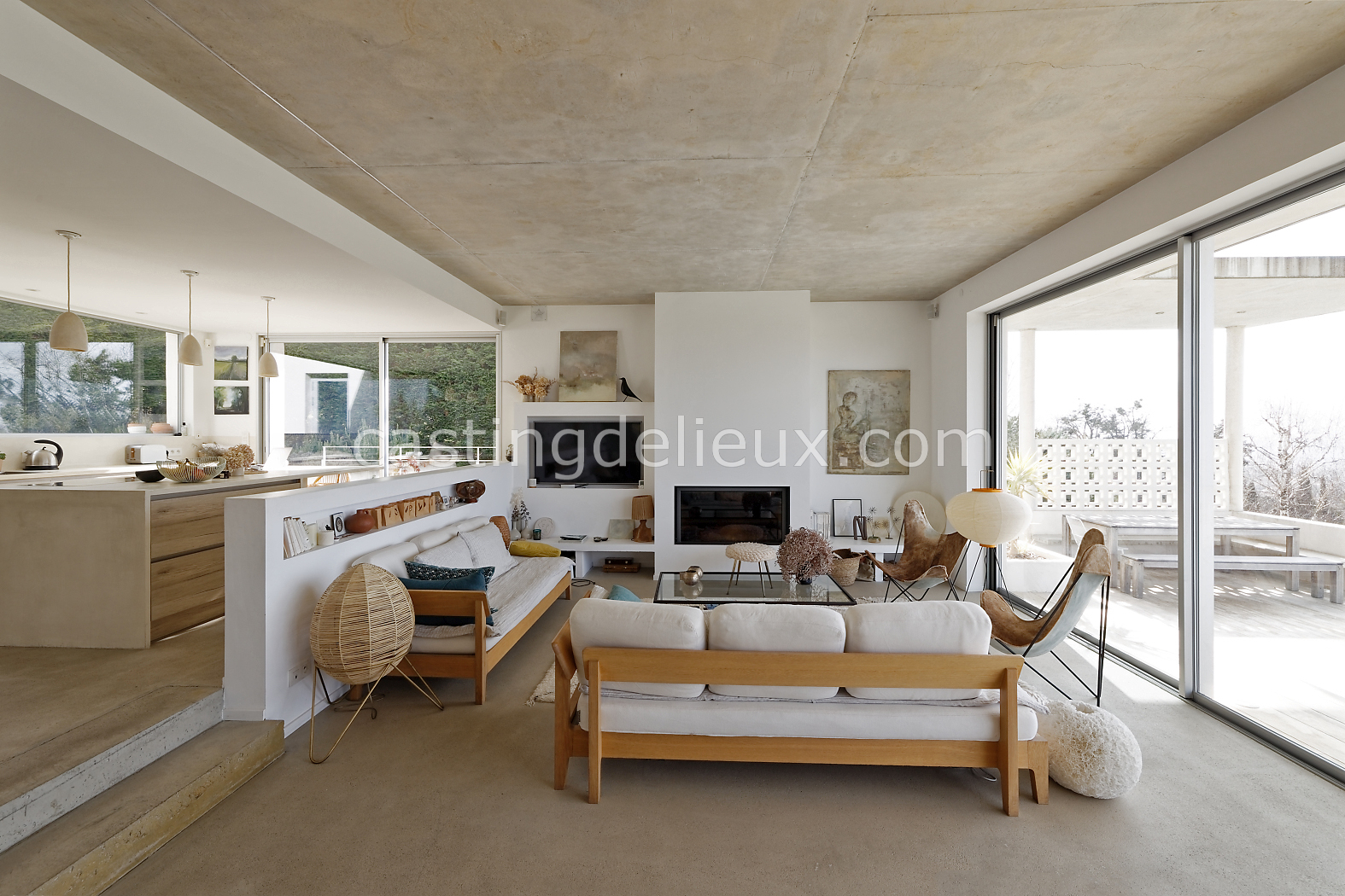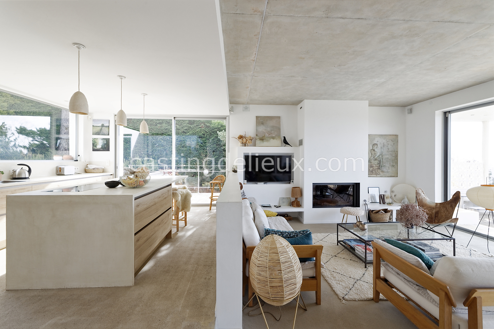| Ambiance intérieure | Sol béton cirée, Béton brut, Murs blancs / Enduits naturels, Cheminée, Déco bohème, Cuisine ouverte |