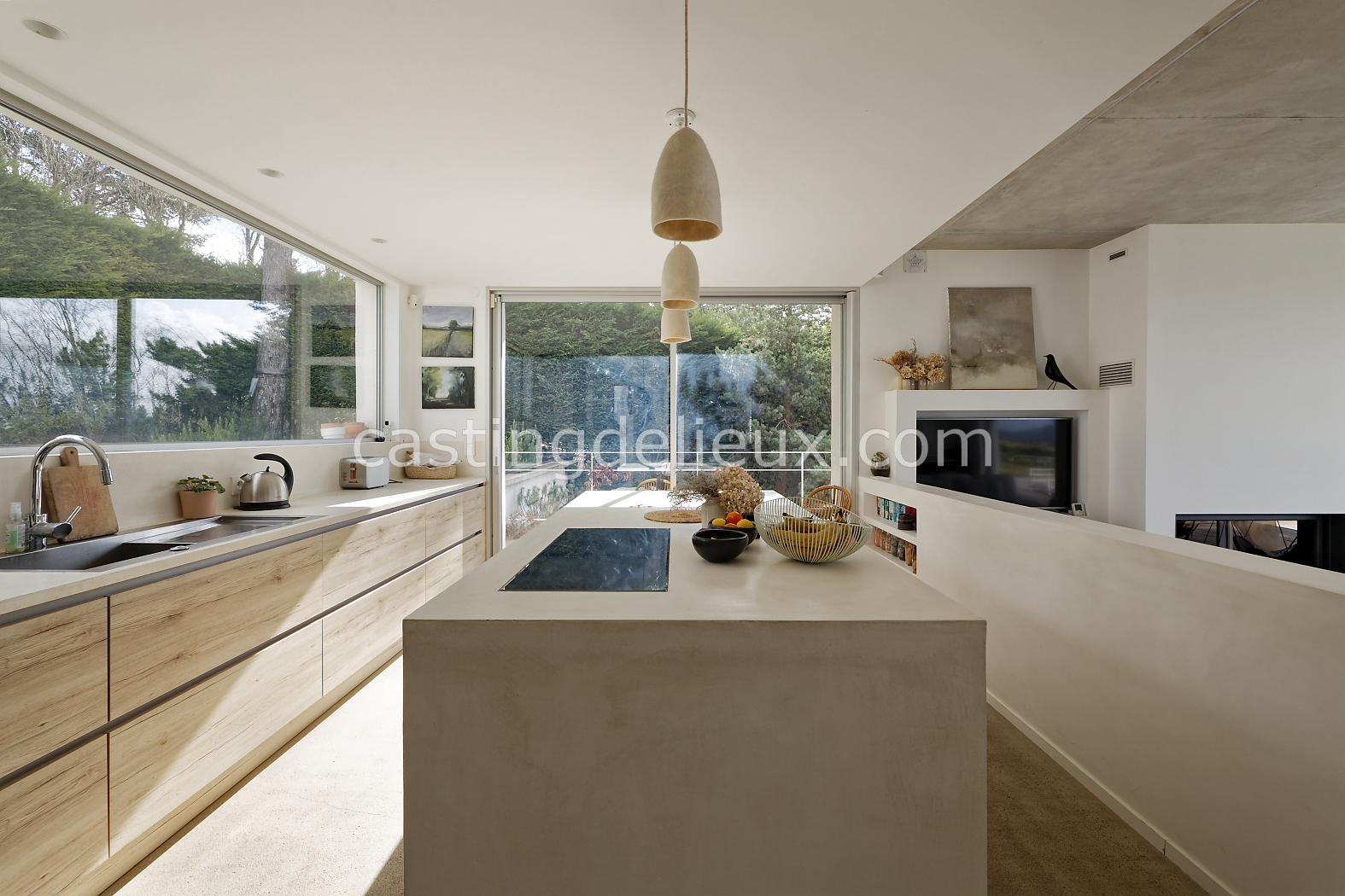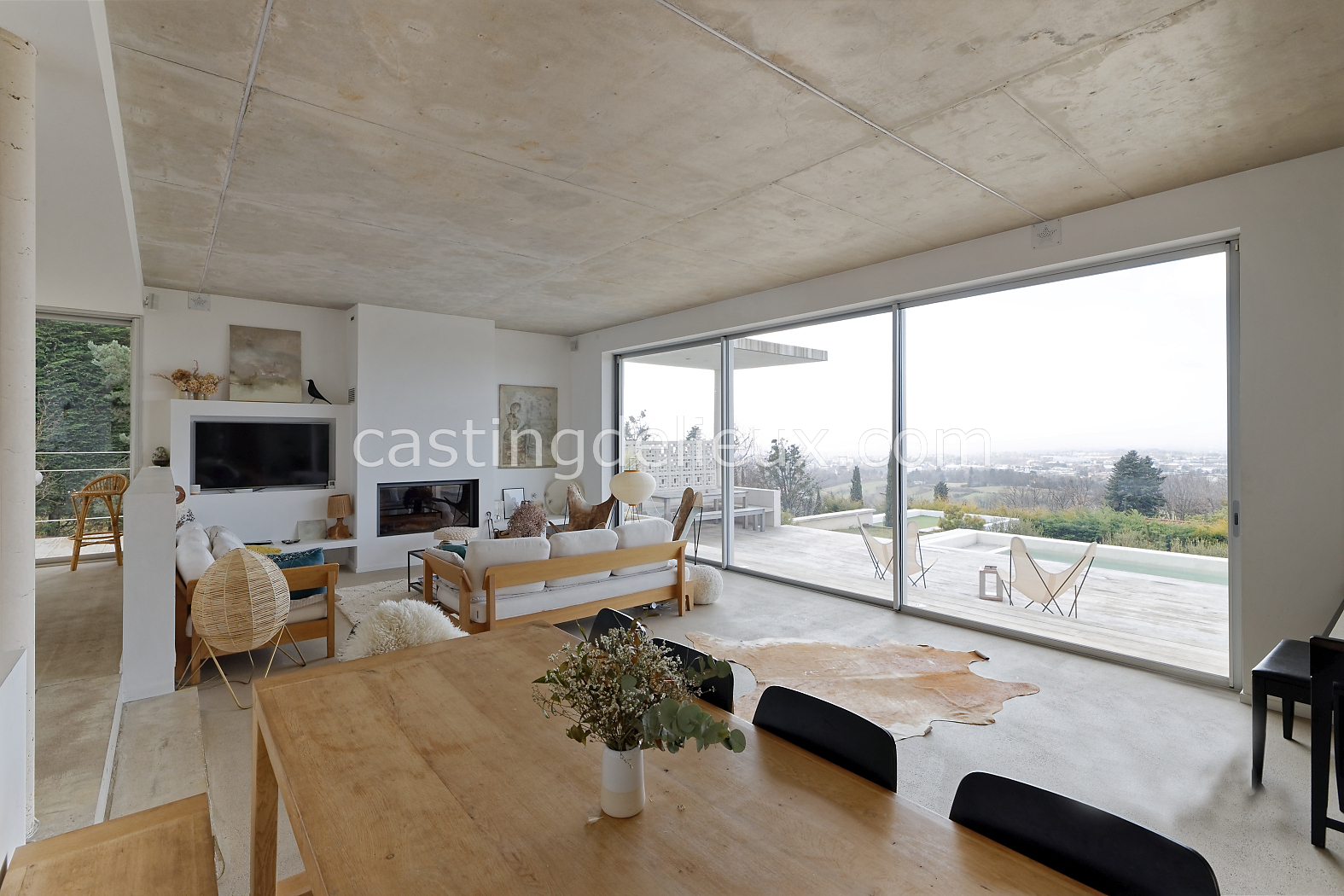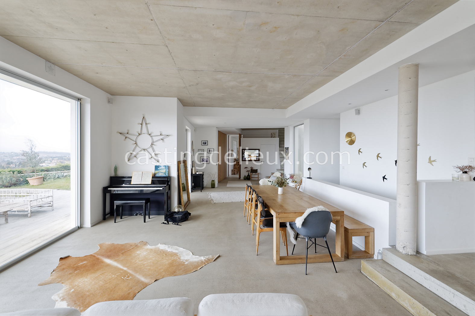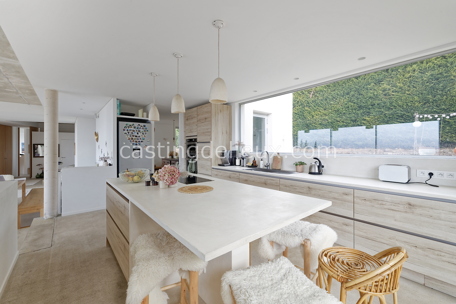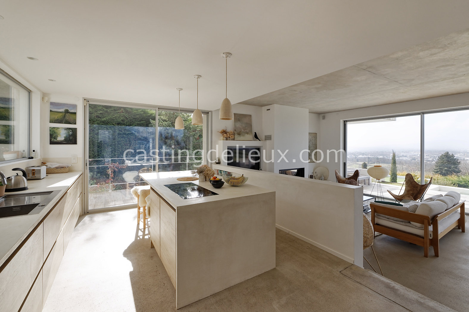 | Ambiance intérieure | Sol béton cirée, Béton brut, Murs blancs / Enduits naturels, Cheminée, Déco bohème, Cuisine ouverte |
