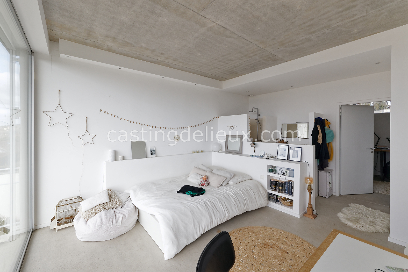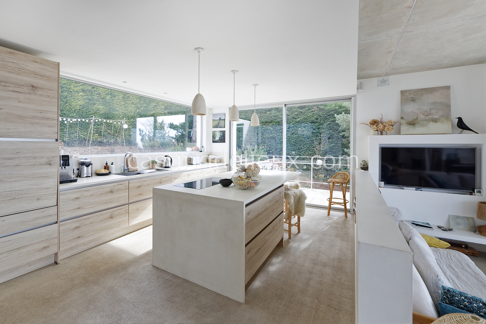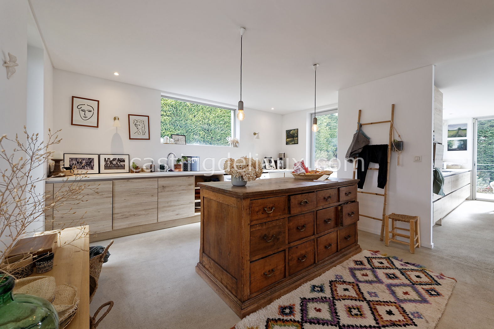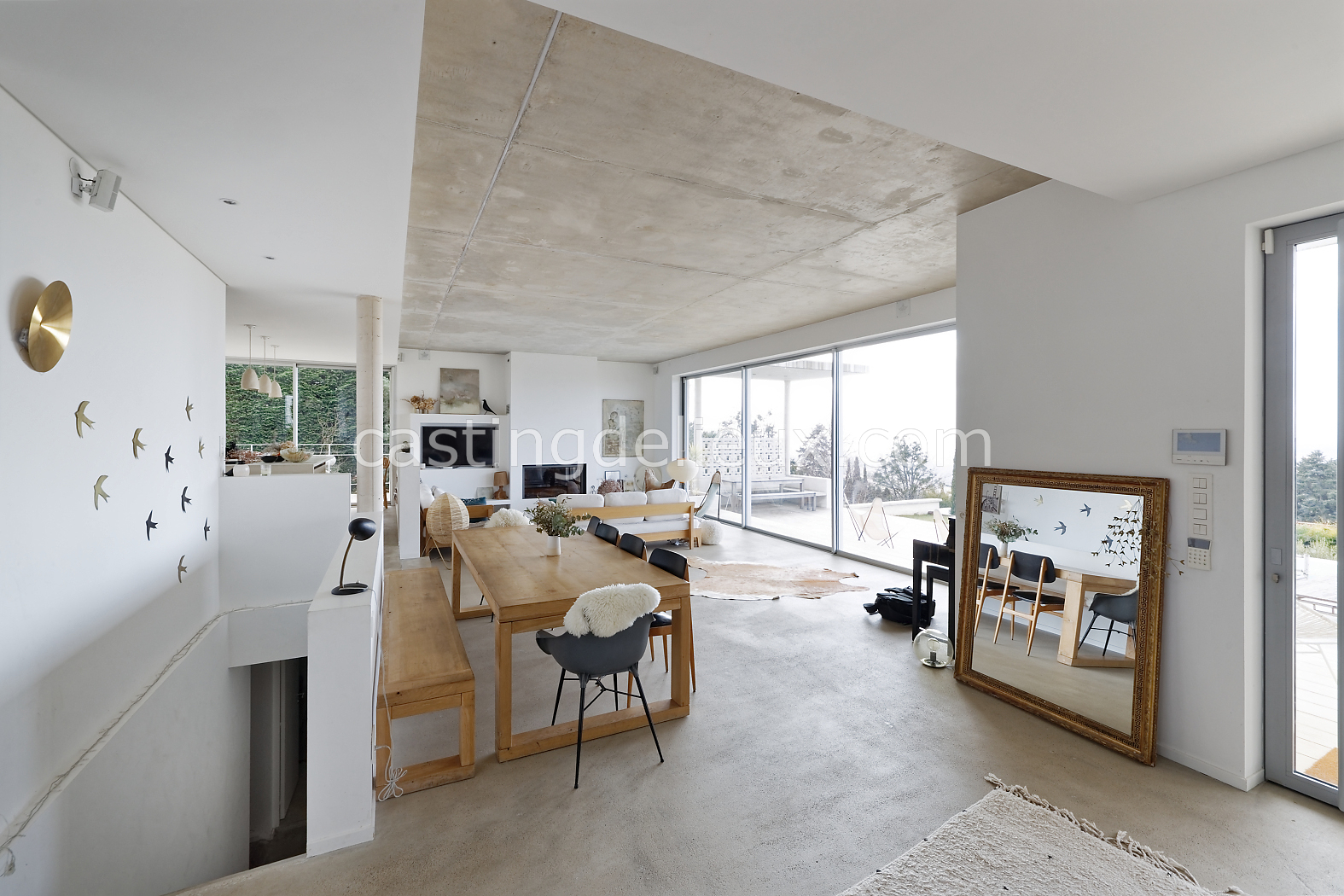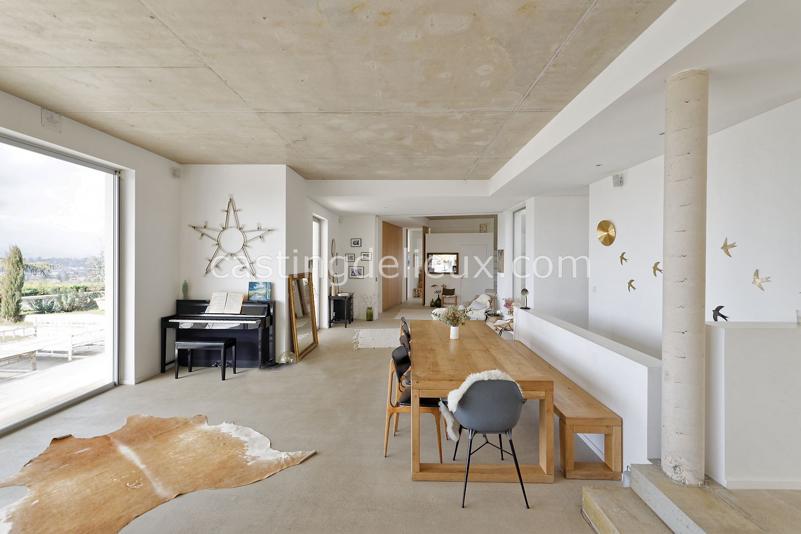 | Ambiance intérieure | Sol béton cirée, Béton brut, Murs blancs / Enduits naturels, Cheminée, Déco bohème, Cuisine ouverte |