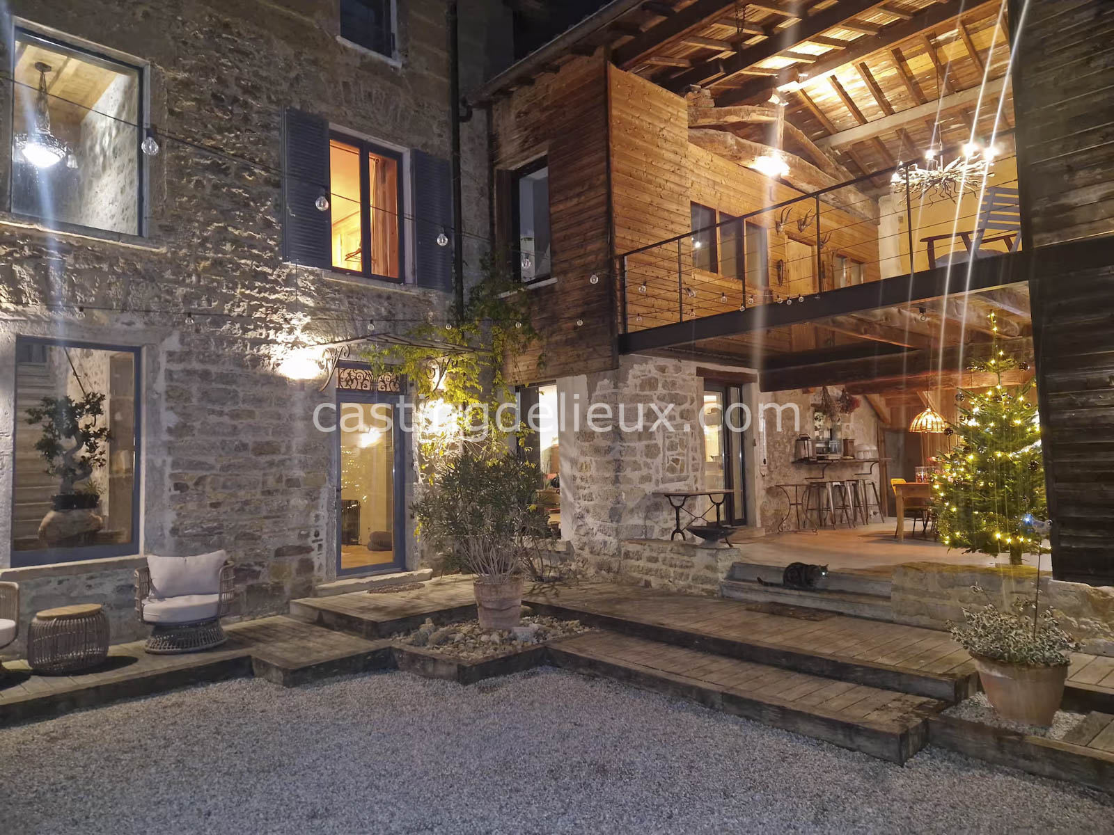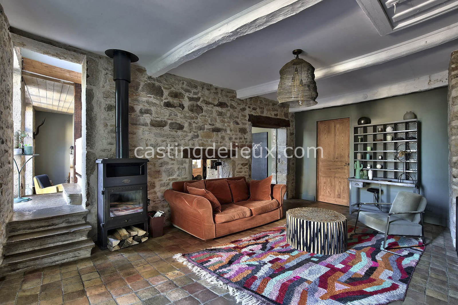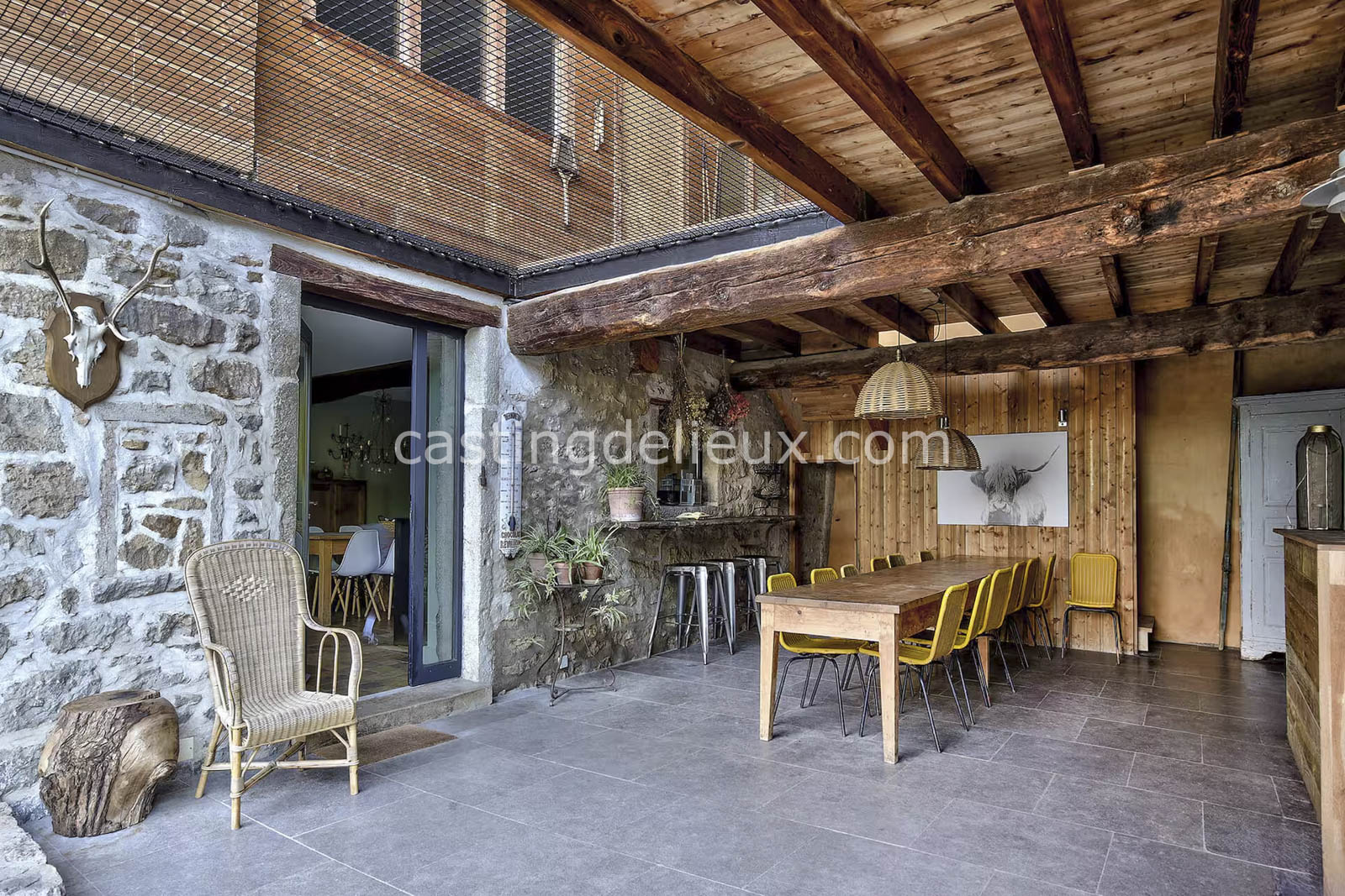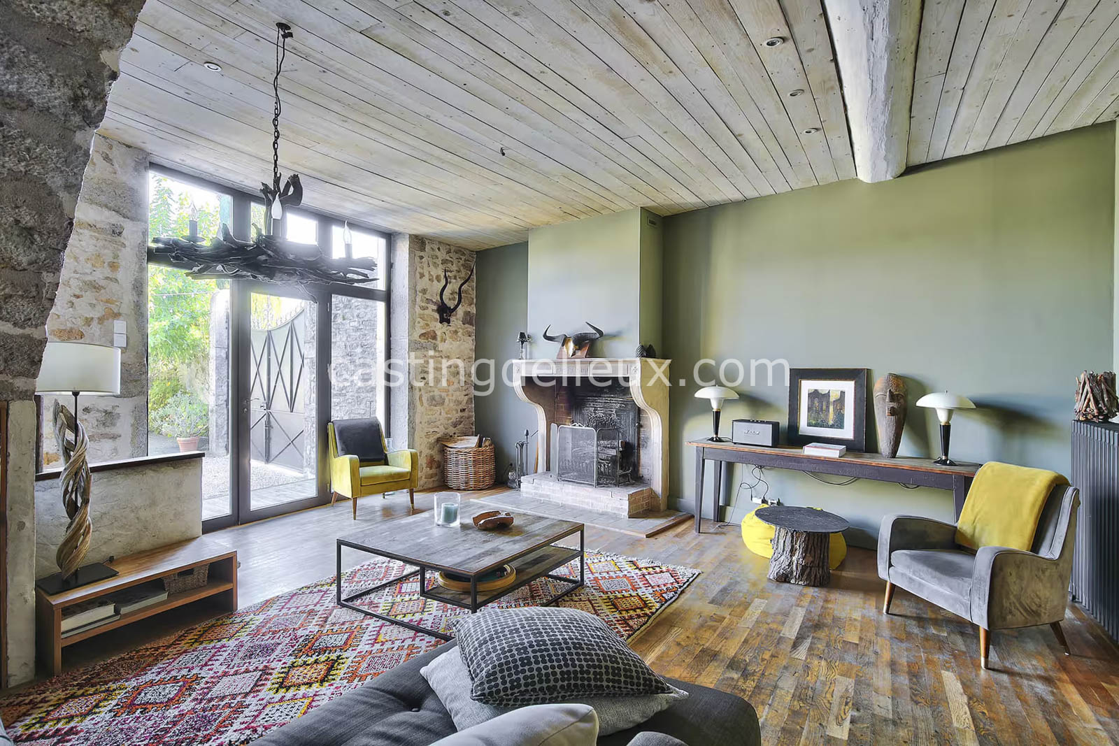 | Ambiance intérieure | Patio, Grande hauteur sous plafond, Verrière / baie vitrée, Pierre apparente, Sol bois / parquet, Tomettes / carrelage ancien, Cheminée, Charpente / poutres apparente, Ambiance rustique |