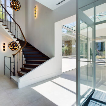 baie vitrée, verrière / patio, cheminée, hauteur sous plafond, carrelage/tomettes, parquet, murs peints / tapisseries