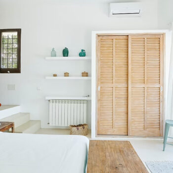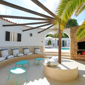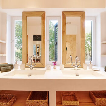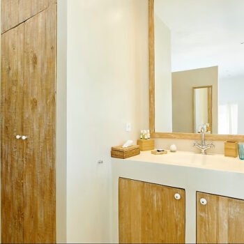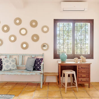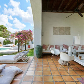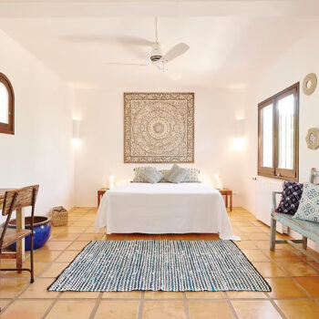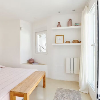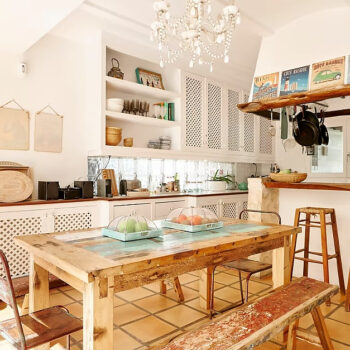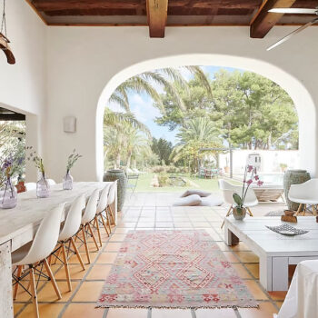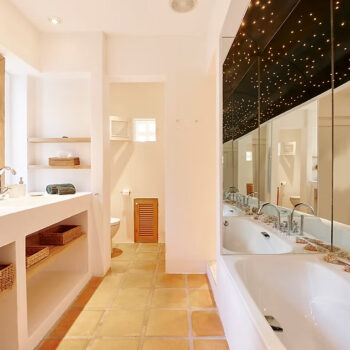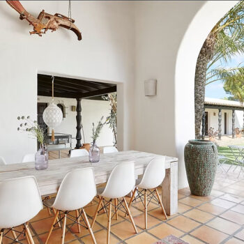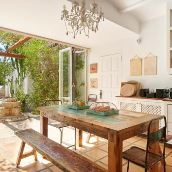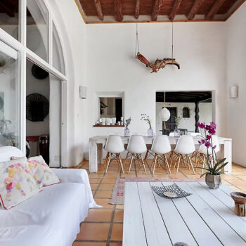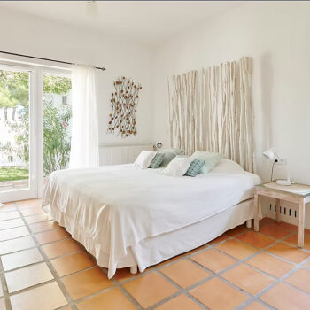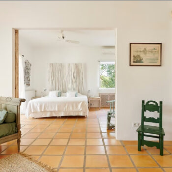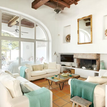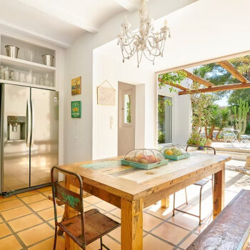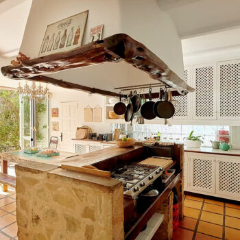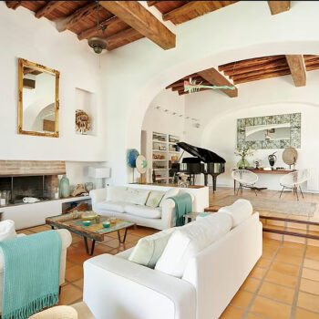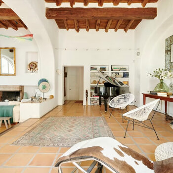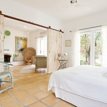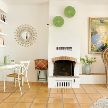 carrelage/tomettes, hauteur sous plafond, cheminée, cuisine ouverte, baie vitrée, sol béton, pierre