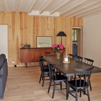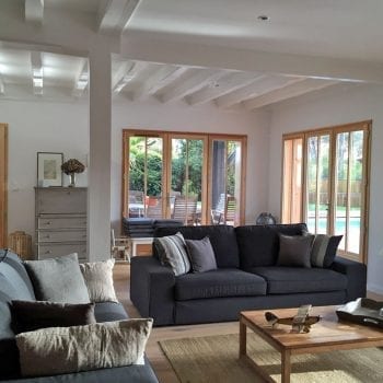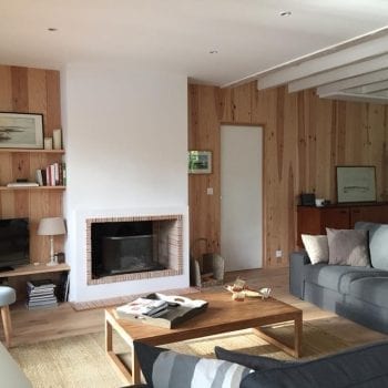 Grande pièce de vie  ( 55 m2) murs blancs et bois clair,  5 chambres, 3 salles de bains.