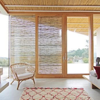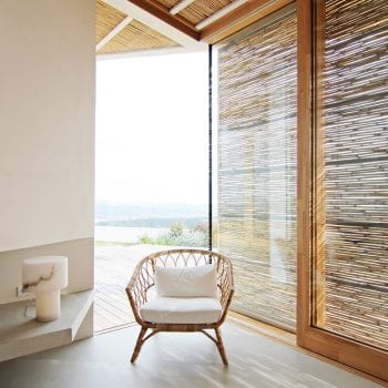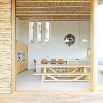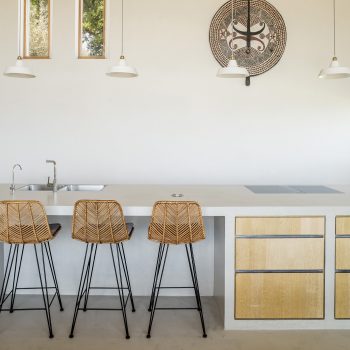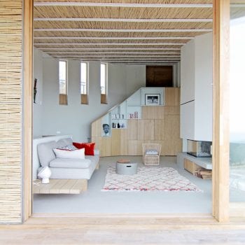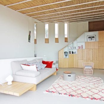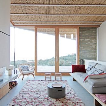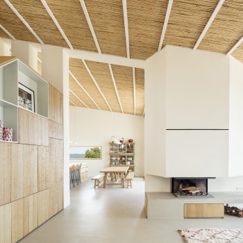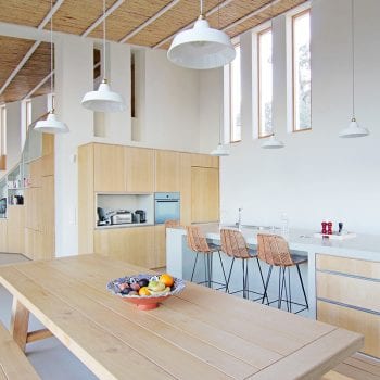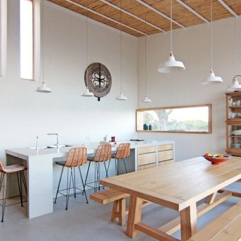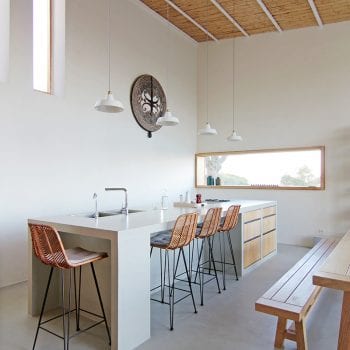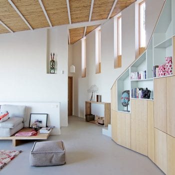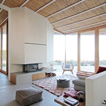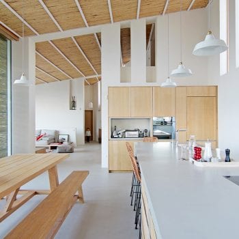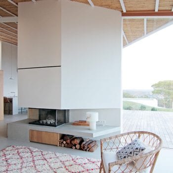 hauteur sous plafond, cheminée, cuisine ouverte, baie vitrée, sol béton