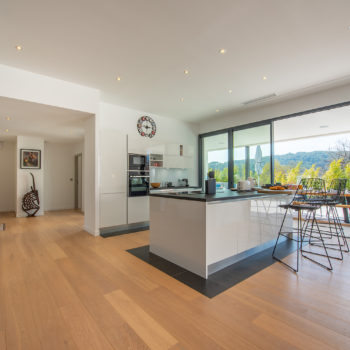parquet, cheminée, cuisine ouverte, baie vitrée