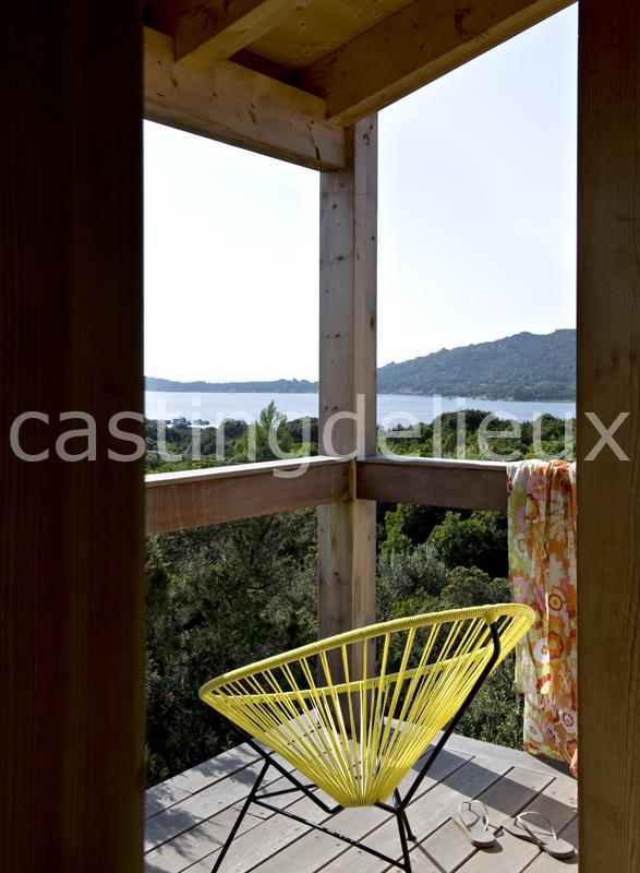 Maison contemporaine en bois située dans le sud de la Corse, vue mer.