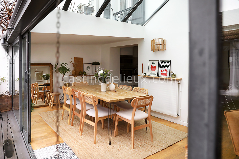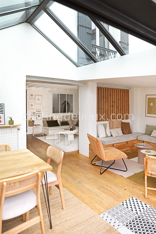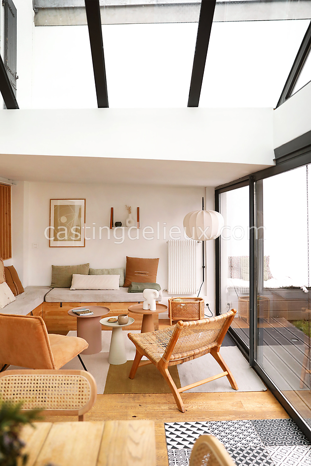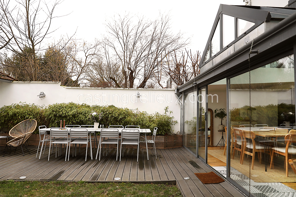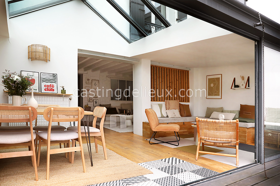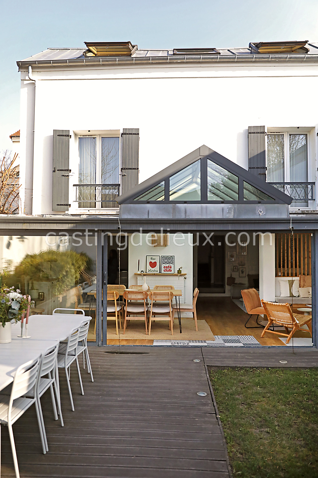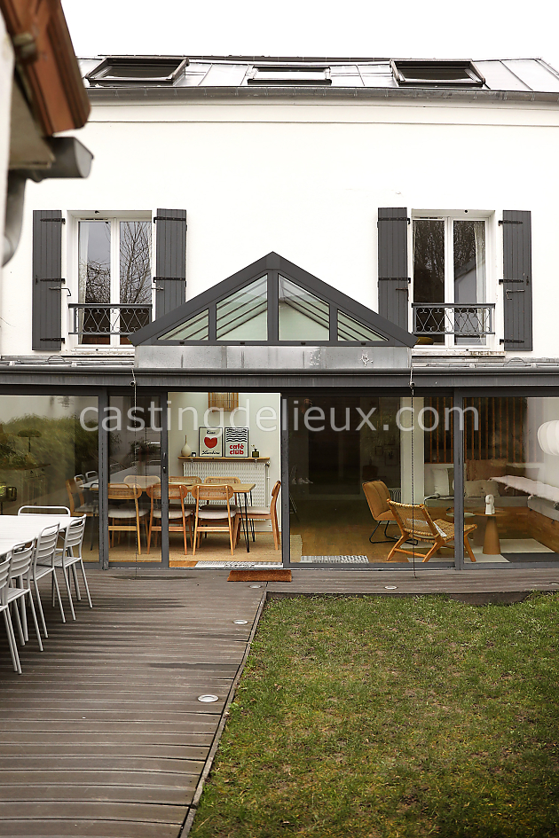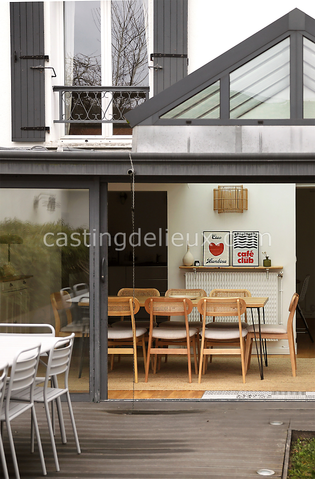 Maison contemporaine en Île-de-France (Nanterre), offrant espaces lumineux, grandes baies vitrées, cuisine ouverte et terrasse. Intérieurs avec verrière, parquet et décor contemporain, adapté pour shootings photo et tournages.