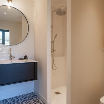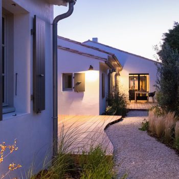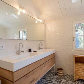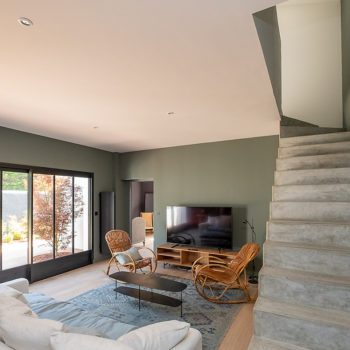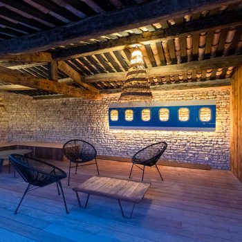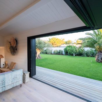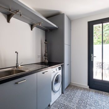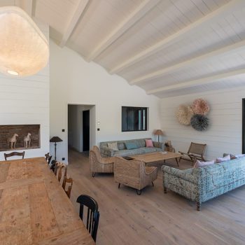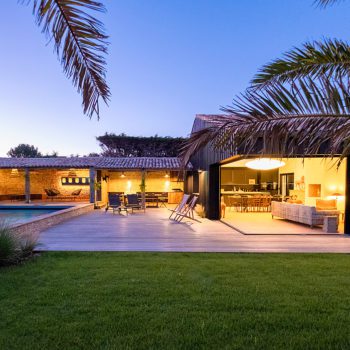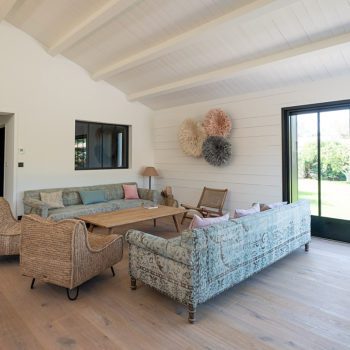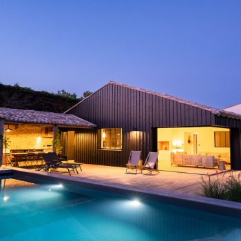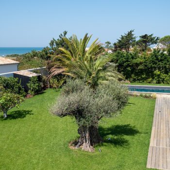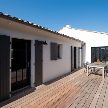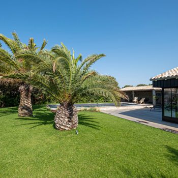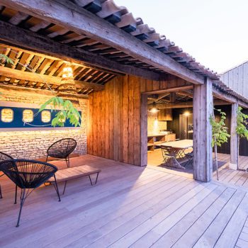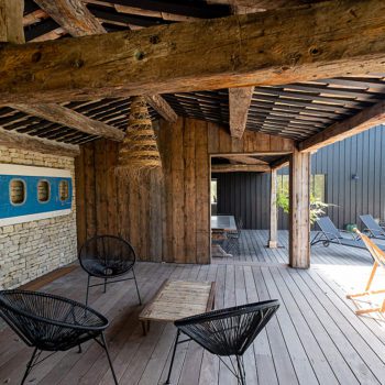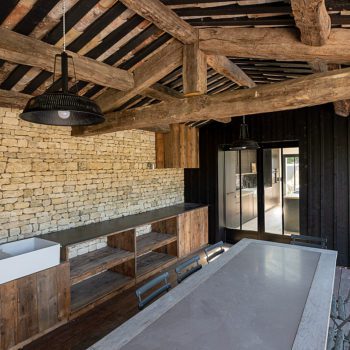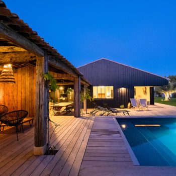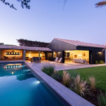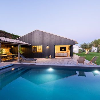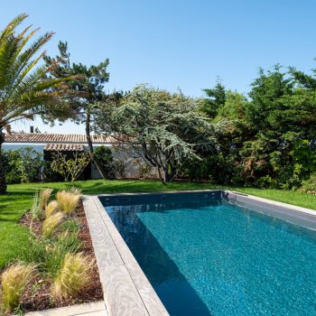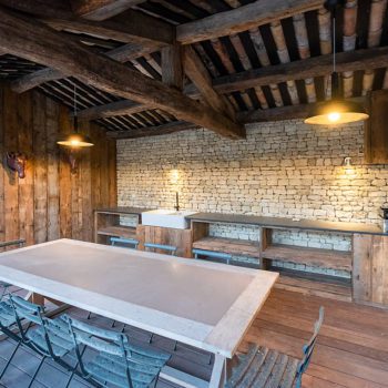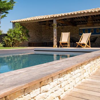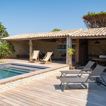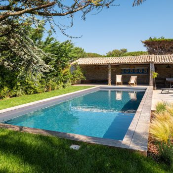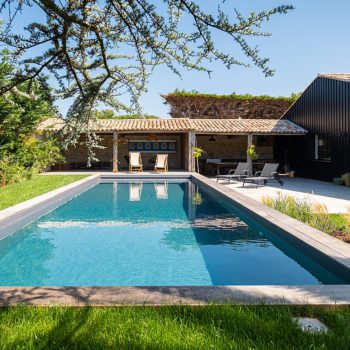 cuisine extérieure / pool house, terrasse bois, prairie, piscine