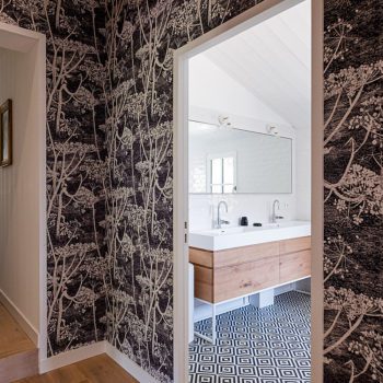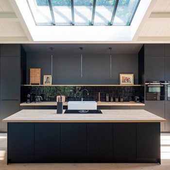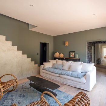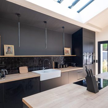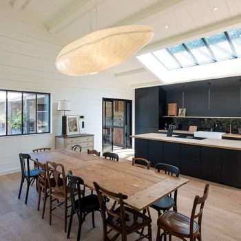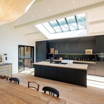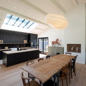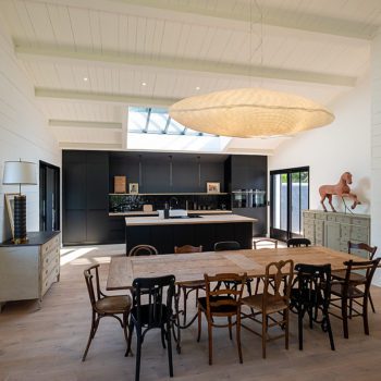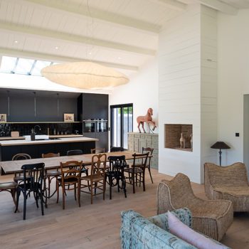 cuisine ouverte, verrière / patio, cheminée, hauteur sous plafond, parquet, murs peints / tapisseries