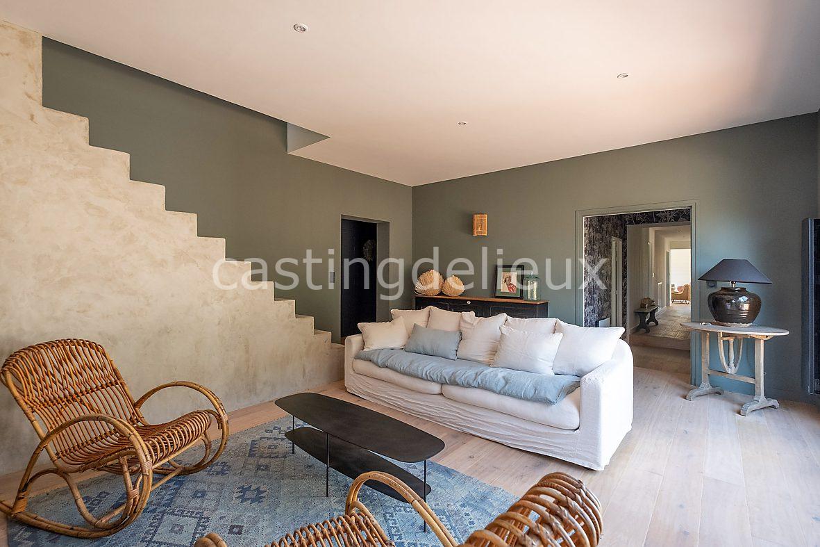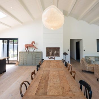 cuisine ouverte, verrière / patio, cheminée, hauteur sous plafond, parquet, murs peints / tapisseries
