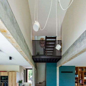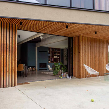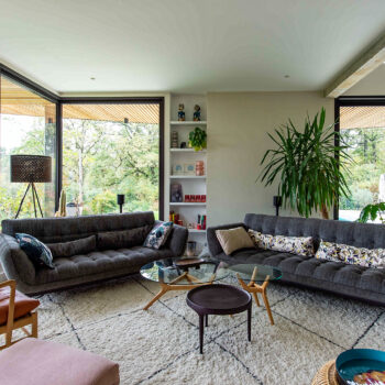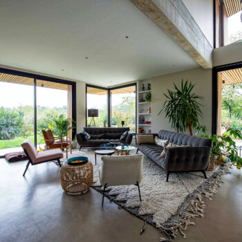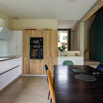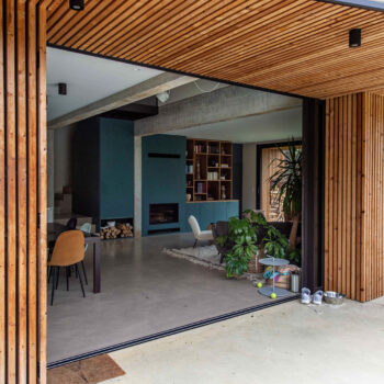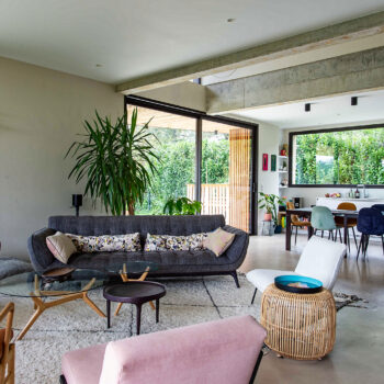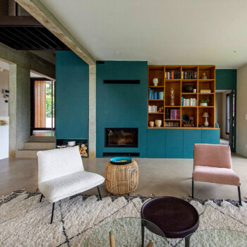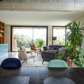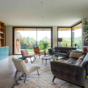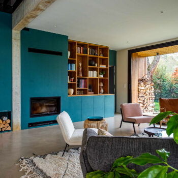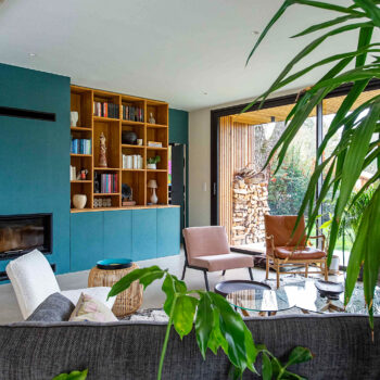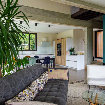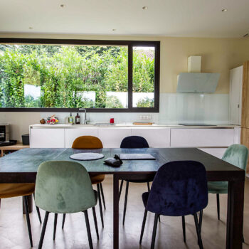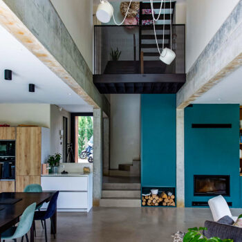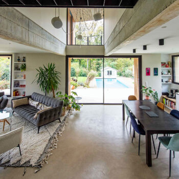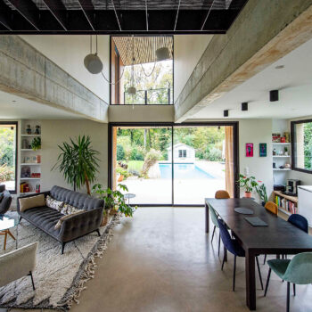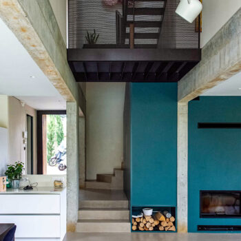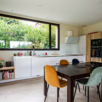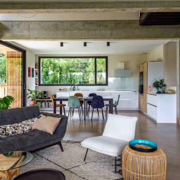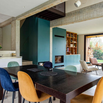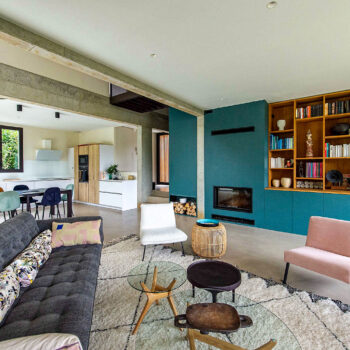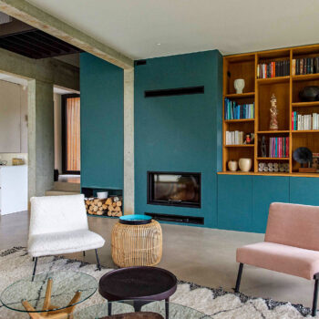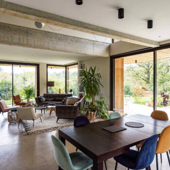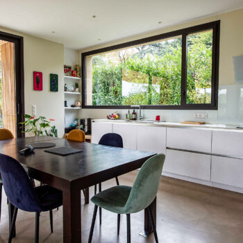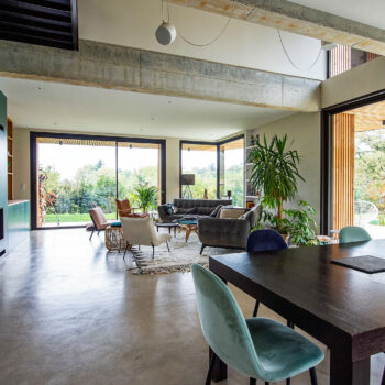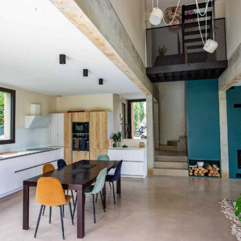 cheminée, cuisine ouverte, baie vitrée, sol béton