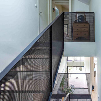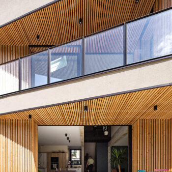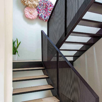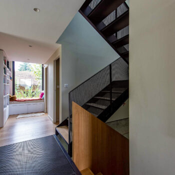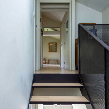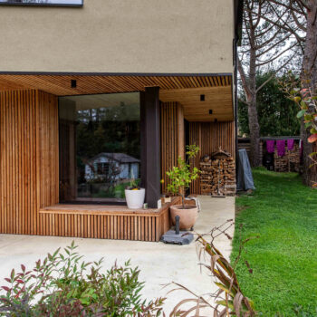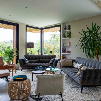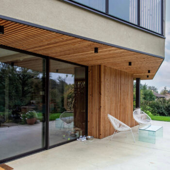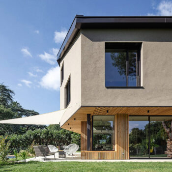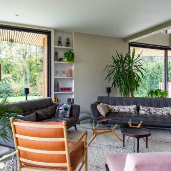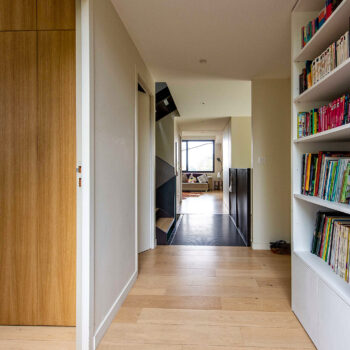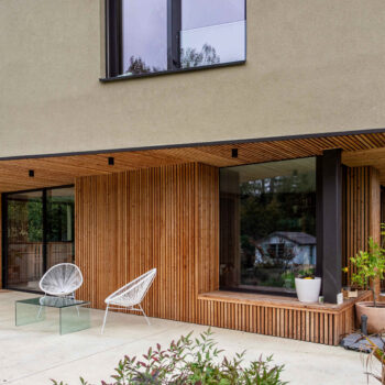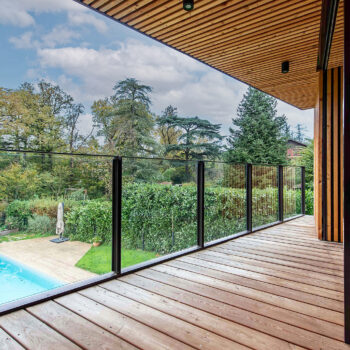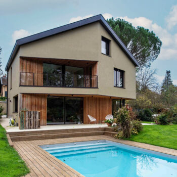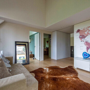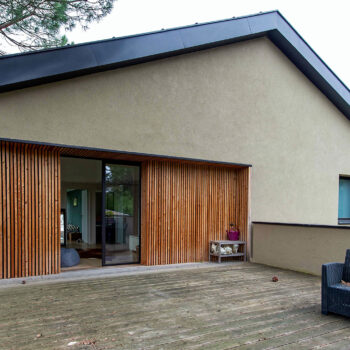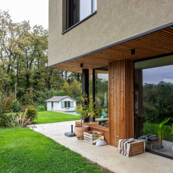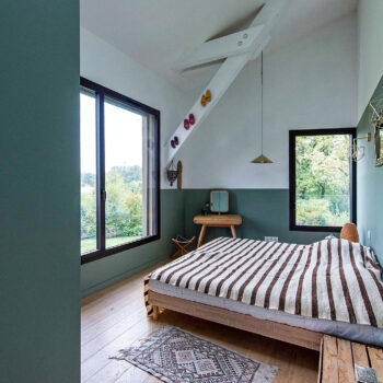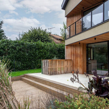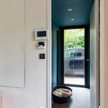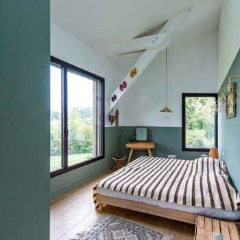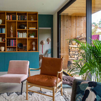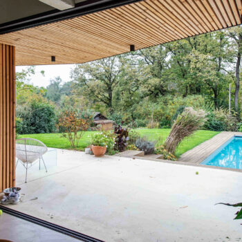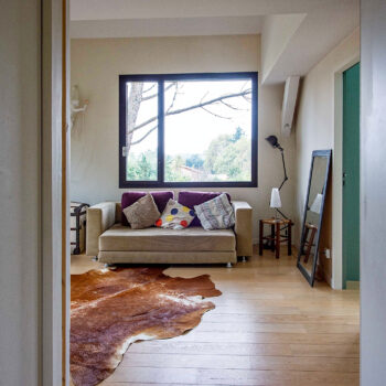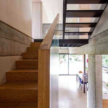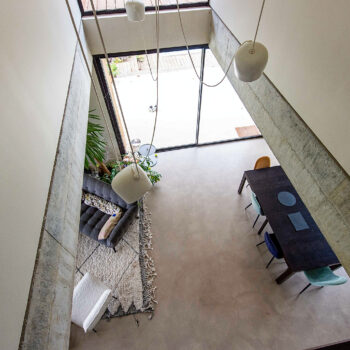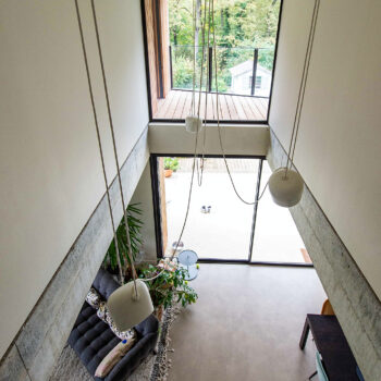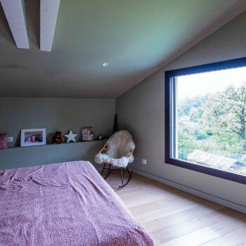 cheminée, cuisine ouverte, baie vitrée, sol béton