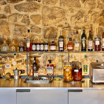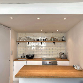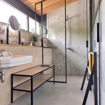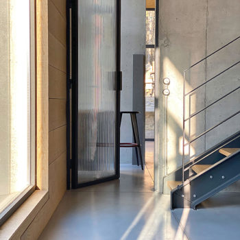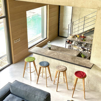 sol béton, baie vitrée, cuisine ouverte, verrière / patio, hauteur sous plafond, carrelage/tomettes