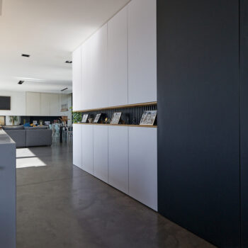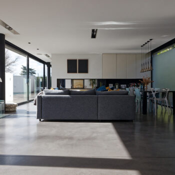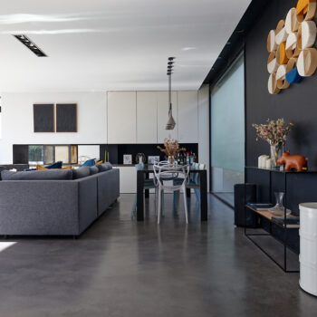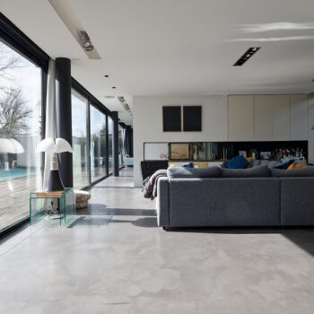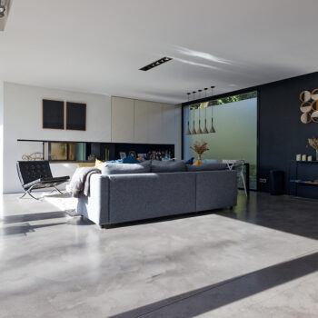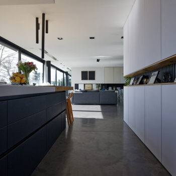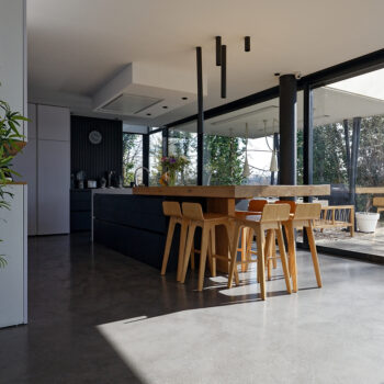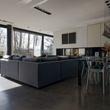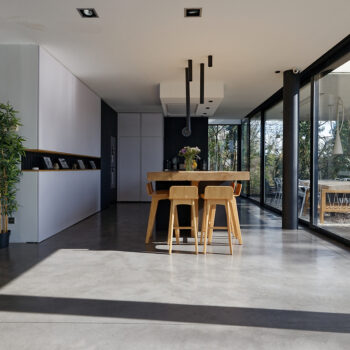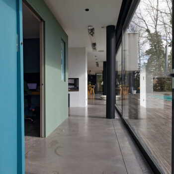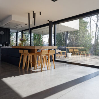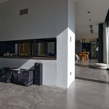 murs peints / tapisseries, cheminée, cuisine ouverte, baie vitrée, sol béton