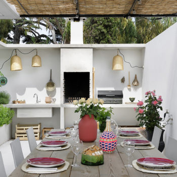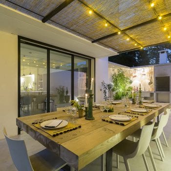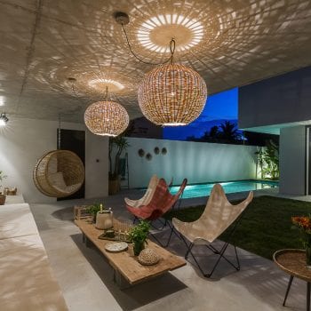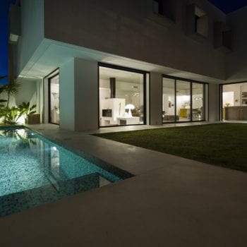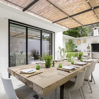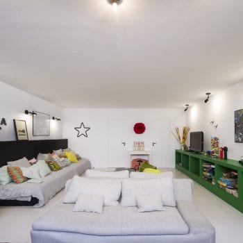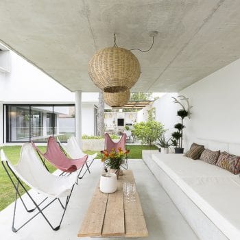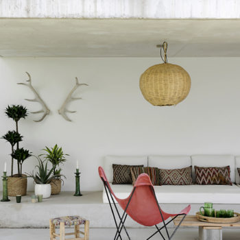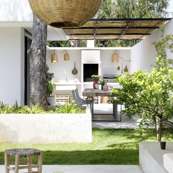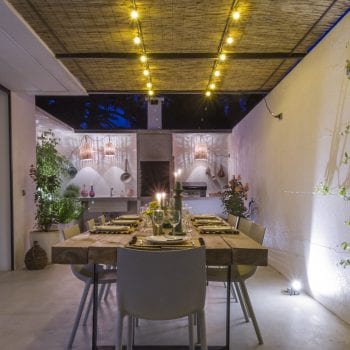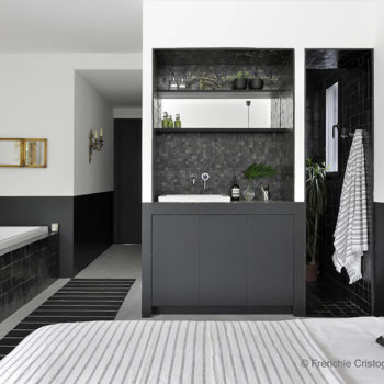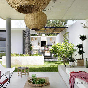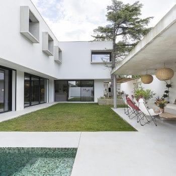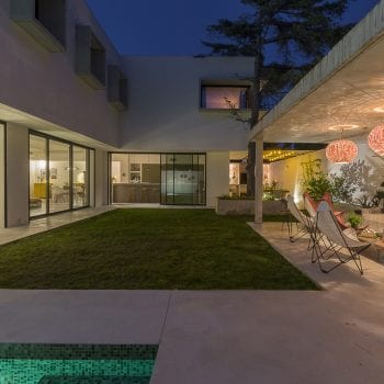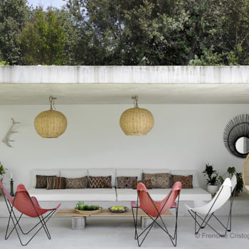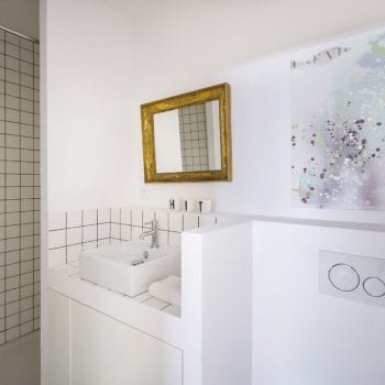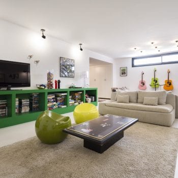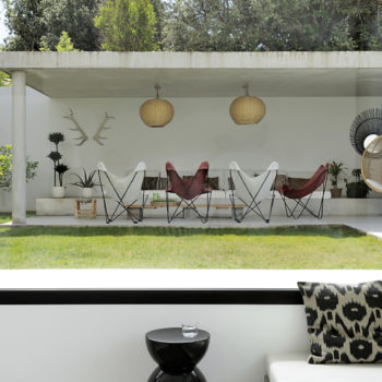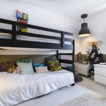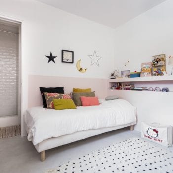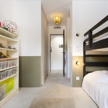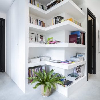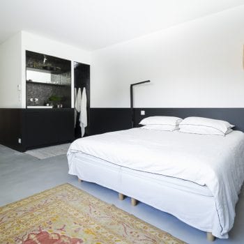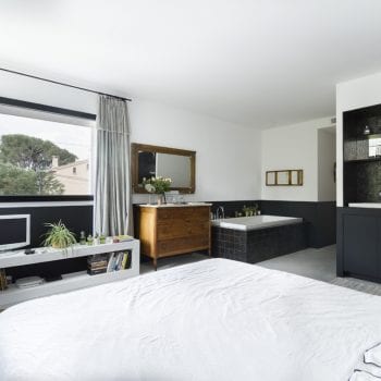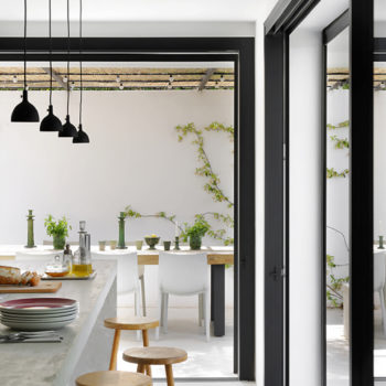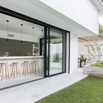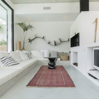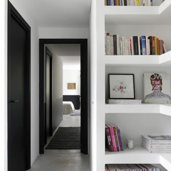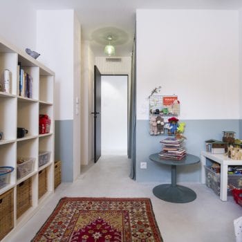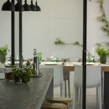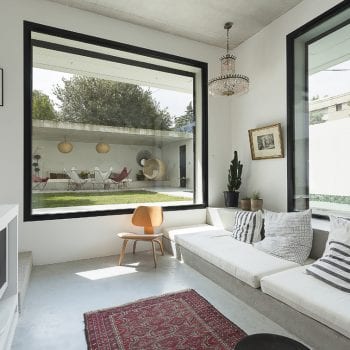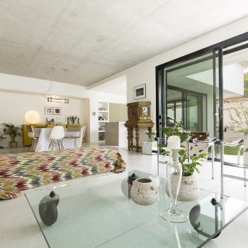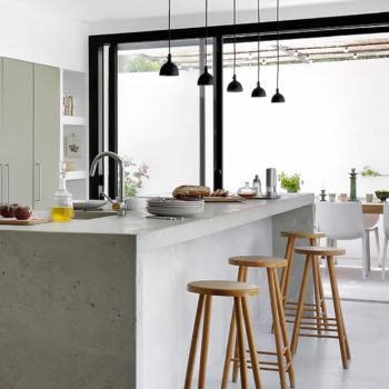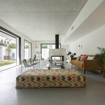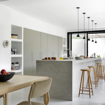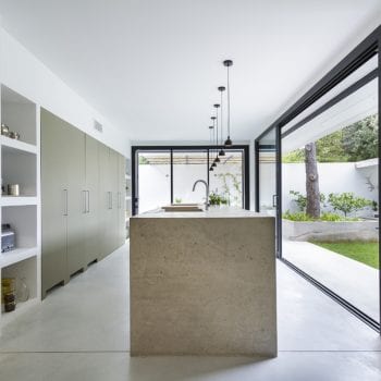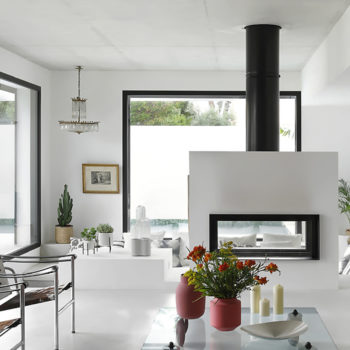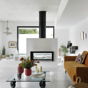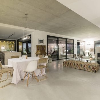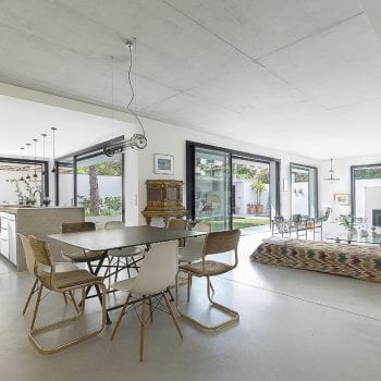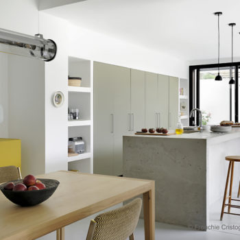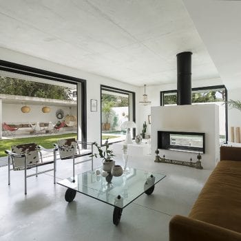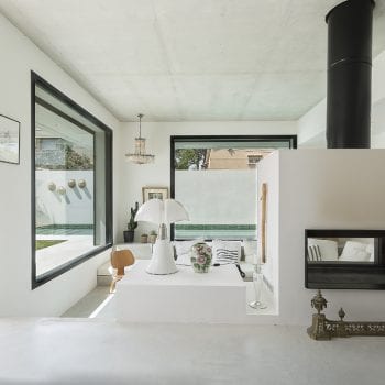 murs peints / tapisseries, cheminée, cuisine ouverte, baie vitrée, sol béton