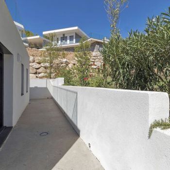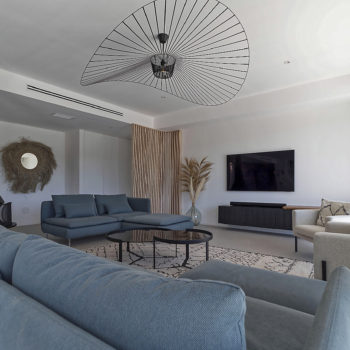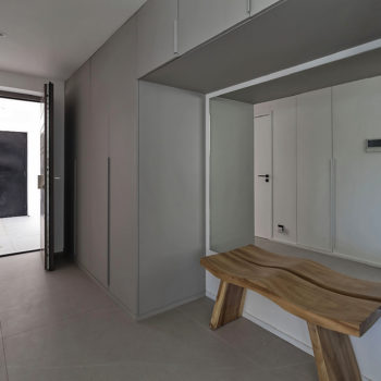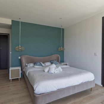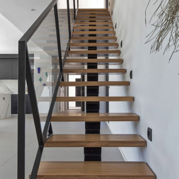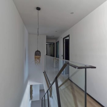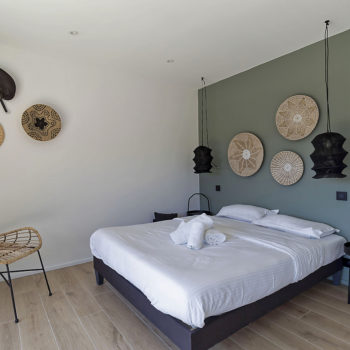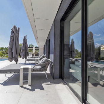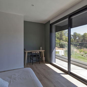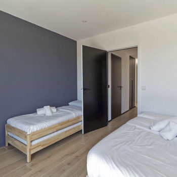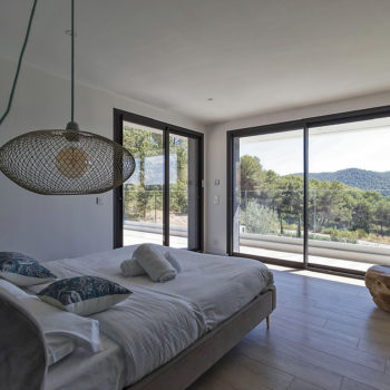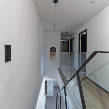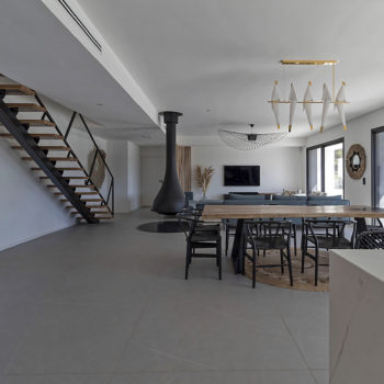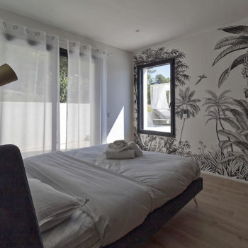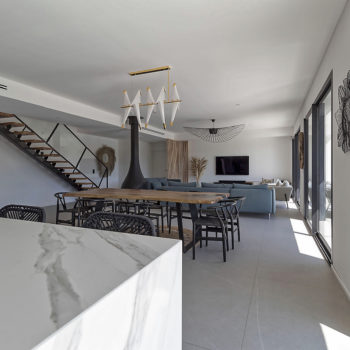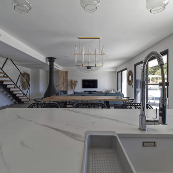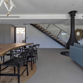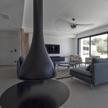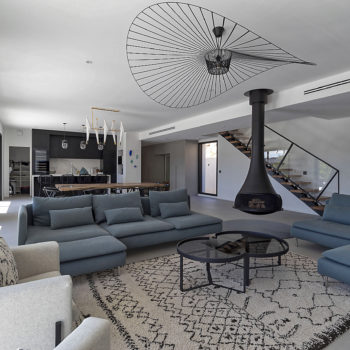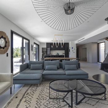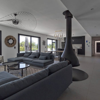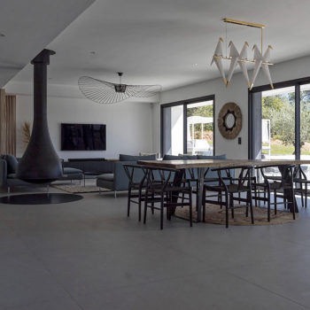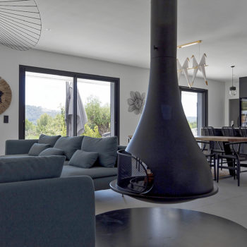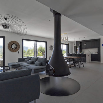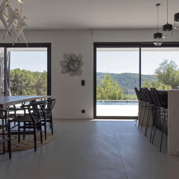 sol béton, baie vitrée, cuisine ouverte, cheminée, parquet, murs peints / tapisseries