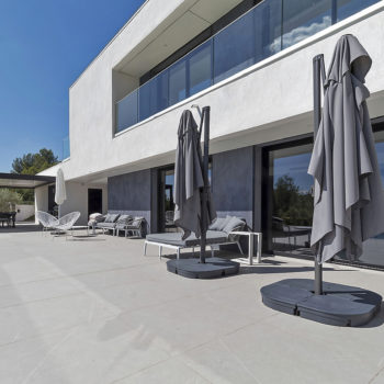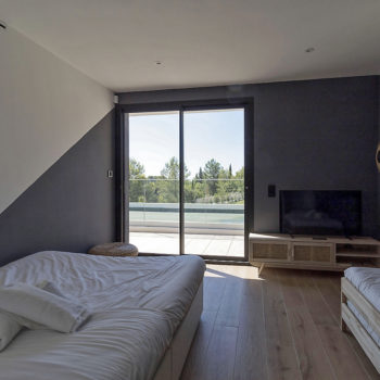 sol béton, baie vitrée, cuisine ouverte, cheminée, parquet, murs peints / tapisseries