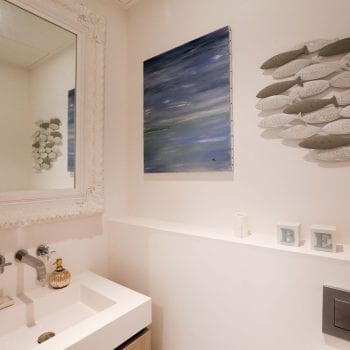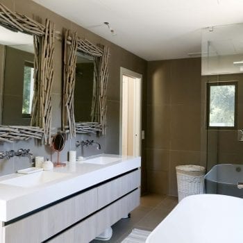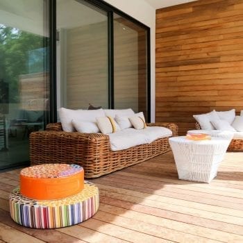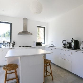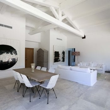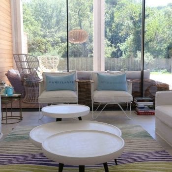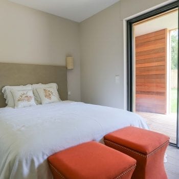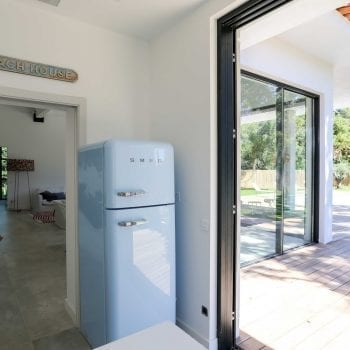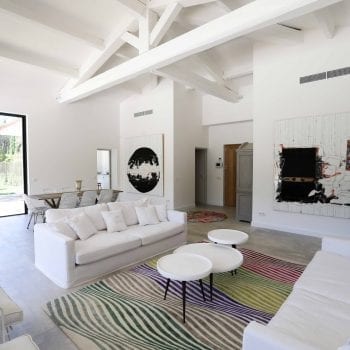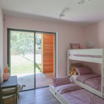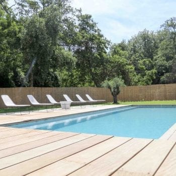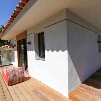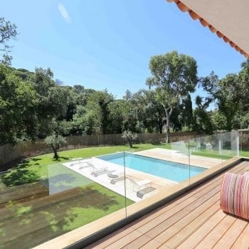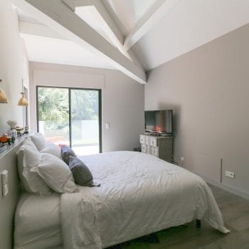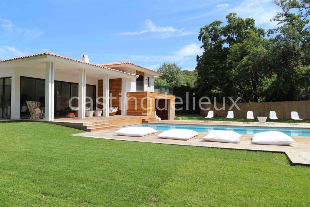 Maison contemporaine dans la pinède. A l’intérieur une grande pièce de vie avec grande hauteur sous plafond, une décoration et du mobilier contemporain, de beaux matériaux, de larges ouvertures, des chambres claires et spacieuses. A l’extérieur, une façade claire, un jardin verdoyant avec une piscine entourée d’une terrasse en bois, un auvent.
