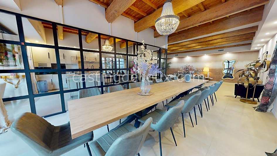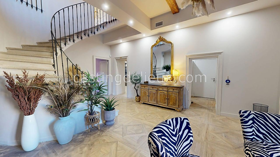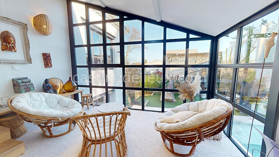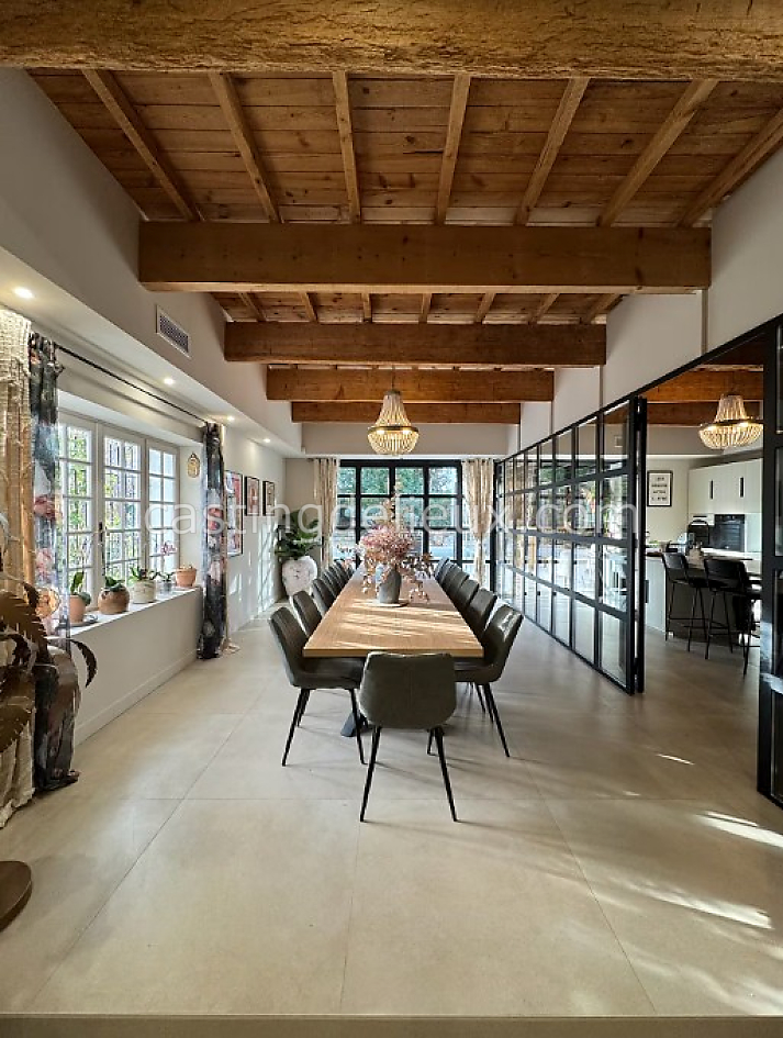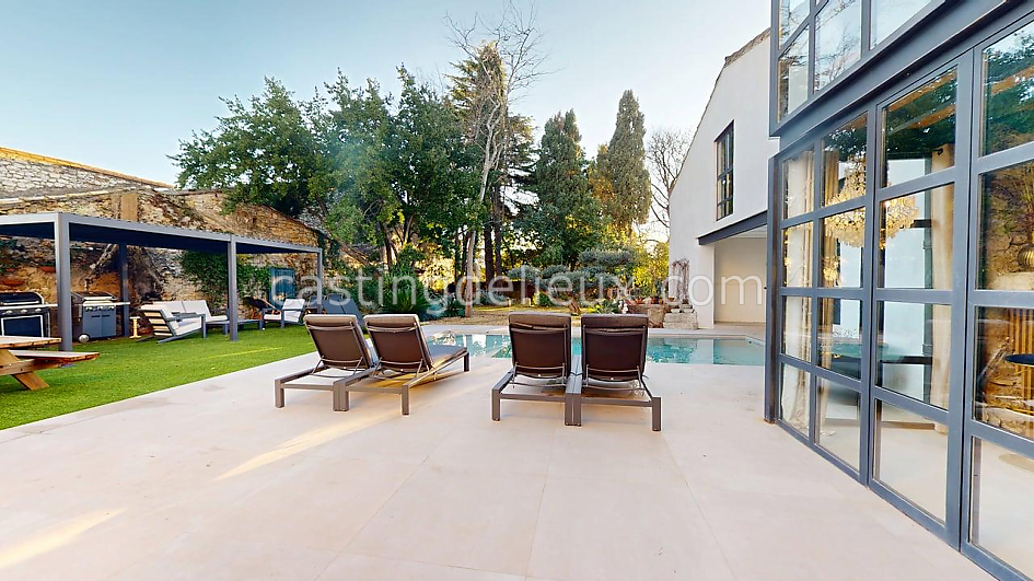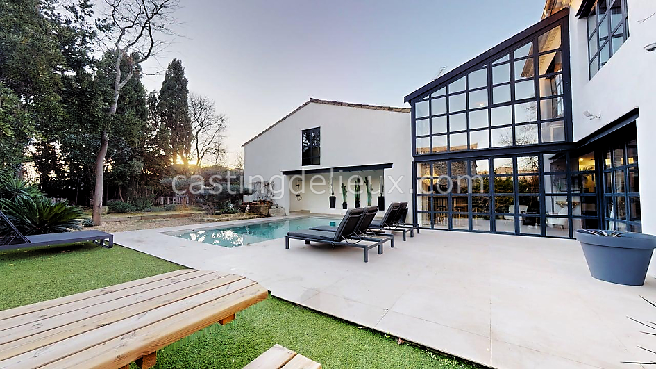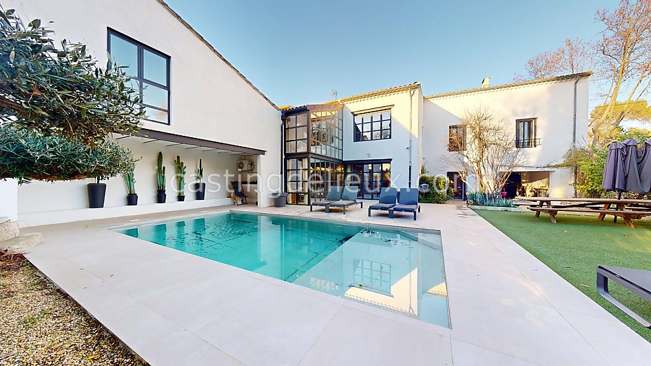 Grande maison rénovée alliant éléments anciens et design contemporain, avec beaux volumes, lumière naturelle et extérieurs arborés, située à proximité de Montpellier.