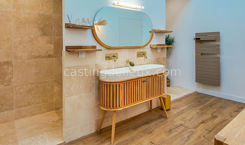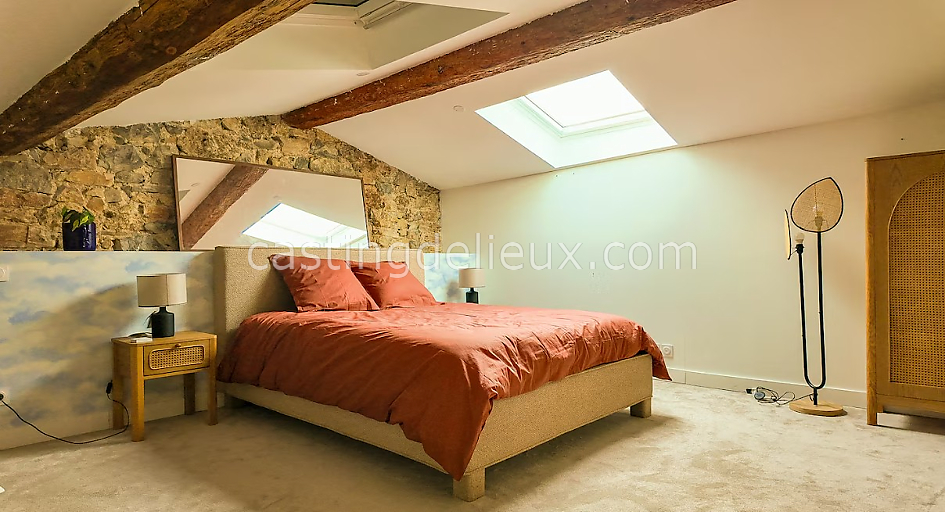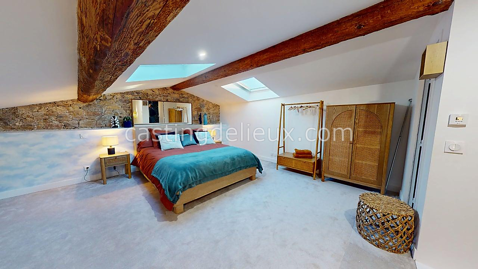 Chambre 6: R+2, suite sous les toits; 1 lit double 160×200 + 1 convertible 160×200. Salle de bain privative avec douche & WC.
