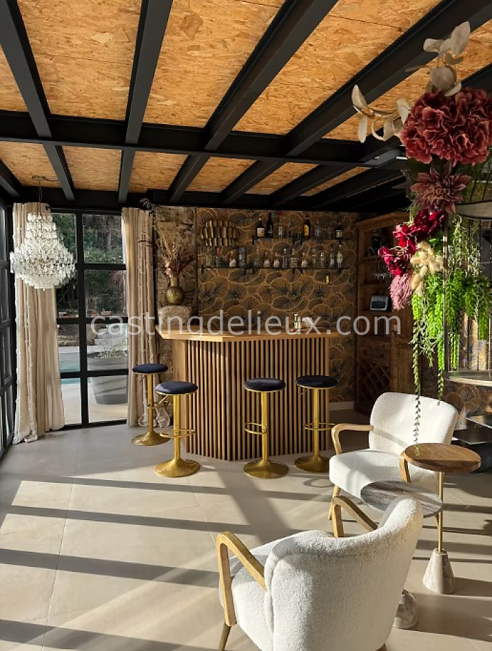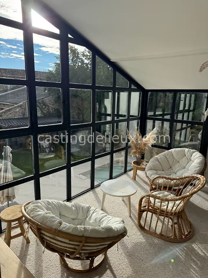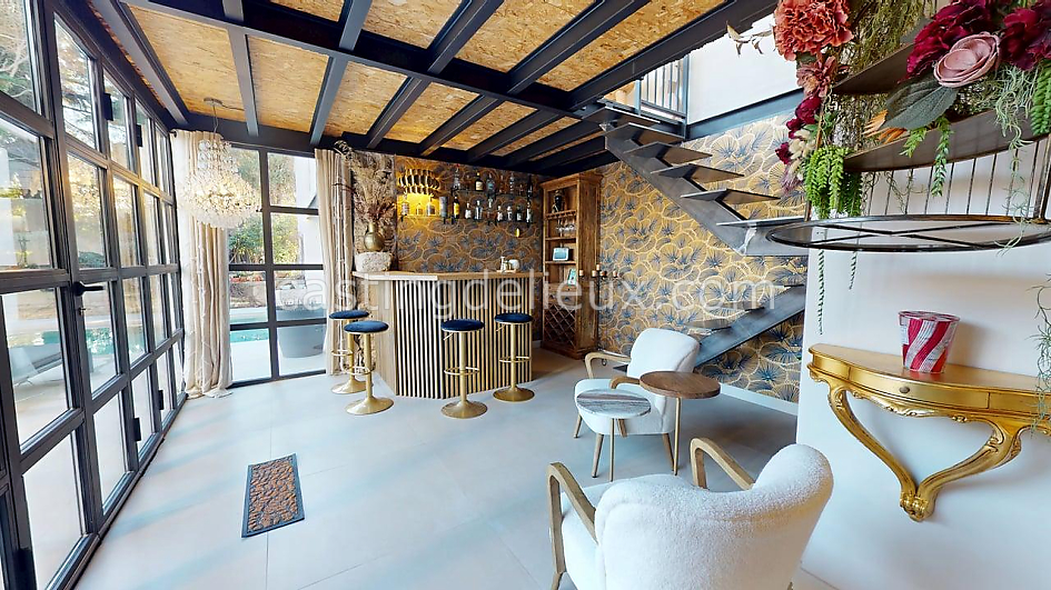 | Ambiance intérieure | Bar, Buanderie, Déco tendances actuelles, Grande hauteur sous plafond, Verrière / baie vitrée, Pierre apparente, Sol bois / parquet, Tomettes / carrelage ancien, Cheminée, Escalier remarquable, Charpente / poutres apparente, Déco contemporaine, Ambiance design |
