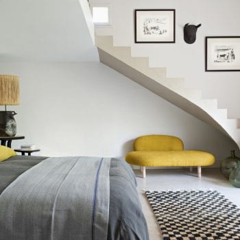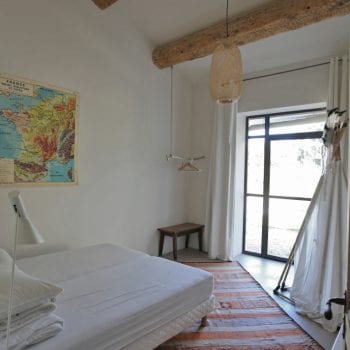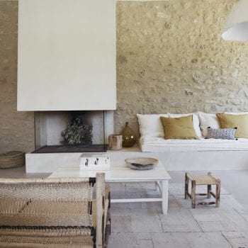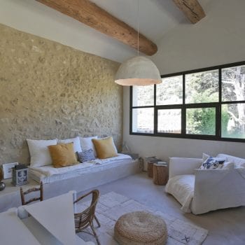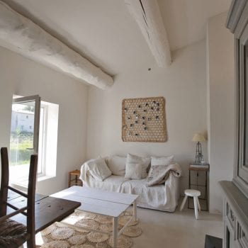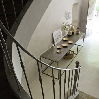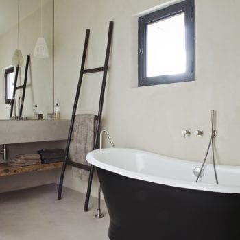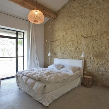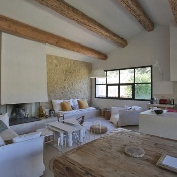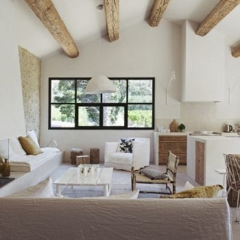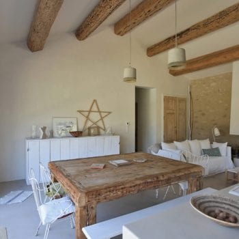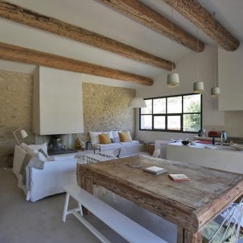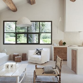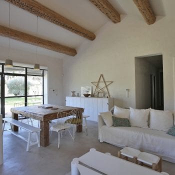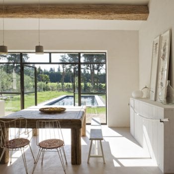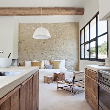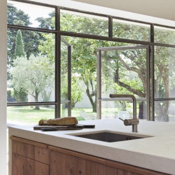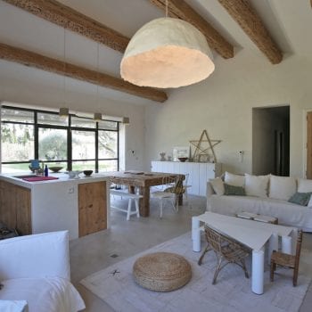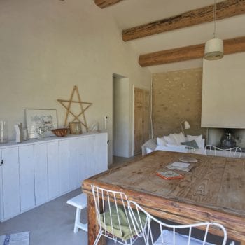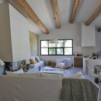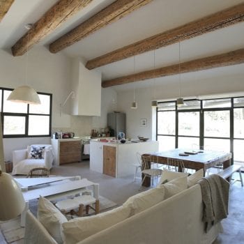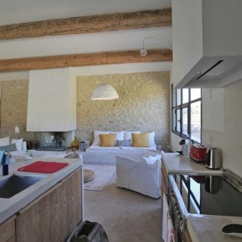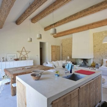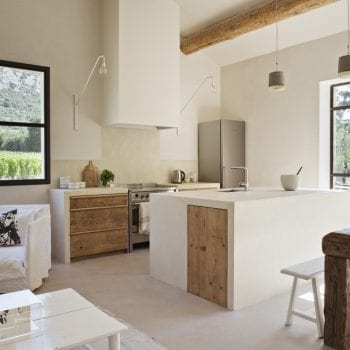carrelage/tomettes, cuisine ouverte, baie vitrée, sol béton