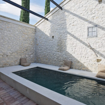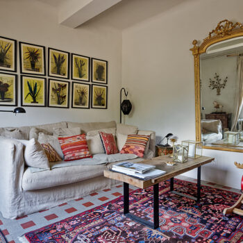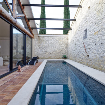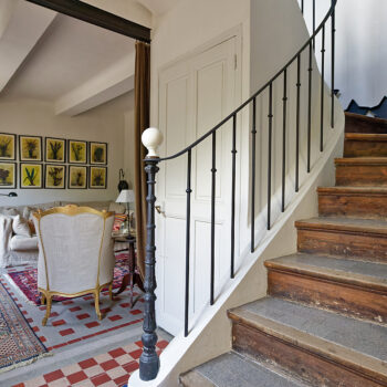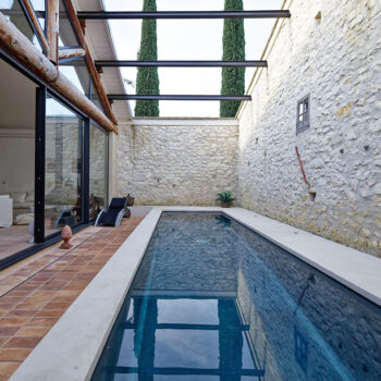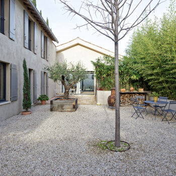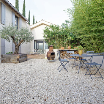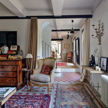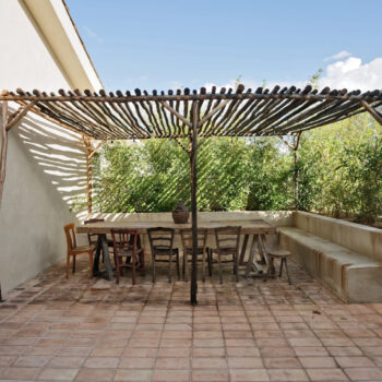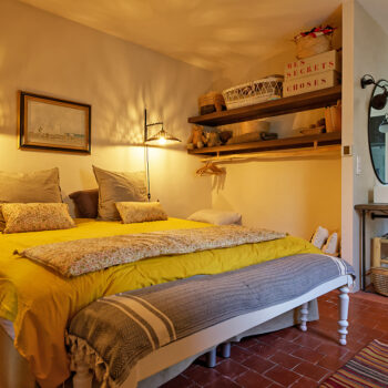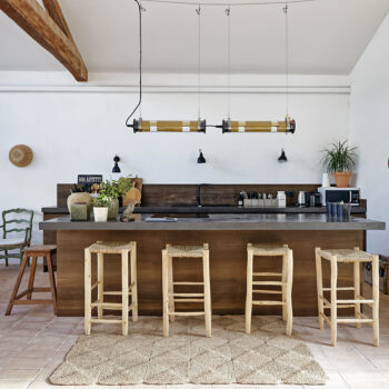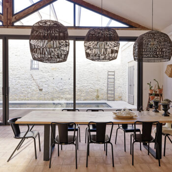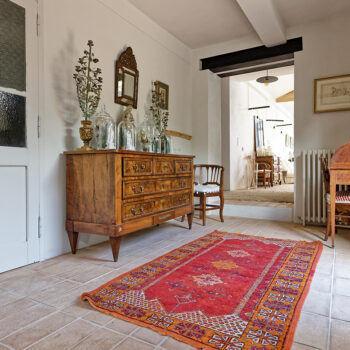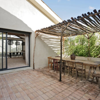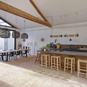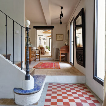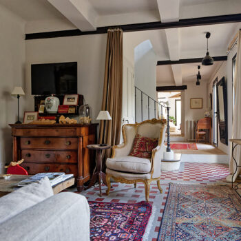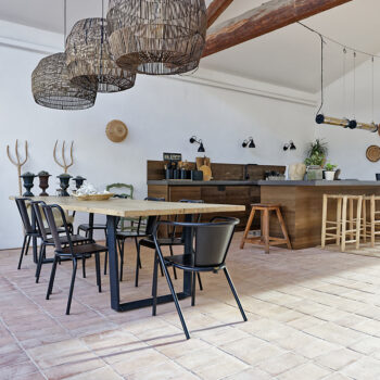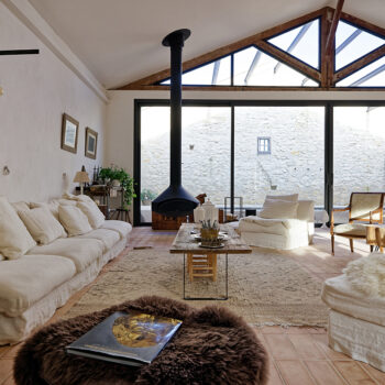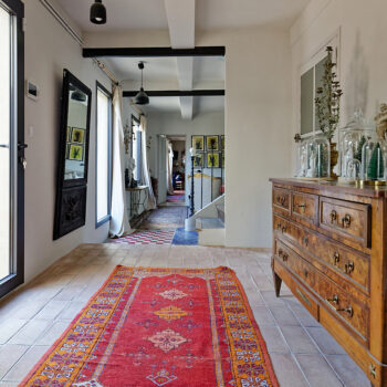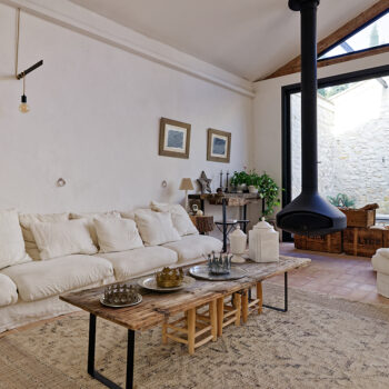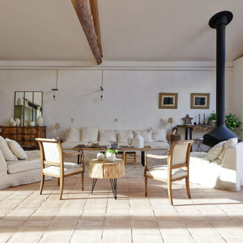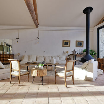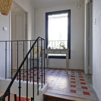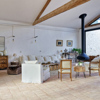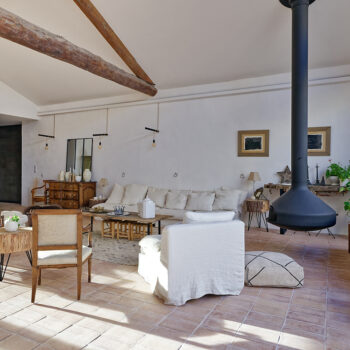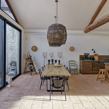 carrelage/tomettes, hauteur sous plafond, cheminée, cuisine ouverte, baie vitrée