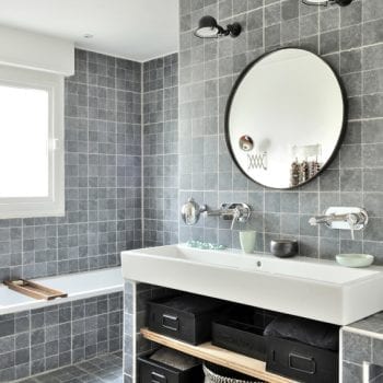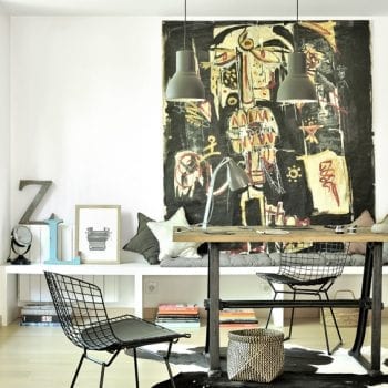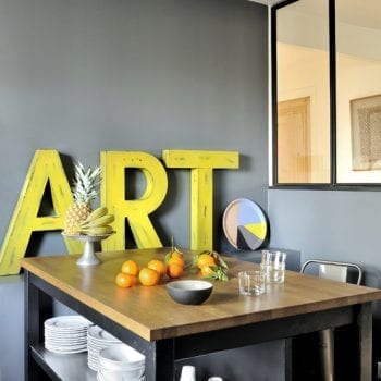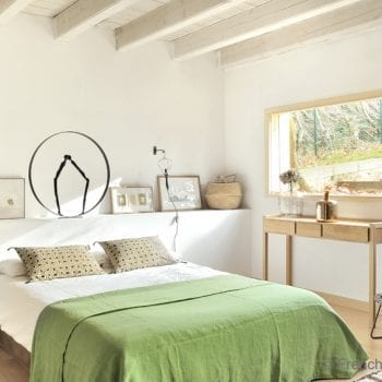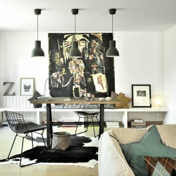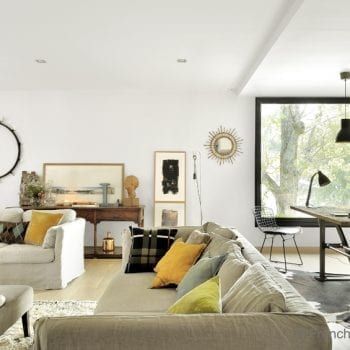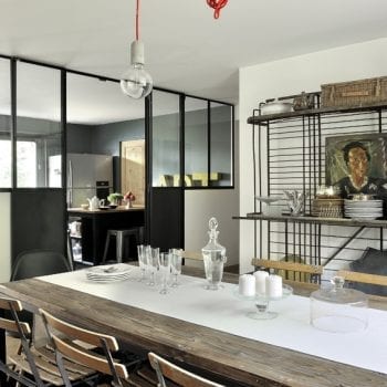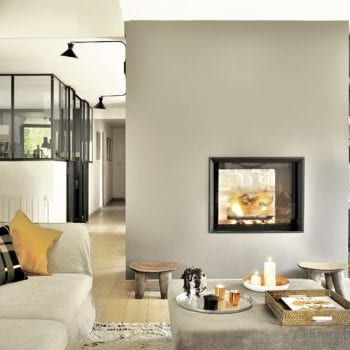 Maison contemporaine dans la plaine du Forez. A l’intérieur des pièces lumineuses, murs blancs , sol clair, mobilier design.