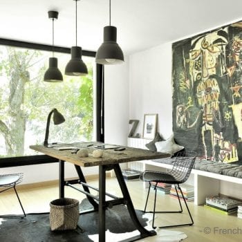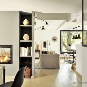 Contemporary house in the plain of Forez. Inside bright rooms, white walls, light floor, design furniture.