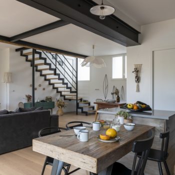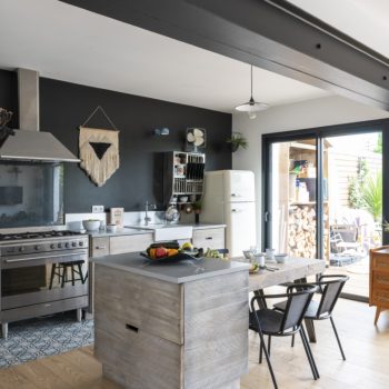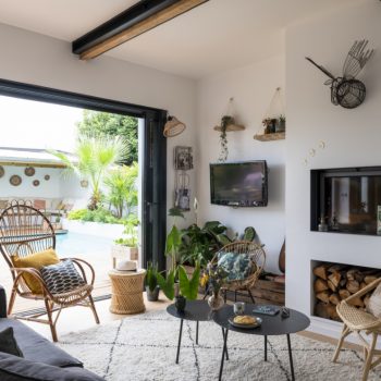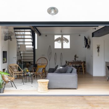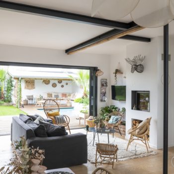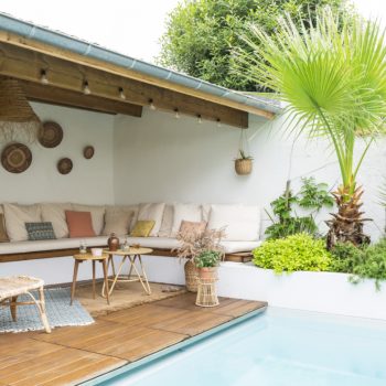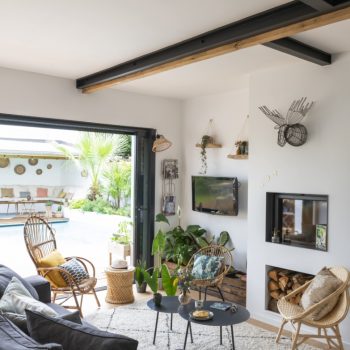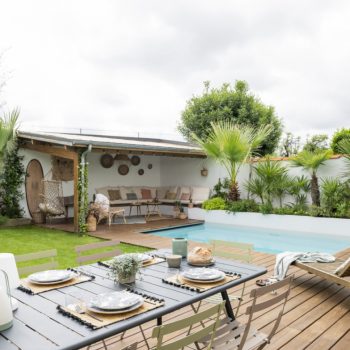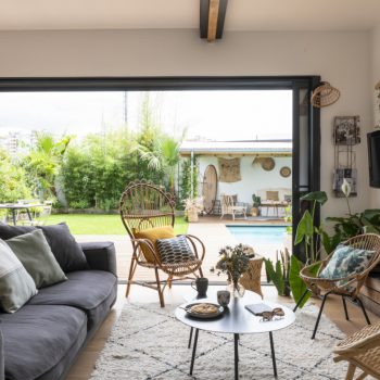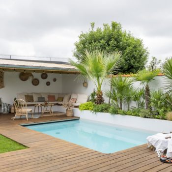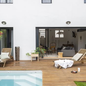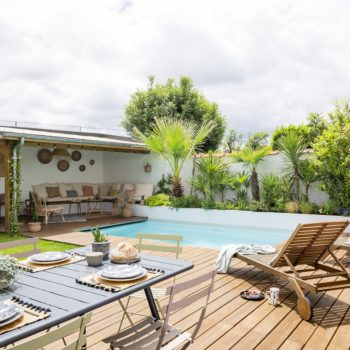 Echoppe bordelaise rénovée. L’intérieur, une décoration soignée et du mobilier vintage, des murs de couleurs et papiers peints. la cuisine ouverte, donne sur une grande pièce à vivre. L’extérieur est accessible par de grandes baies vitrées. La piscine est entourée d’une terrasse en bois et bénéficie d’une extension couverte.