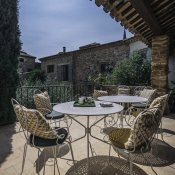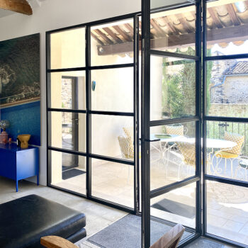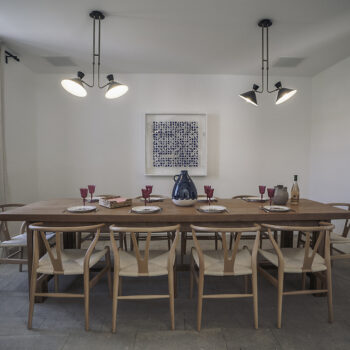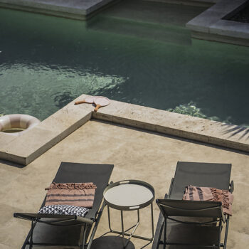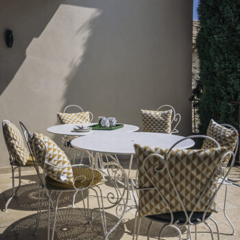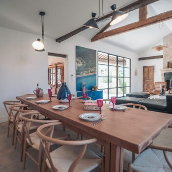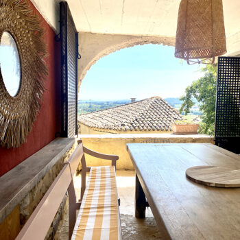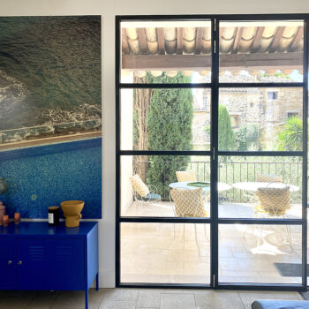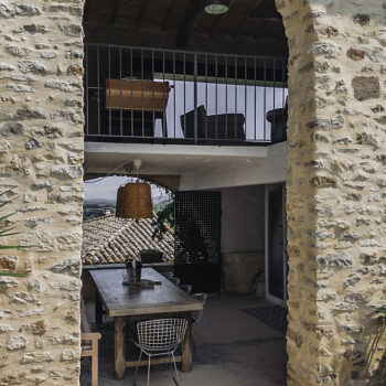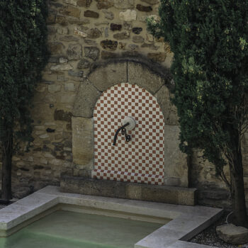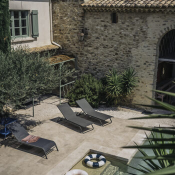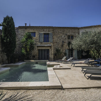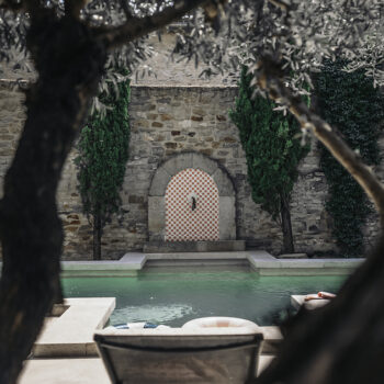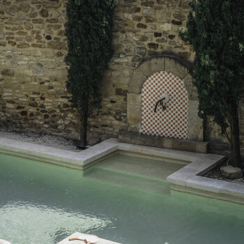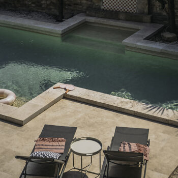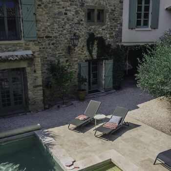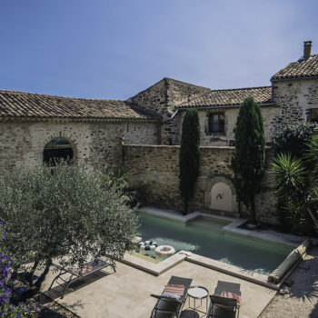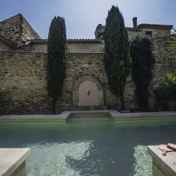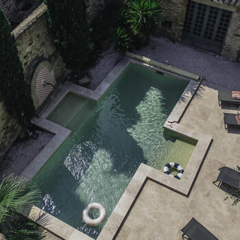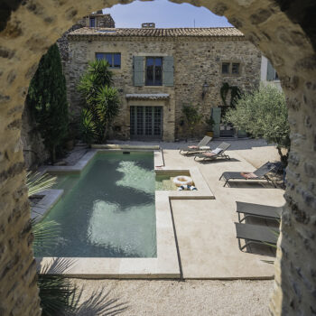 Au cœur de la propriété, la cour intérieure abrite une piscine aux allures de bassin provençal, bordée d’une végétation méditerranéenne. Une cuisine d’été, aménagée sous la grande arche.
